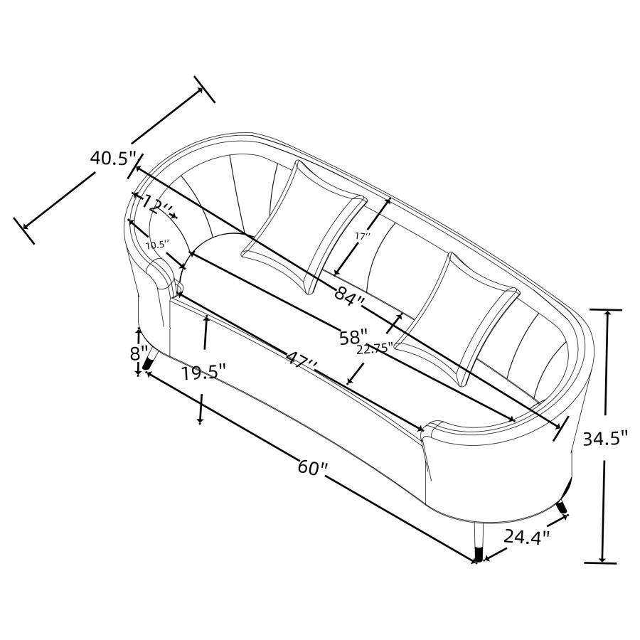 Show off your curve appeal with this updated kidney silhouette that blends fresh appeal and timeless elegance in a modern loveseat. This great piece, featuring soft, neutral beige upholstery, is perfect to float in the center of a room as an attractive focal point. The loveseat's curvy profile is complete with a rounded back and arms with a sloping design, framed by extra wide channel details, lending a sense of sophistication in a den or living room. A pair of premium filled accent pillows featuring a wide corduroy stripe and plum textured boucle offer impeccable comfort for lounging. The loveseat stands on stylish tapered black powder coated metal legs, providing a lovely hint of vintage character and airy height.