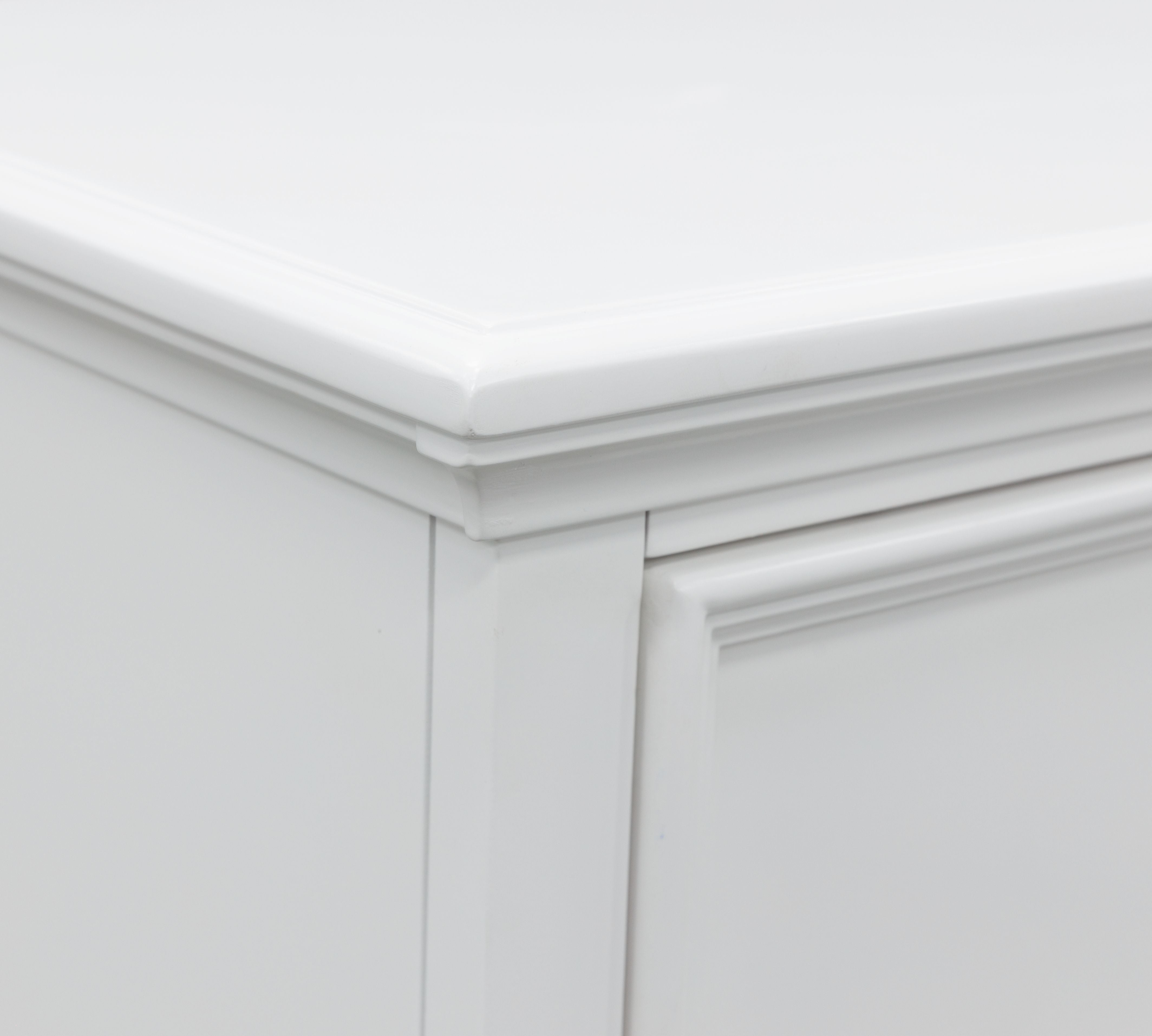 Exuding a timeless casual design, this chest of drawers is ready to define your personal space. It easily adapts to a variety of interiors, combining a clean, contemporary white finish with framed drawer fronts and round metal knobs. Featuring five storage drawers with dovetail construction and traditional tapered feet, this piece is sure to bring elegant simplicity to your bedroom.