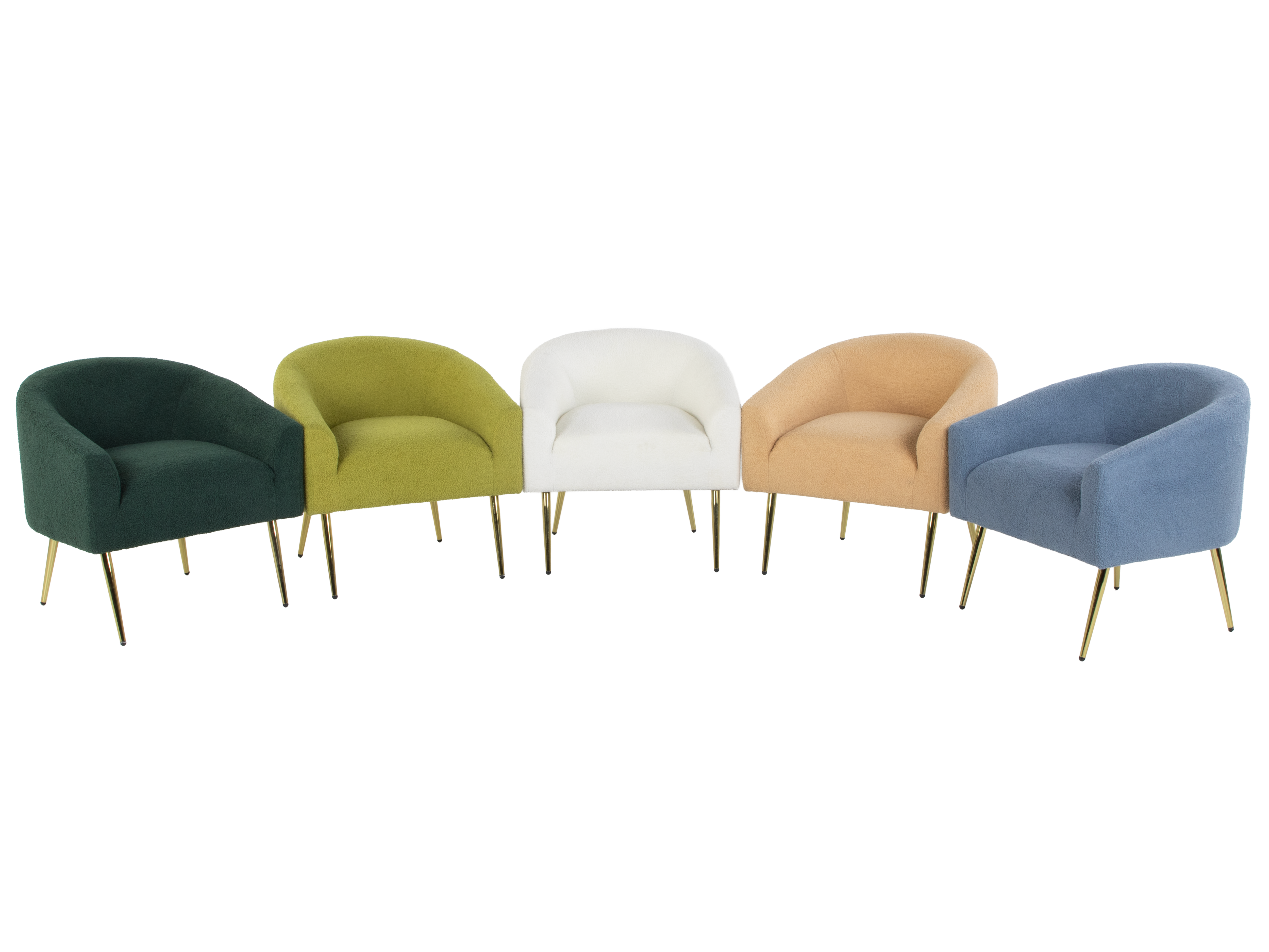 Add a splash of serene color to your home with this Blue Boucle Accent Chair. The cozy boucle upholstery in a soft blue shade and the elegant gold metal legs offer a perfect blend of comfort and modern style. This barrel chair is great for reading nooks, bedrooms, or as an eye-catching accent in your living room.