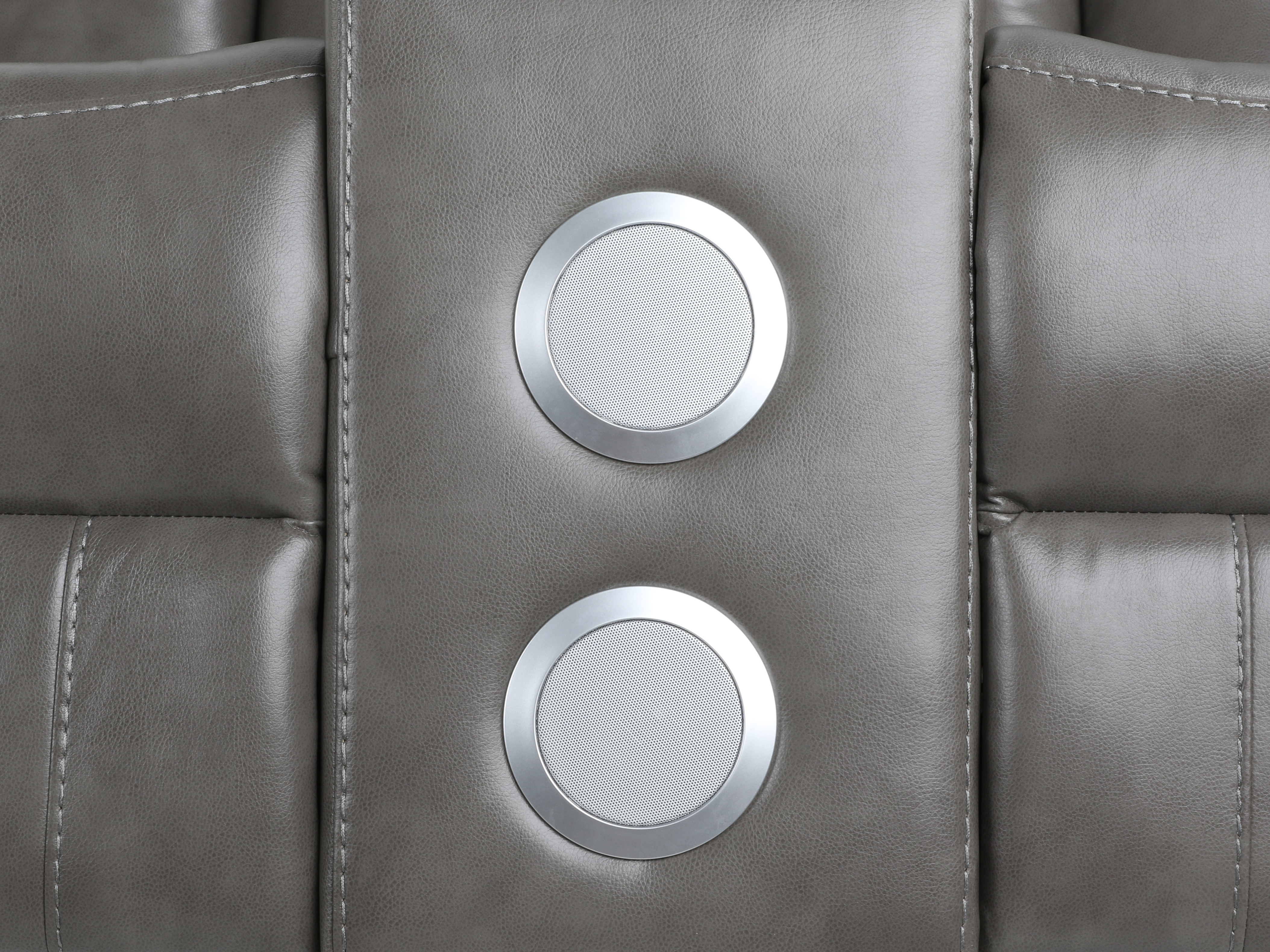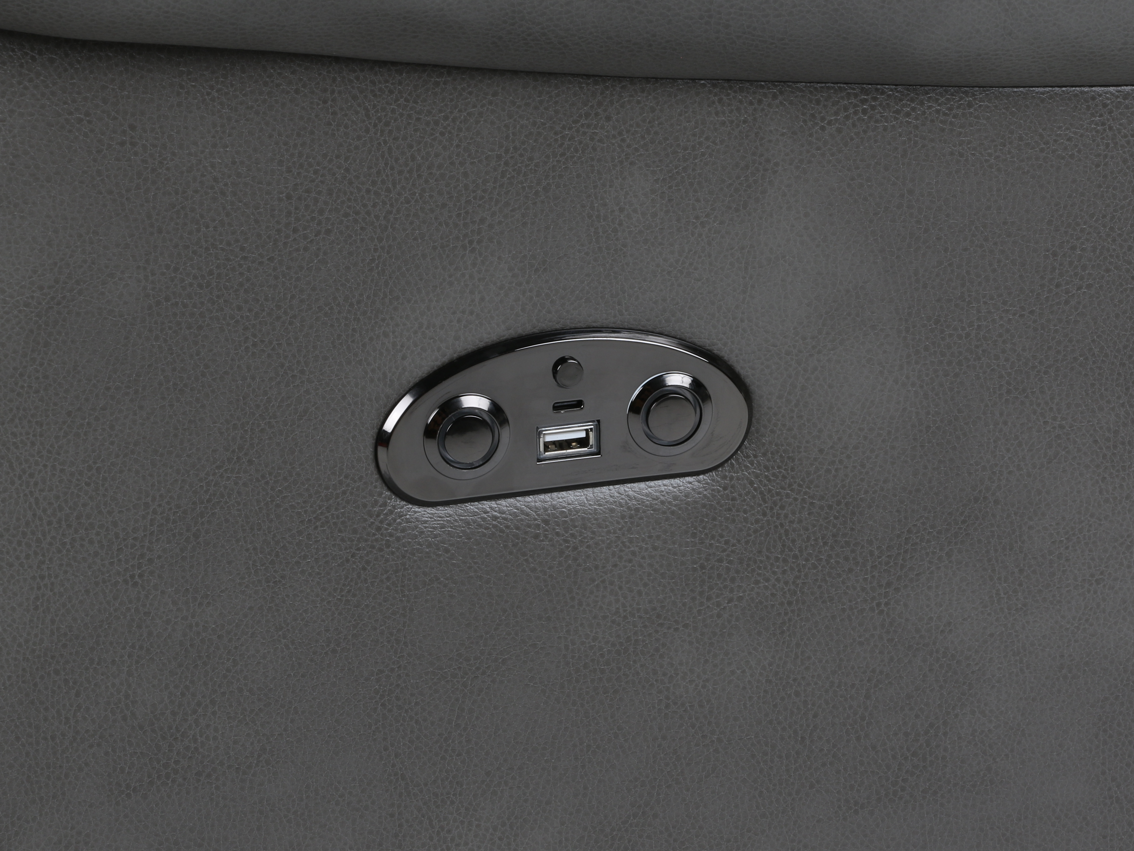 The 3-piece Power Reclining Sectional boasts a sleek grey faux leather design with pillow armrests for ultimate comfort. On the left arm-facing side, the sofa features a convenient drop-down table, LED light, and 2 cup holders. In the center, you'll find the corner piece. On the right arm-facing side, a loveseat with power reclining, LED light, console, and Bluetooth speaker for an immersive experience. Transform your living space with this luxurious and functional sectional.