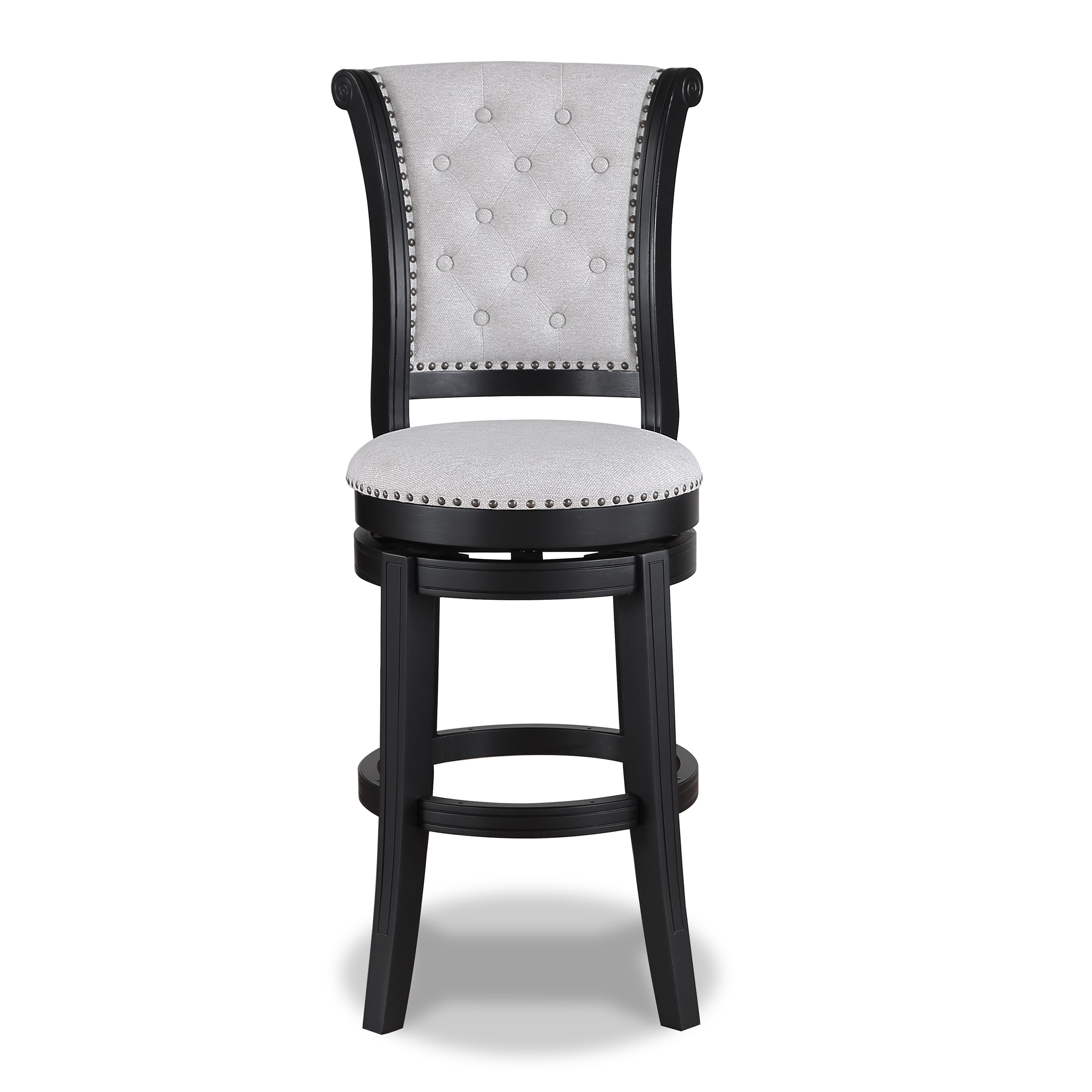 Elevate your home bar or kitchen counter with these luxurious counter-height stools, designed to bring sophistication and comfort to your space. Featuring a gracefully curved backrest with button-tufted upholstery, these stools offer a refined touch of elegance. The nailhead trim detailing enhances the upscale aesthetic, while the rich black-finished frame provides sturdy support and durability. With a smooth swivel function, these stools offer effortless movement and convenience, perfect for social gatherings or everyday use. Whether placed in a modern or traditional setting, these stunning stools blend timeless design with superior comfort for a truly stylish seating experience.. Full height back Button tufted Swivel seat