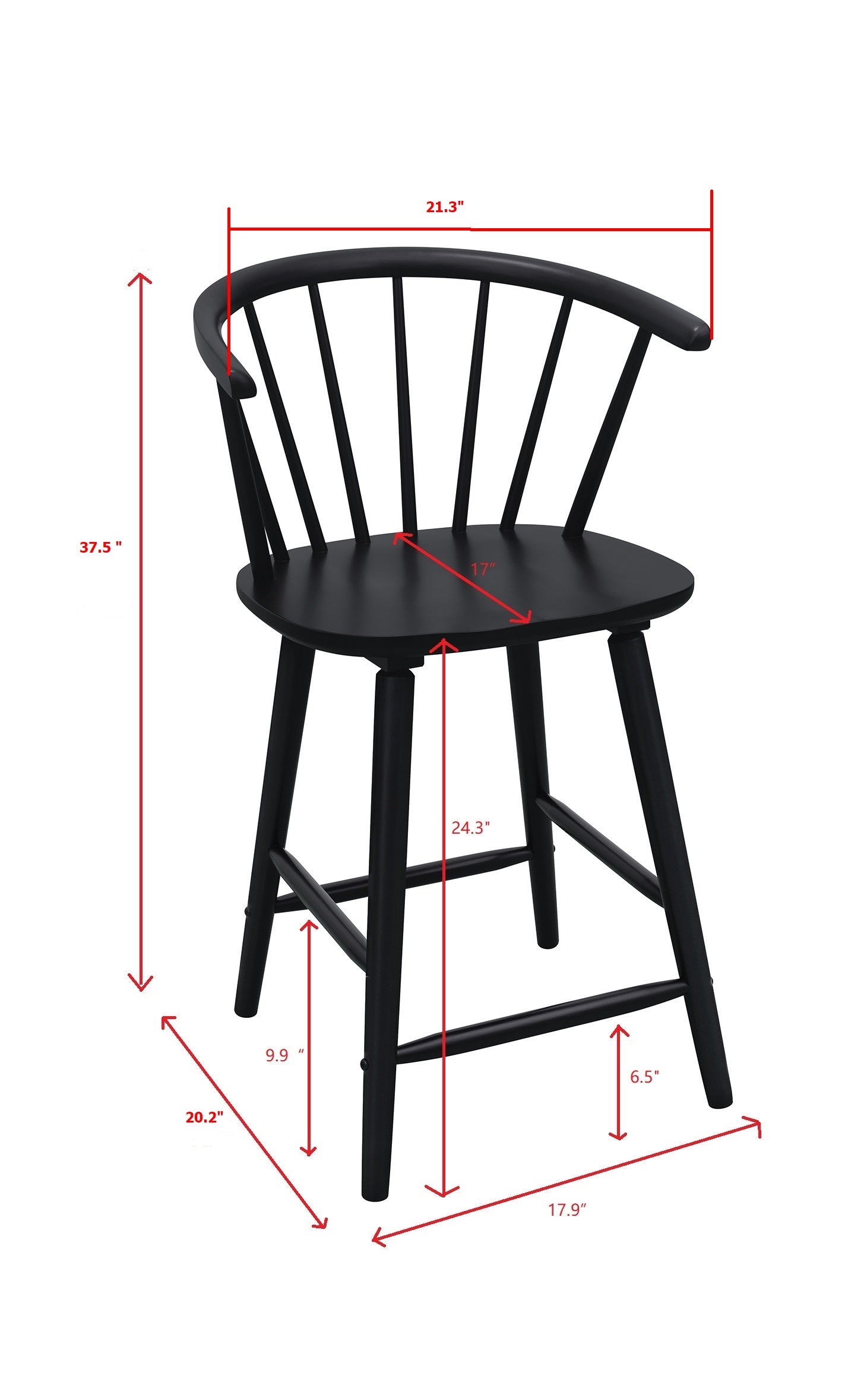 Elevate your space with this sleek and stylish seating solution, designed to blend seamlessly with modern, contemporary, and transitional interiors. Crafted with a sturdy frame and a gracefully curved backrest, this piece offers both durability and ergonomic comfort. The elegant spindle detailing adds a touch of classic charm, while the rich black finish enhances its sophisticated appeal. Perfect for kitchen islands, bars, or high-top tables, this versatile design ensures lasting stability with its well-balanced legs and integrated footrest. Whether you're enjoying a casual breakfast or entertaining guests, this statement piece provides a perfect combination of style, comfort, and functionality.. Solid wood construction Spindle back design Shaped seats