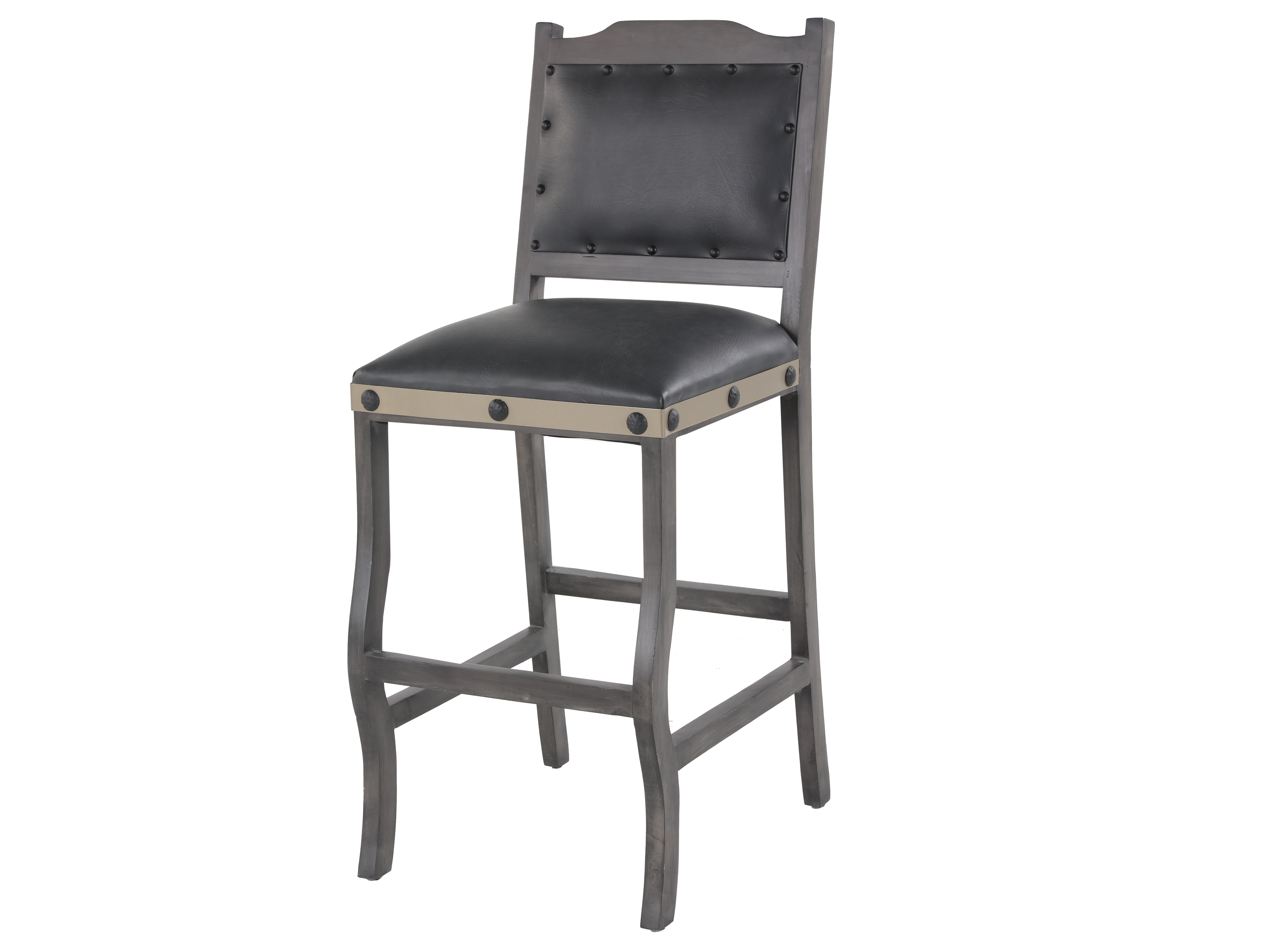 This bar stool works well with rustic, farmhouse, industrial, and transitional interiors thanks to its weathered gray finish, upholstered seating, and decorative accent details.