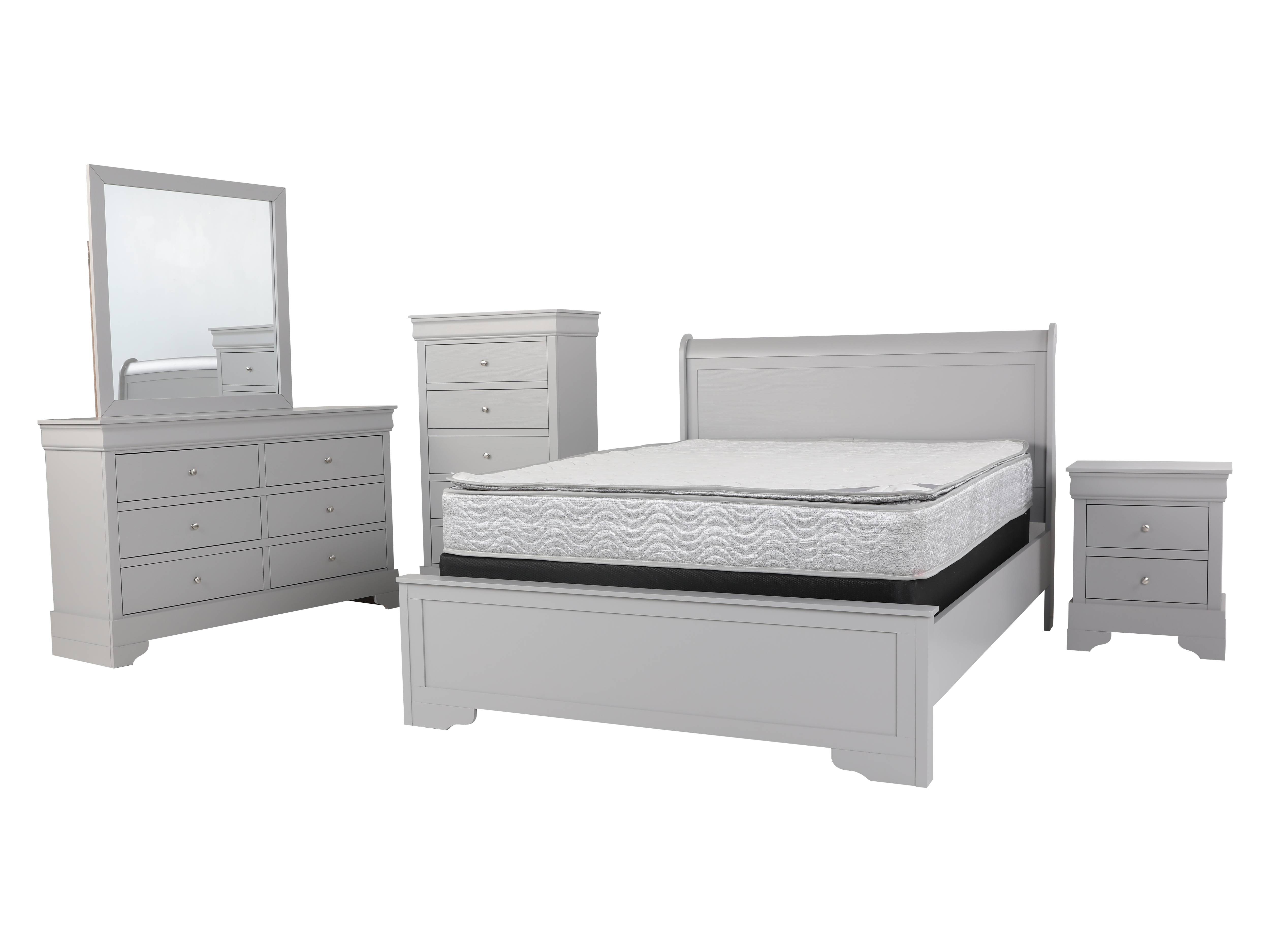 Includes: Full or Twin bed, Dresser, Mirror, Nightstand.