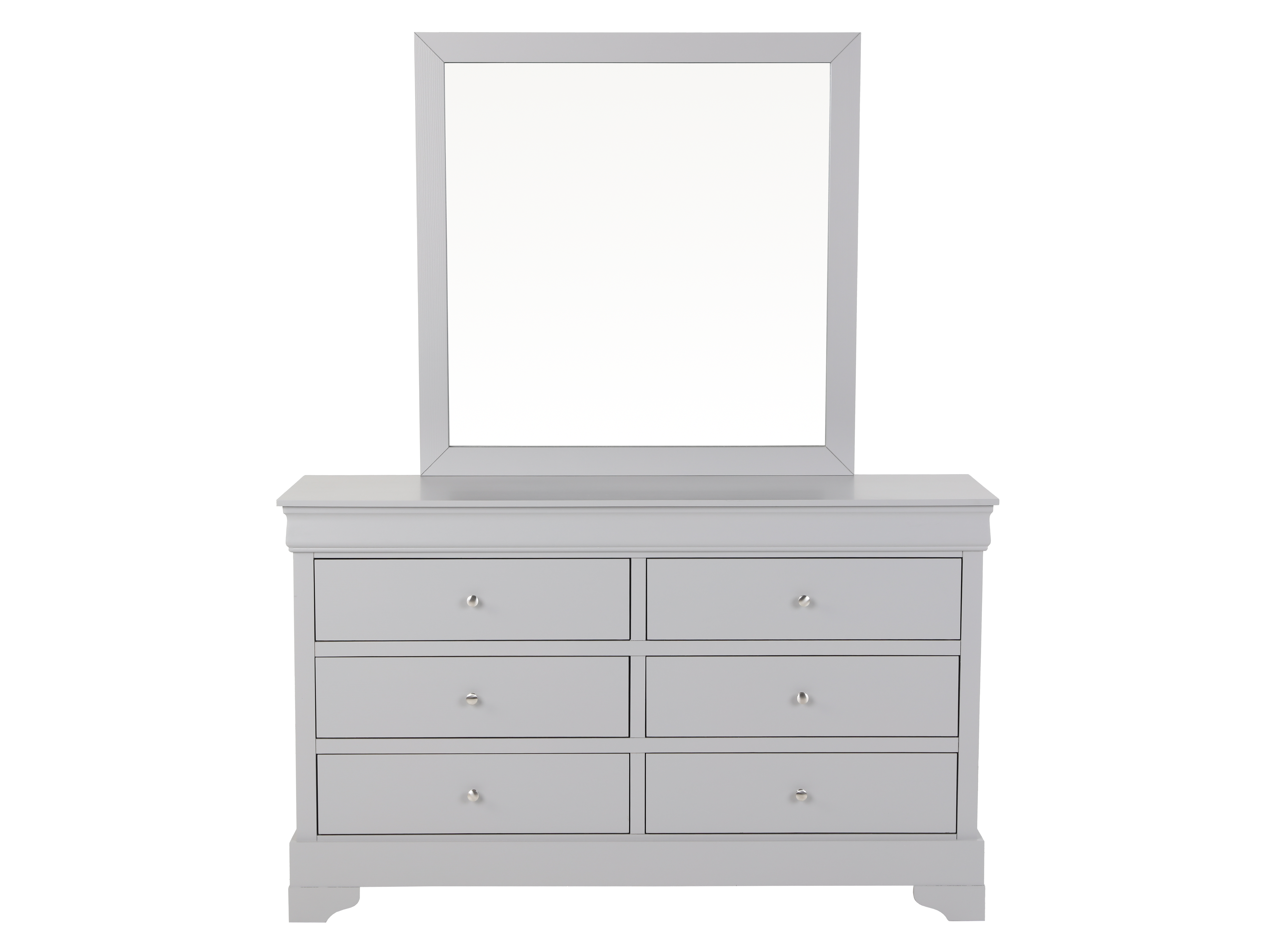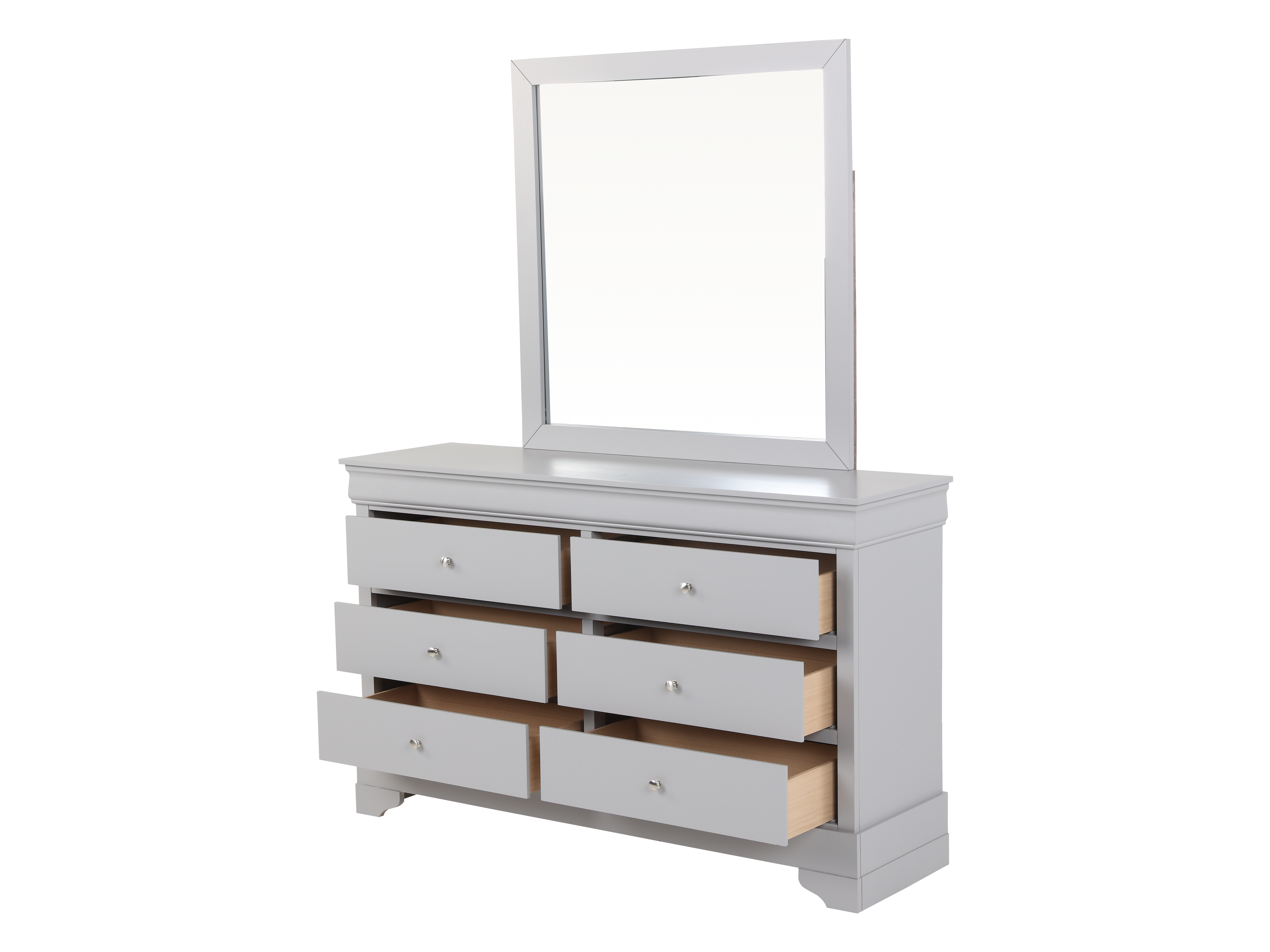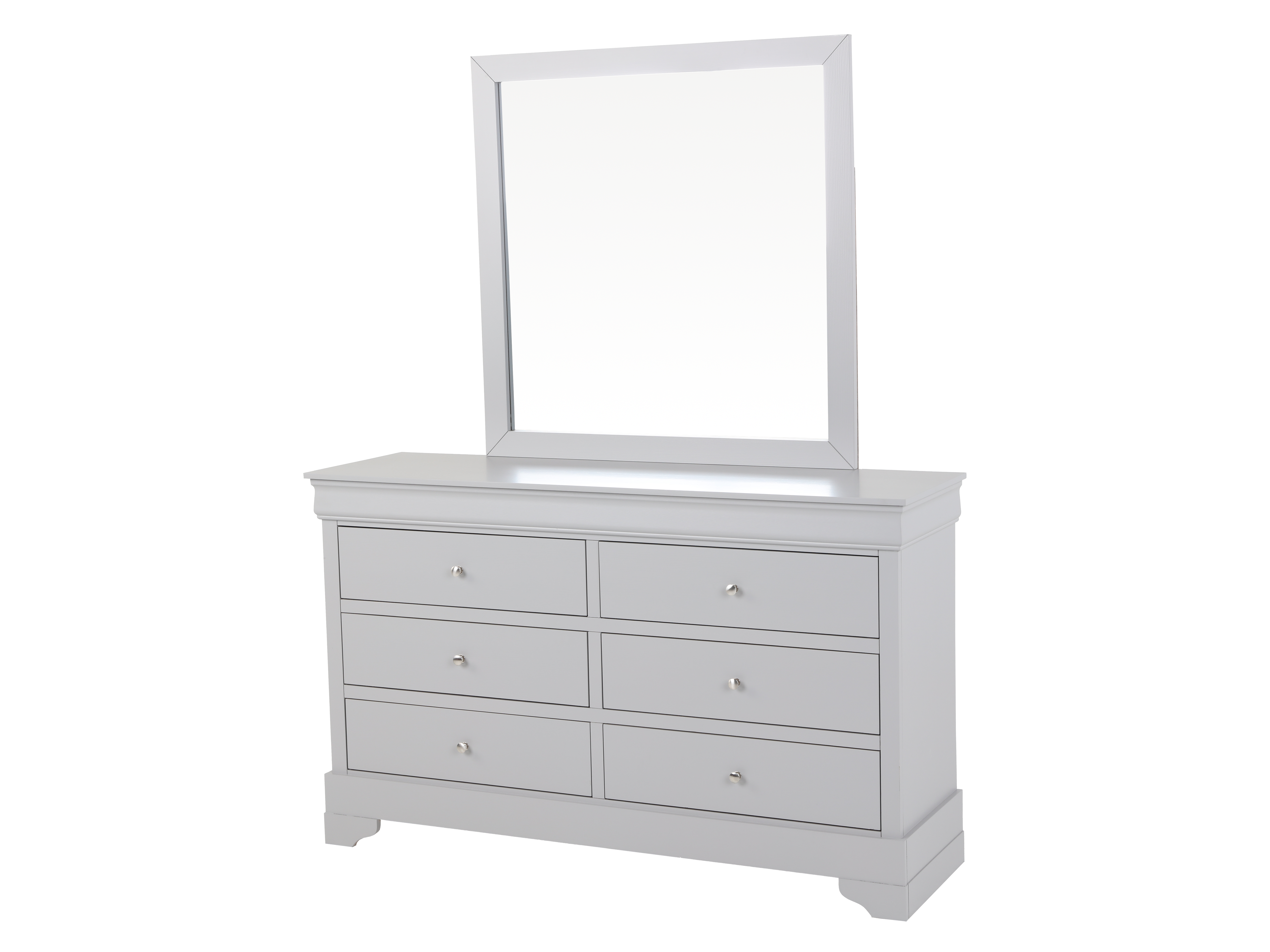 • Dresser with Mirror: This large dresser comes with ample storage, featuring multiple drawers with simple, stylish knobs, topped with a mirror that enhances the room's space and light.