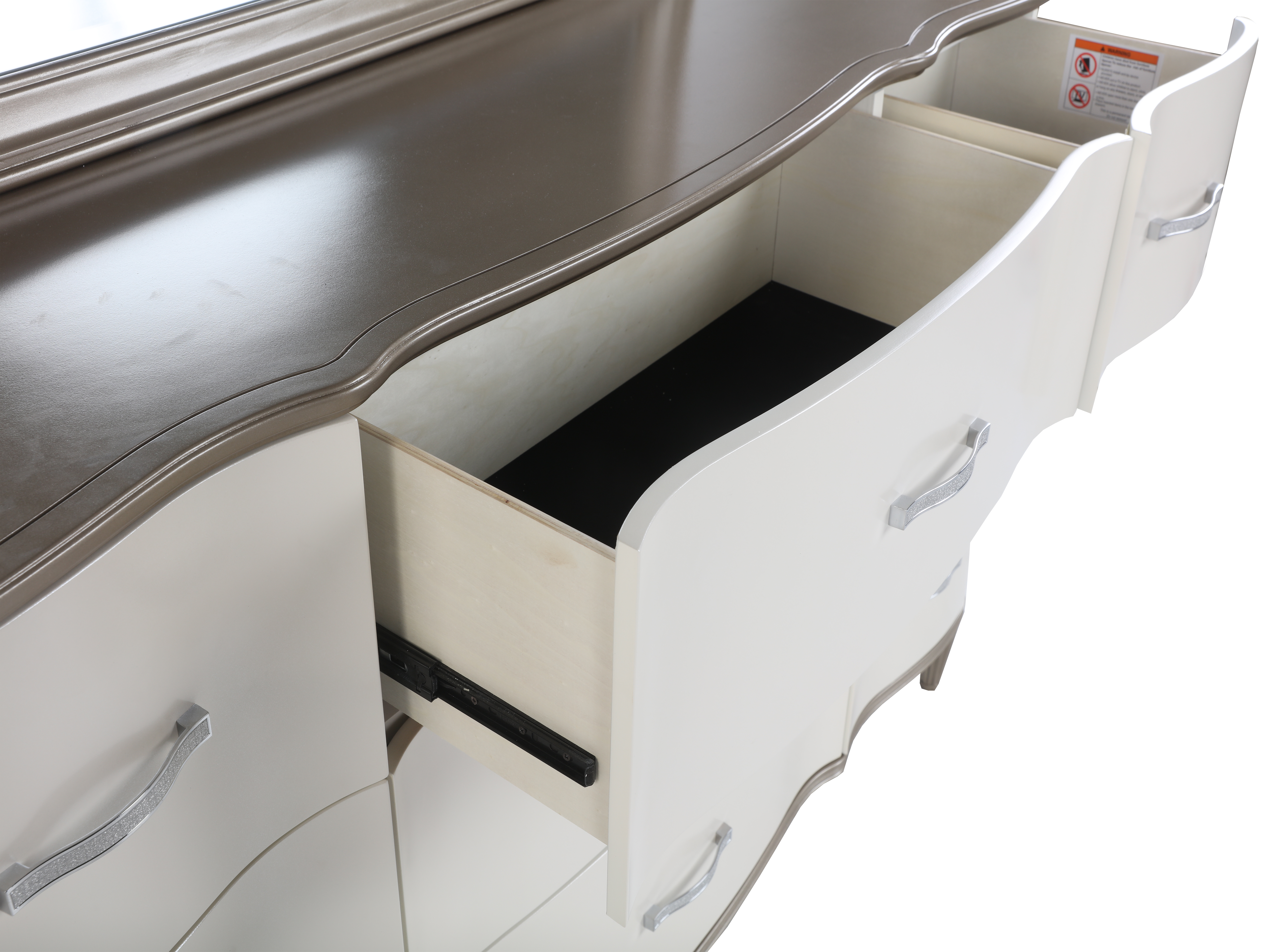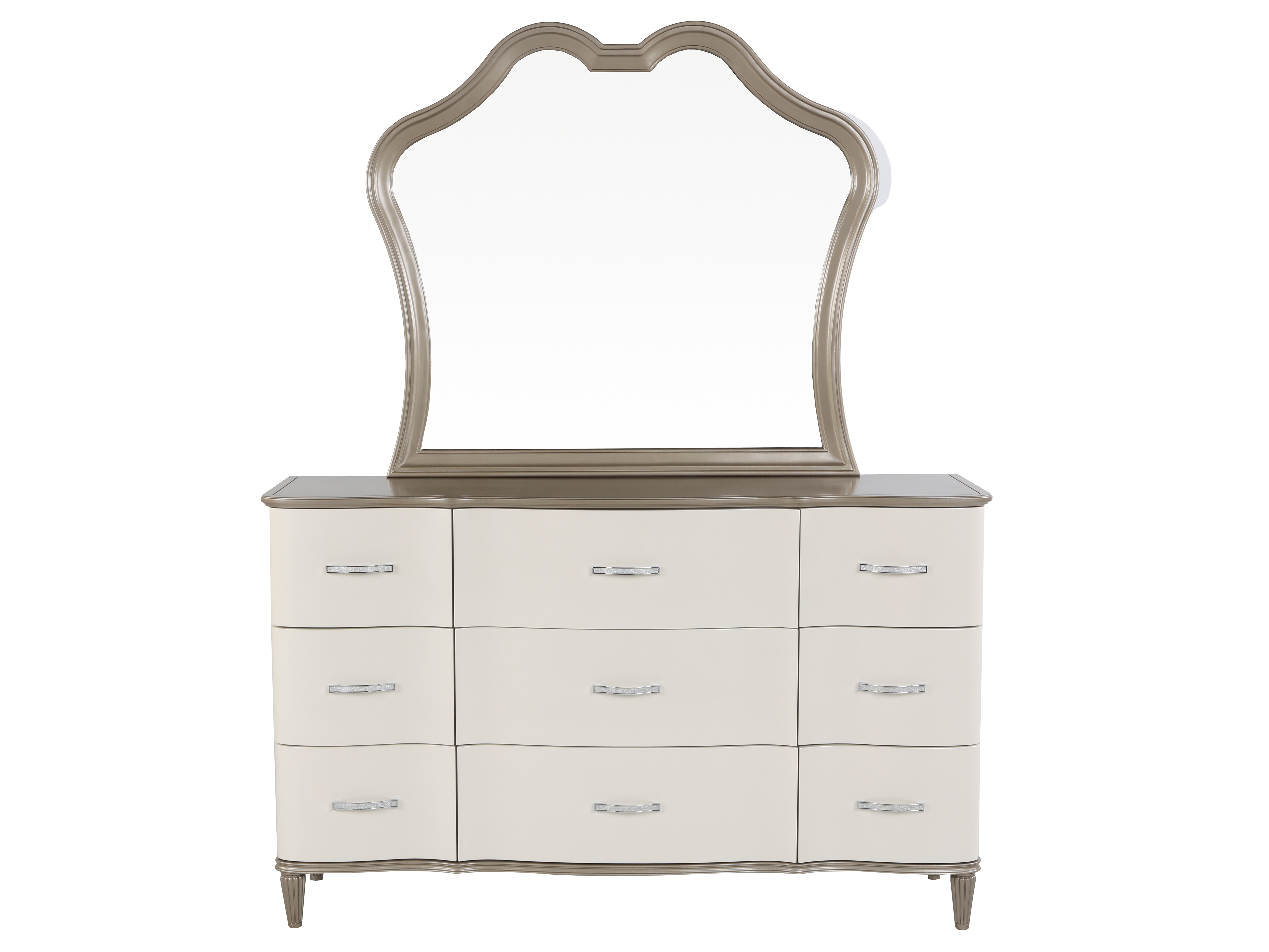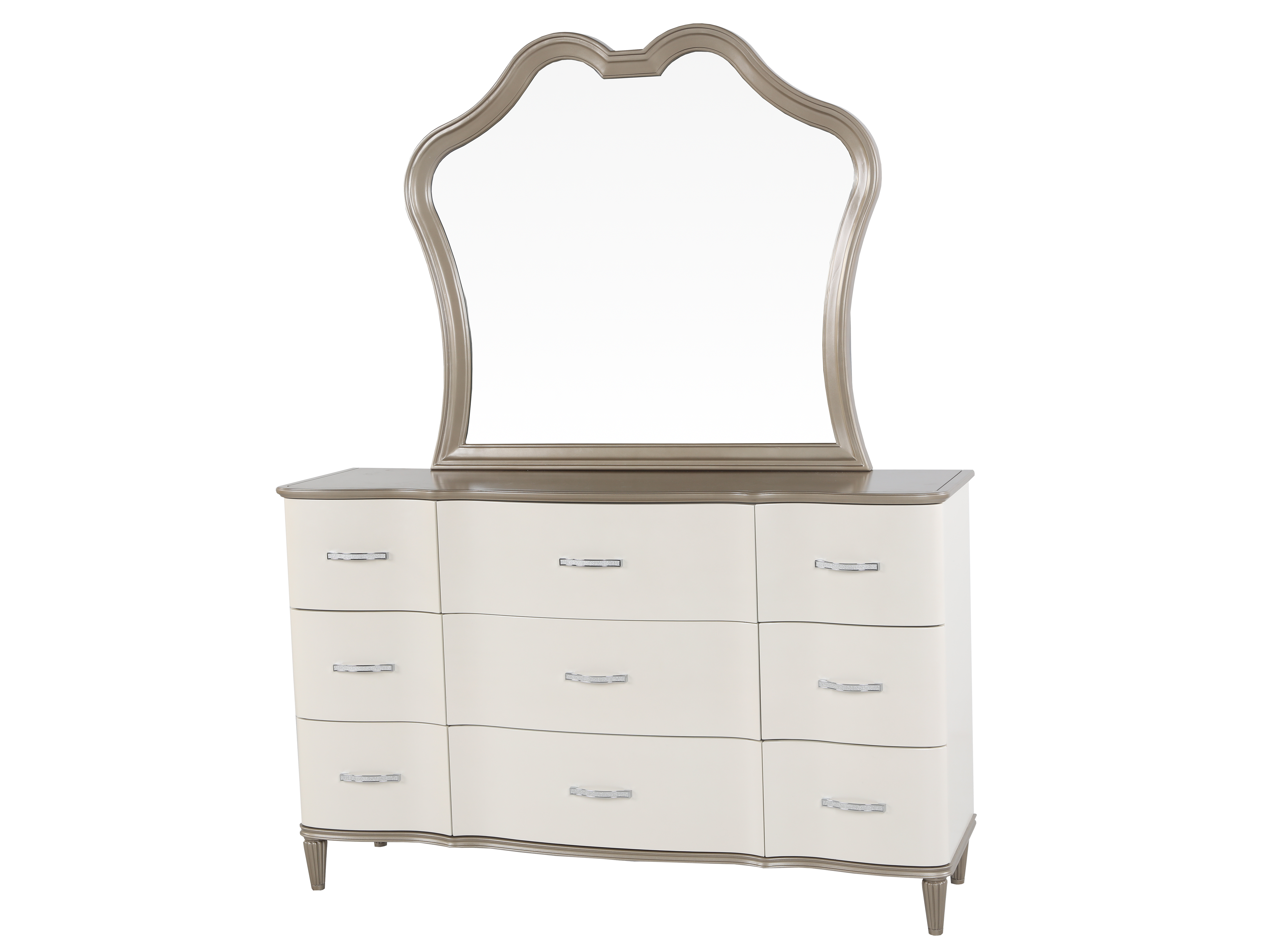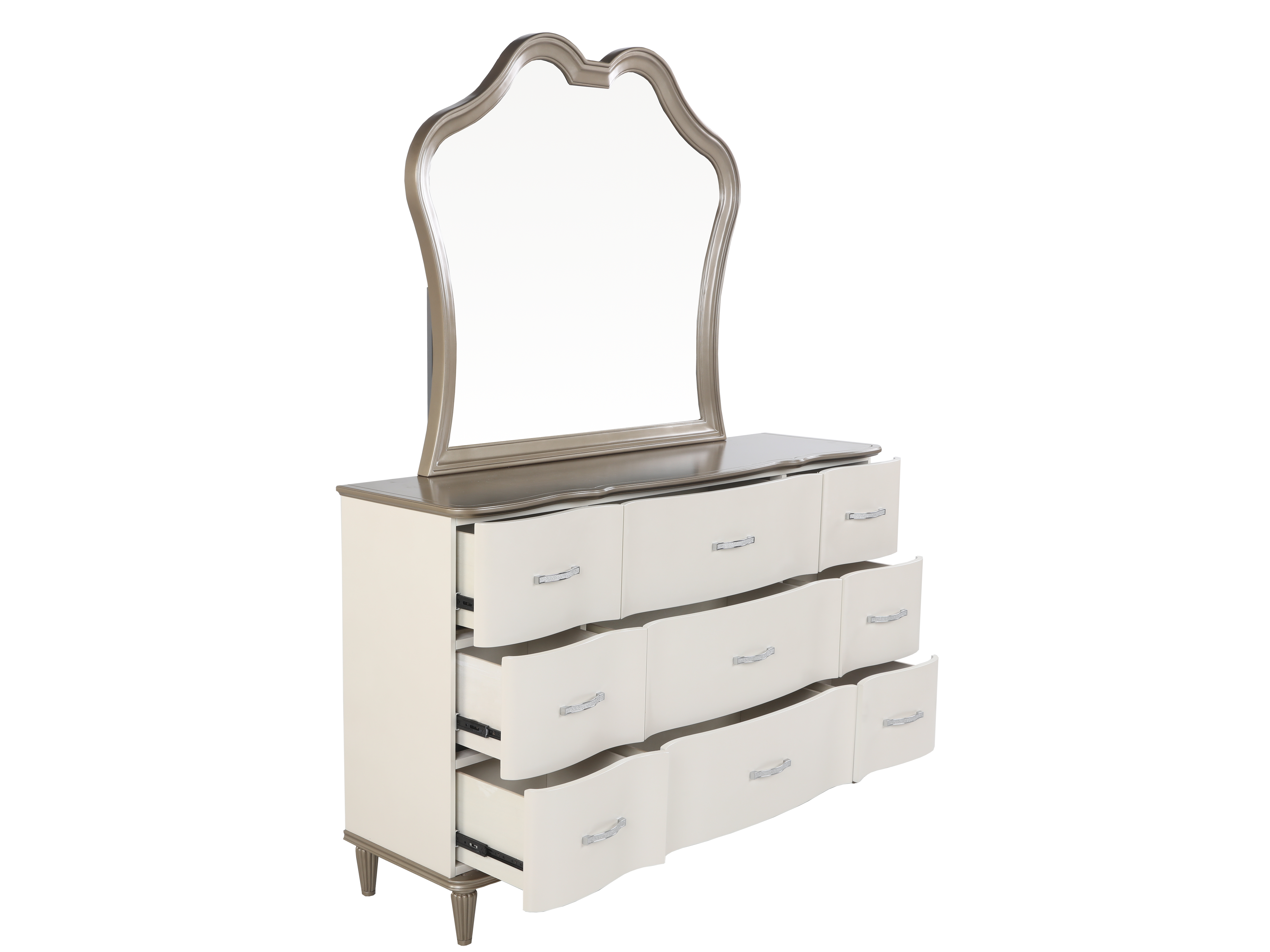 - Dresser with Mirror – A spacious 9-drawer dresser with a gracefully curved mirror, offering both beauty and ample storage.