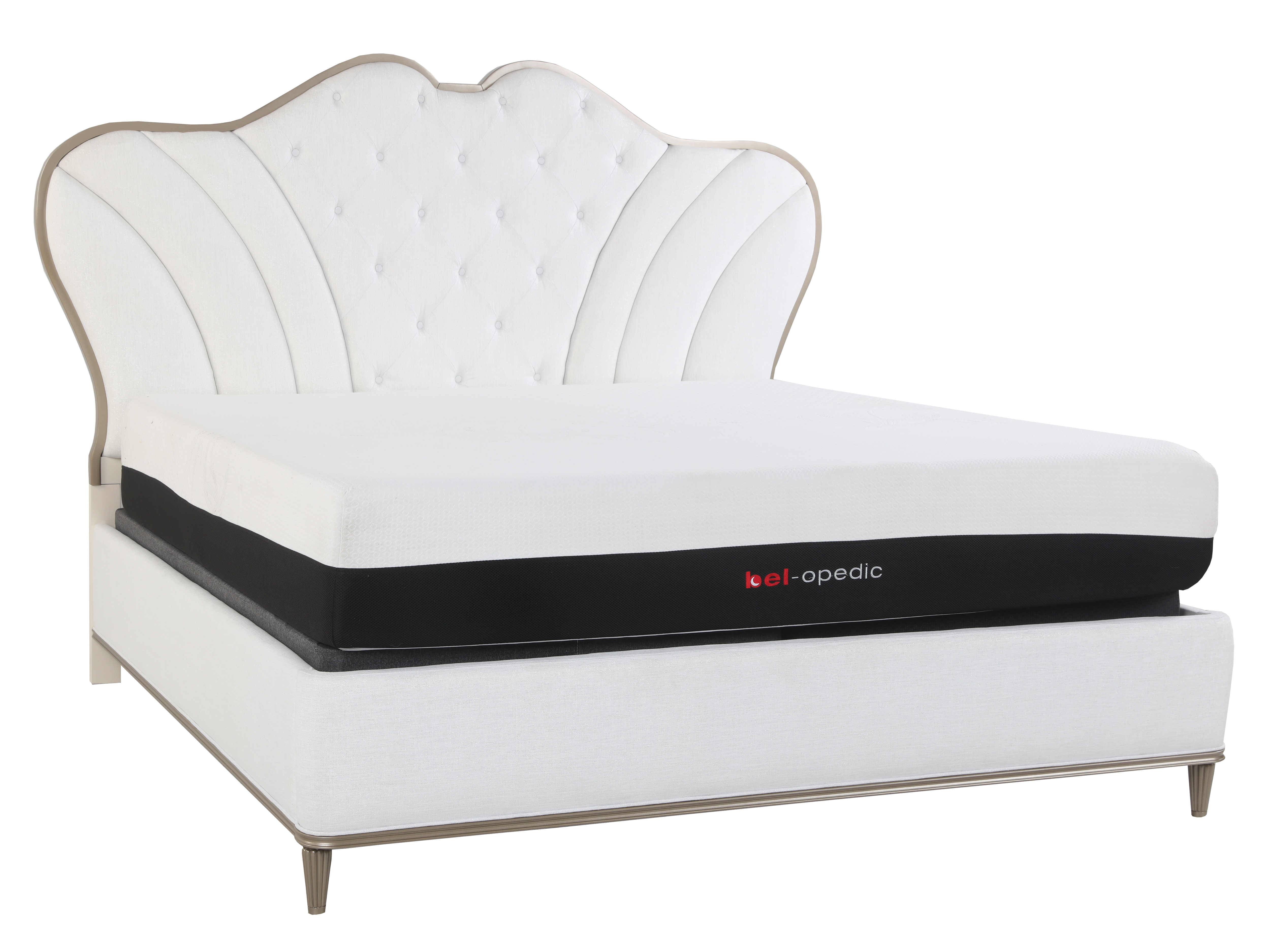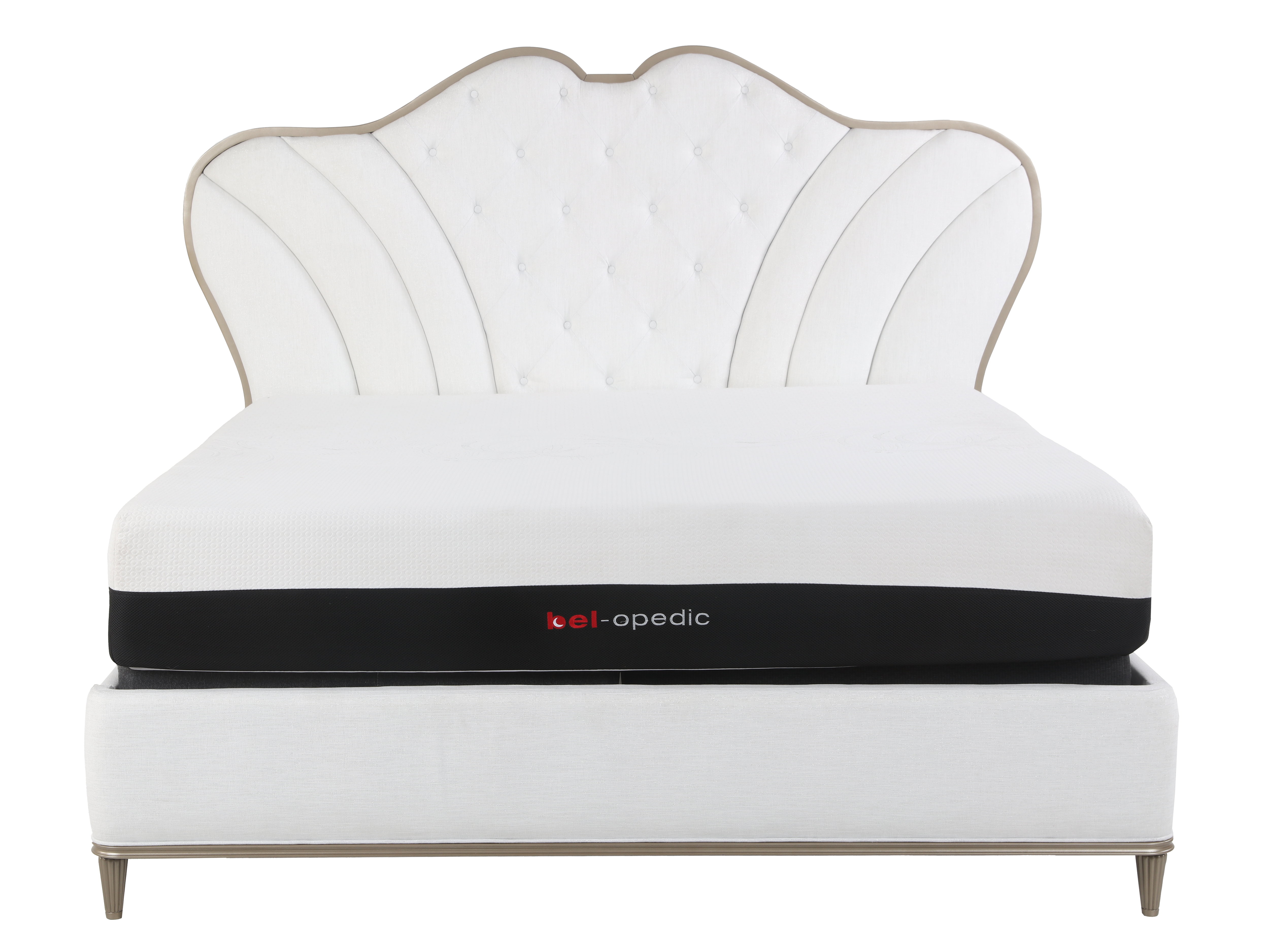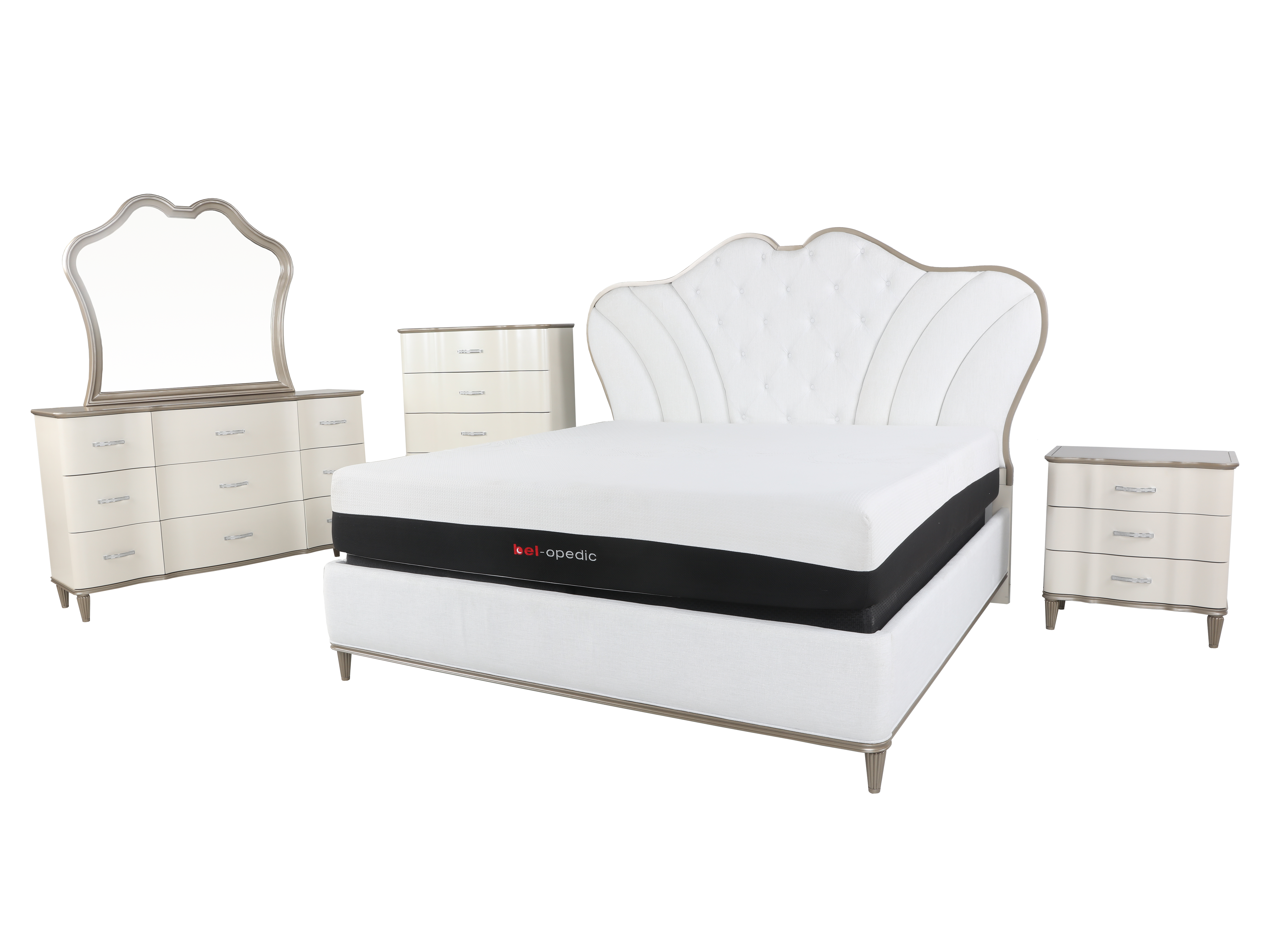 Transform your bedroom into a luxurious retreat with this elegant glam bedroom set, designed to bring sophistication and charm to any space. Featuring a stunning upholstered panel bed with an eye-catching, scalloped silhouette and deep button tufting, this set is the perfect blend of elegance and comfort. Accented with a soft ivory finish and delicate gold trim, each piece exudes timeless beauty. This bedroom set is perfect for those who appreciate luxury and classic design. Ideal for creating a serene, elegant sanctuary in your home.
