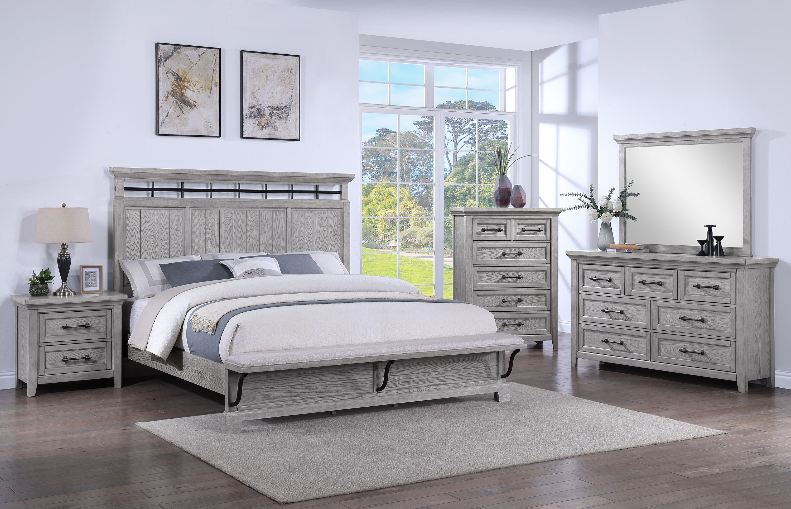 This bedroom suite offers a refreshing take on rustic charm, featuring a soft greige finish that highlights the natural wood grain. The sturdy bed stands as the centerpiece with its robust headboard and inviting design, while the accompanying pieces — a nightstand, dresser, and chest — provide ample storage, each fitted with understated hardware that accentuates the collection's country-inspired look.