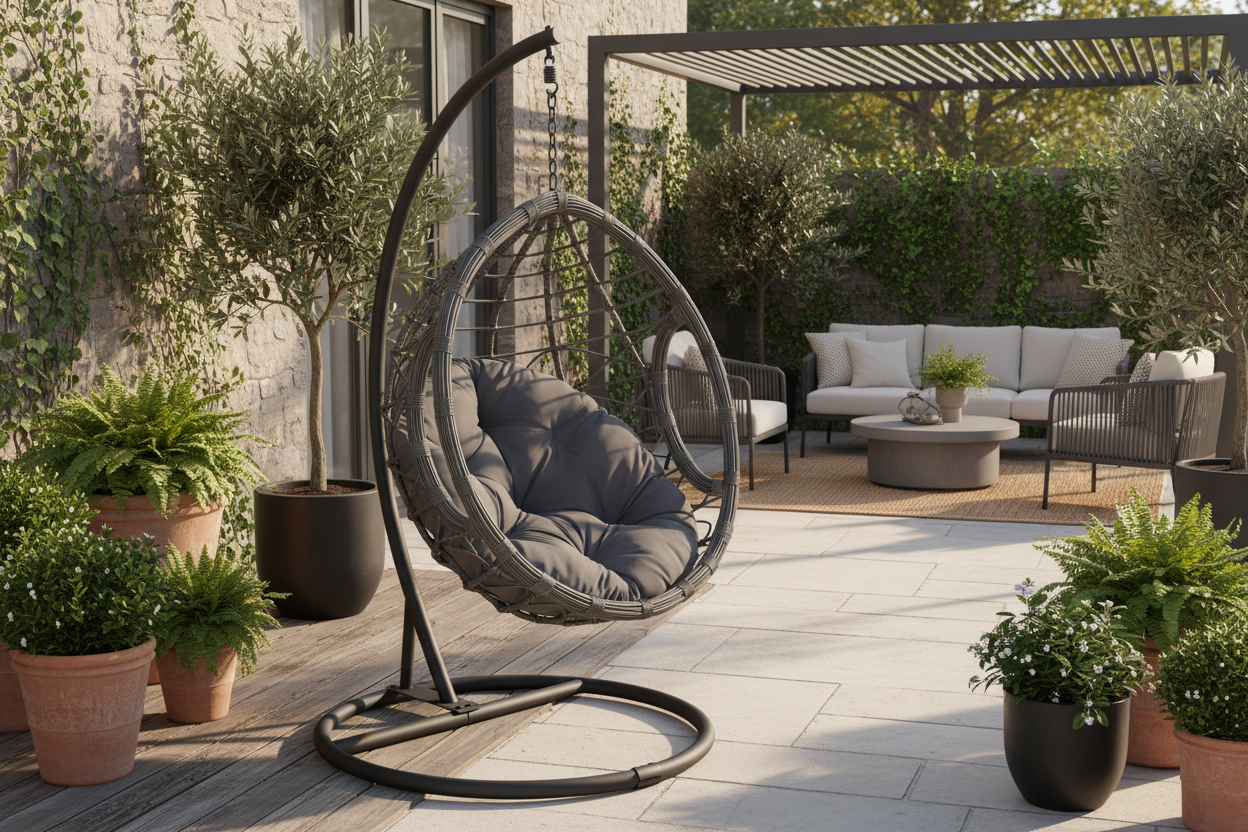 Create an instant retreat on your patio, balcony, or sunroom with this modern hanging egg chair. A free-standing steel frame supports a gracefully woven poly-rattan basket in a versatile gray finish, paired with a plush tufted cushion for sink-in comfort. Sized for a cozy curl-up, the basket measures about 43.3" × 43.3" × 78.7" and is engineered for everyday outdoor use. Sturdy metal hardware and an included chain make setup straightforward, while the open weave keeps the silhouette light and airy.