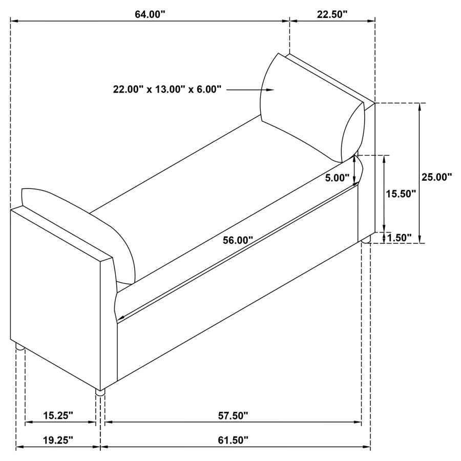 Accent Bench: 64.25" x 22.5" x 24.75", SeatHeight: 18.0, SeatWidth: 55.25, SeatDepth: 22.5, Weight: 57.32