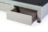 This bed offers a stylish and functional solution for bedrooms of all sizes. The neutral color and modern design make it easy to pair with various decor styles. The bed is a modern, upholstered platform bed with a grey fabric headboard and frame. It has a clean and minimalist design with sleek lines and a neutral color palette. The headboard is tall and features a curved top with button-tufted detailing. The fabric is a light grey color with a smooth texture. The frame is also upholstered in the same grey fabric and has a low profile, creating a streamlined look. The bed has two built-in drawers on each side of the footboard, providing additional storage space for bedding, clothes, or other items. The drawers have smooth-rolling casters for easy access.