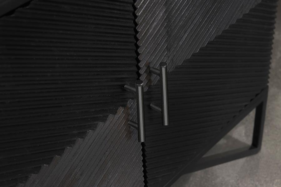 Bold finish composite wood and iron merge to create a stylish and durable four-door accent cabinet. Perfect for use in your dining room, living room, or media room, this chic cabinet is versatile and attractive. Diagonal self-striping adds textured effects on its door fronts to create a compelling look. Find space on two adjustable shelves behind four doors that open with matching black iron vertical pulls. Set atop a geometric black finish iron frame, this cabinet serves as a striking example of bold style.