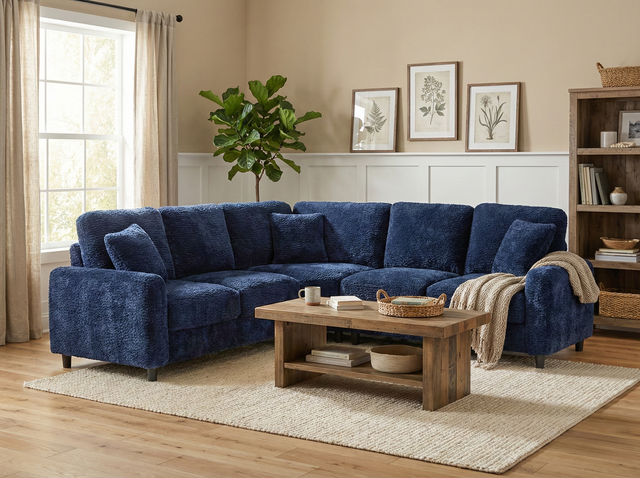Elevate your living room with the Floray Navy Chenille Sectional Sofa, designed for modern comfort and timeless style. Upholstered in soft, textured navy chenille fabric, this 3-piece sectional provides both durability and a cozy seating experience. The spacious L-shaped design is perfect for family gatherings, entertaining guests, or stretching out after a long day.