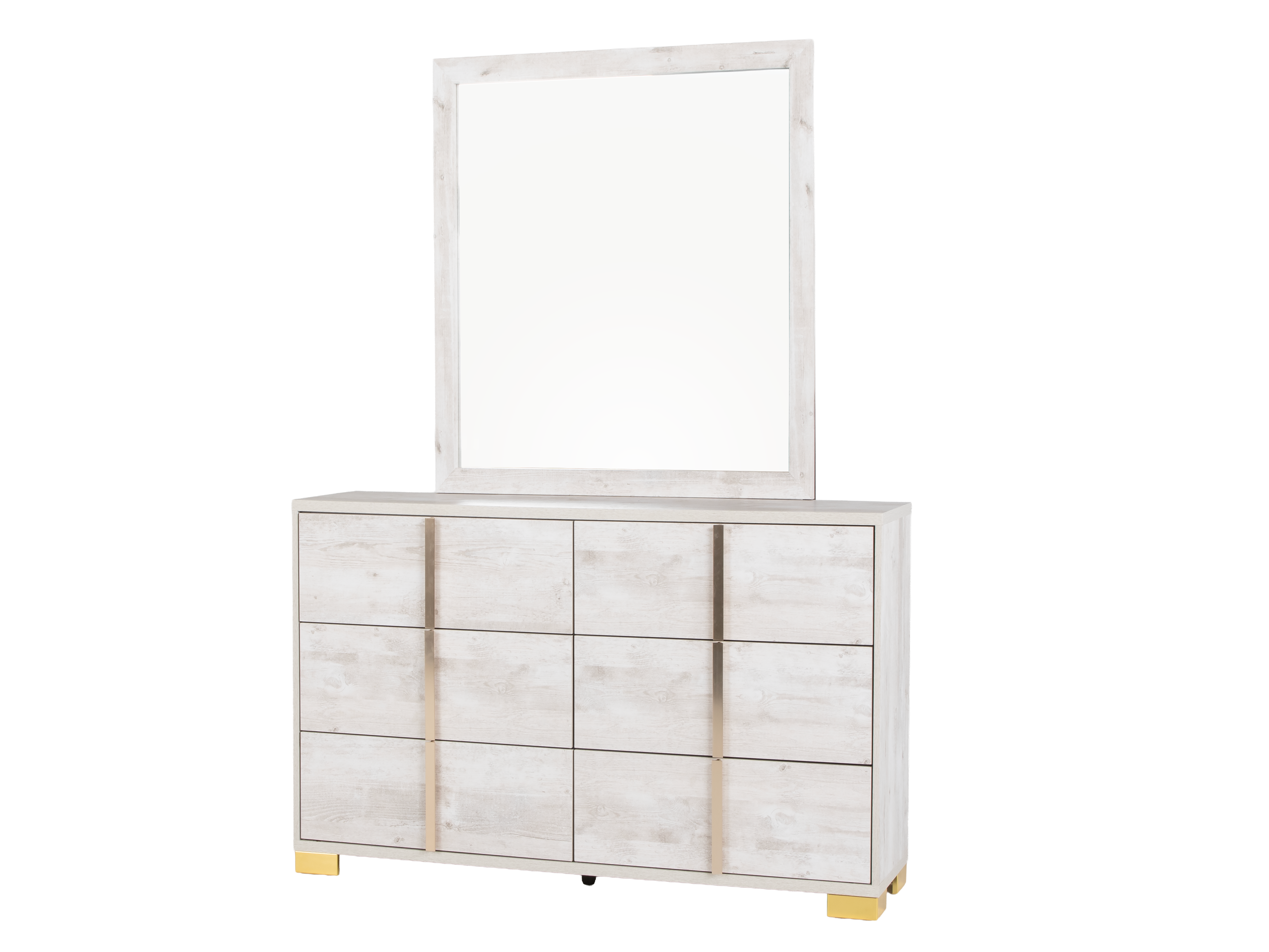 Brushed metal base details and vertical accent strips on the dresser and nightstand add a subtle touch of glam without overpowering the relaxed, contemporary feel. Generous storage in the dresser and nightstand keeps clothing, linens, and bedside essentials neatly organized so your room stays clutter-free.