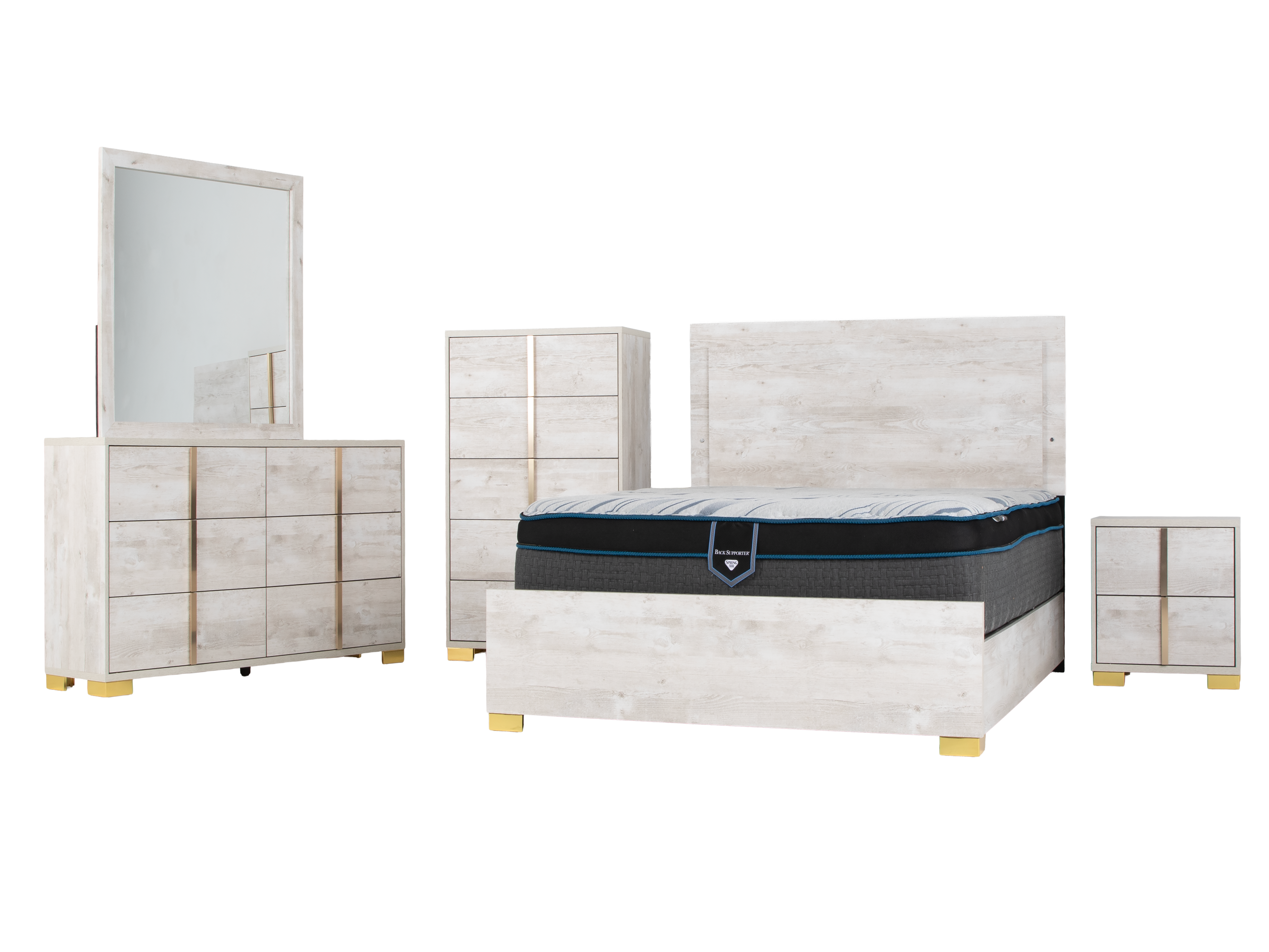 This 4-piece queen bedroom set includes a queen bed (headboard, footboard, slats and side rails), a 6-drawer dresser, a framed mirror and one nightstand. The chest, mattress and foundation/box spring are not included.