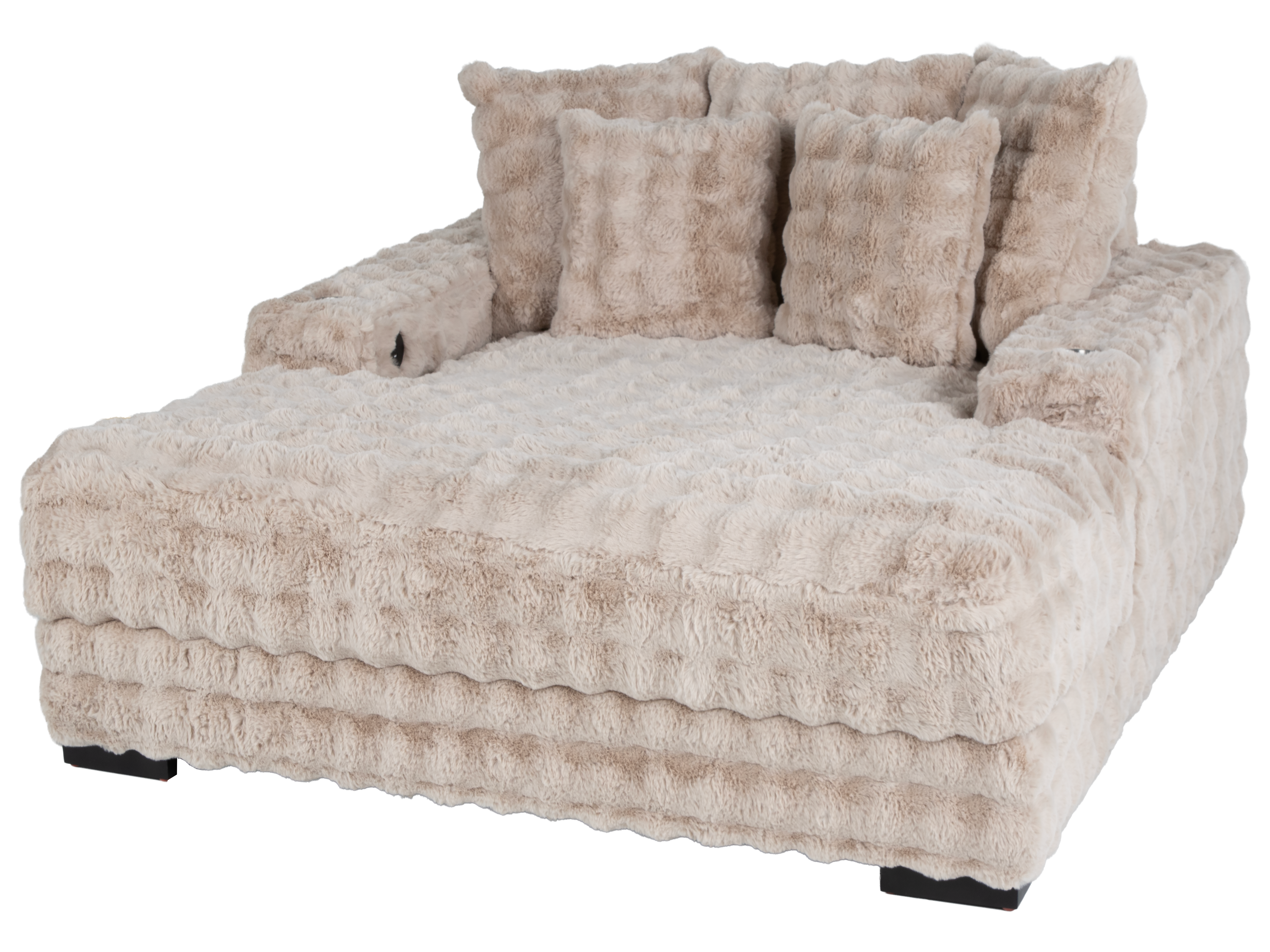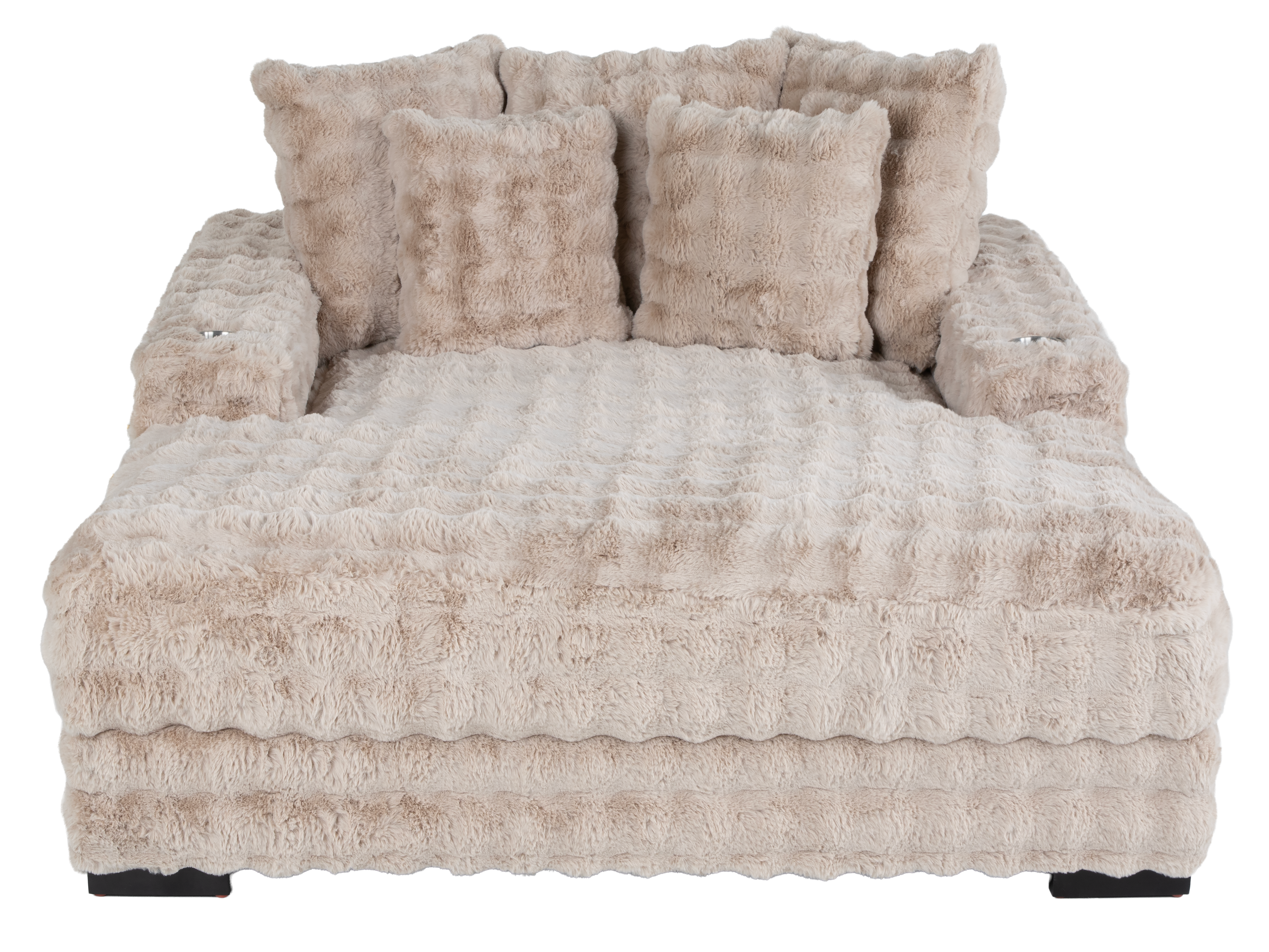 Settle into cloud-soft comfort with this oversized Beige Velvet Chaise Lounge—perfect for reading, streaming, or napping. Wrapped in plush, textured velvet (100% polyester), it features dual stainless-steel cupholders and two built-in USB ports (USB-A & USB-C) to keep devices powered while you relax. The kiln-dried, corner-blocked plywood frame, spring base, and pocket-coil cushioning deliver long-lasting support, while black wood legs ground the look. Comes with 3 large back pillows + 2 throw pillows for sink-in softness.