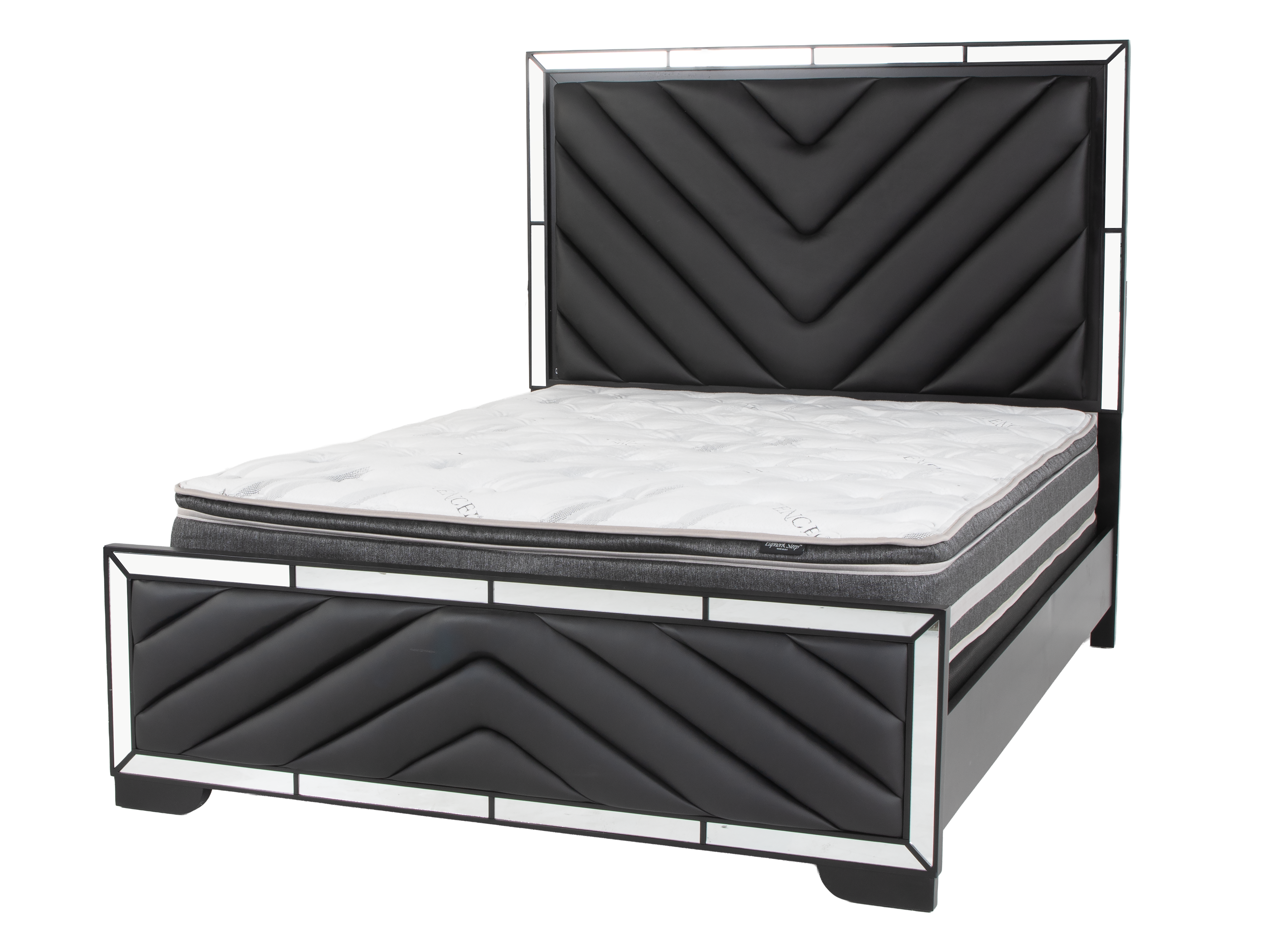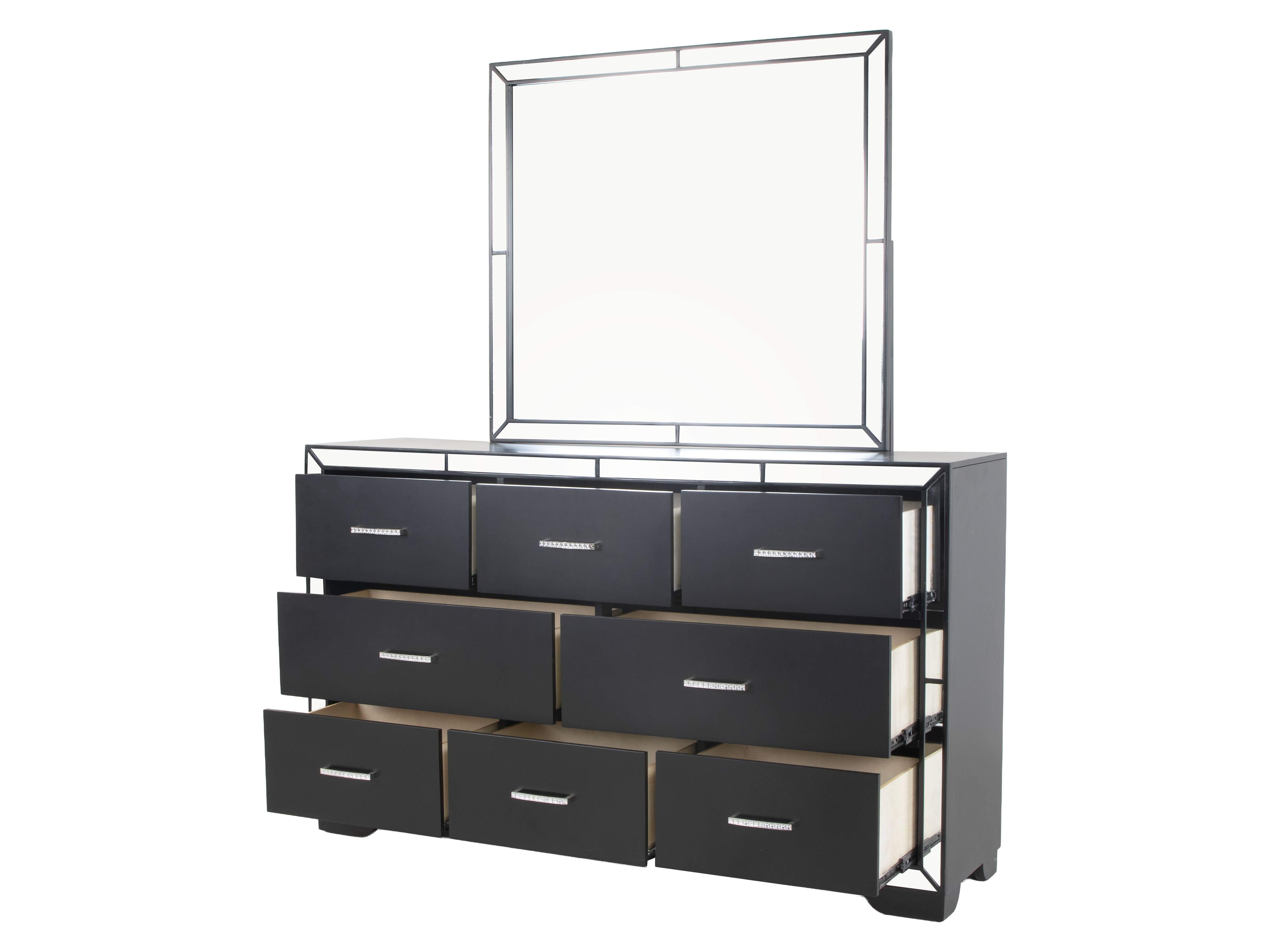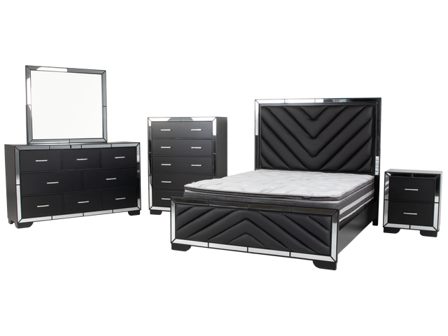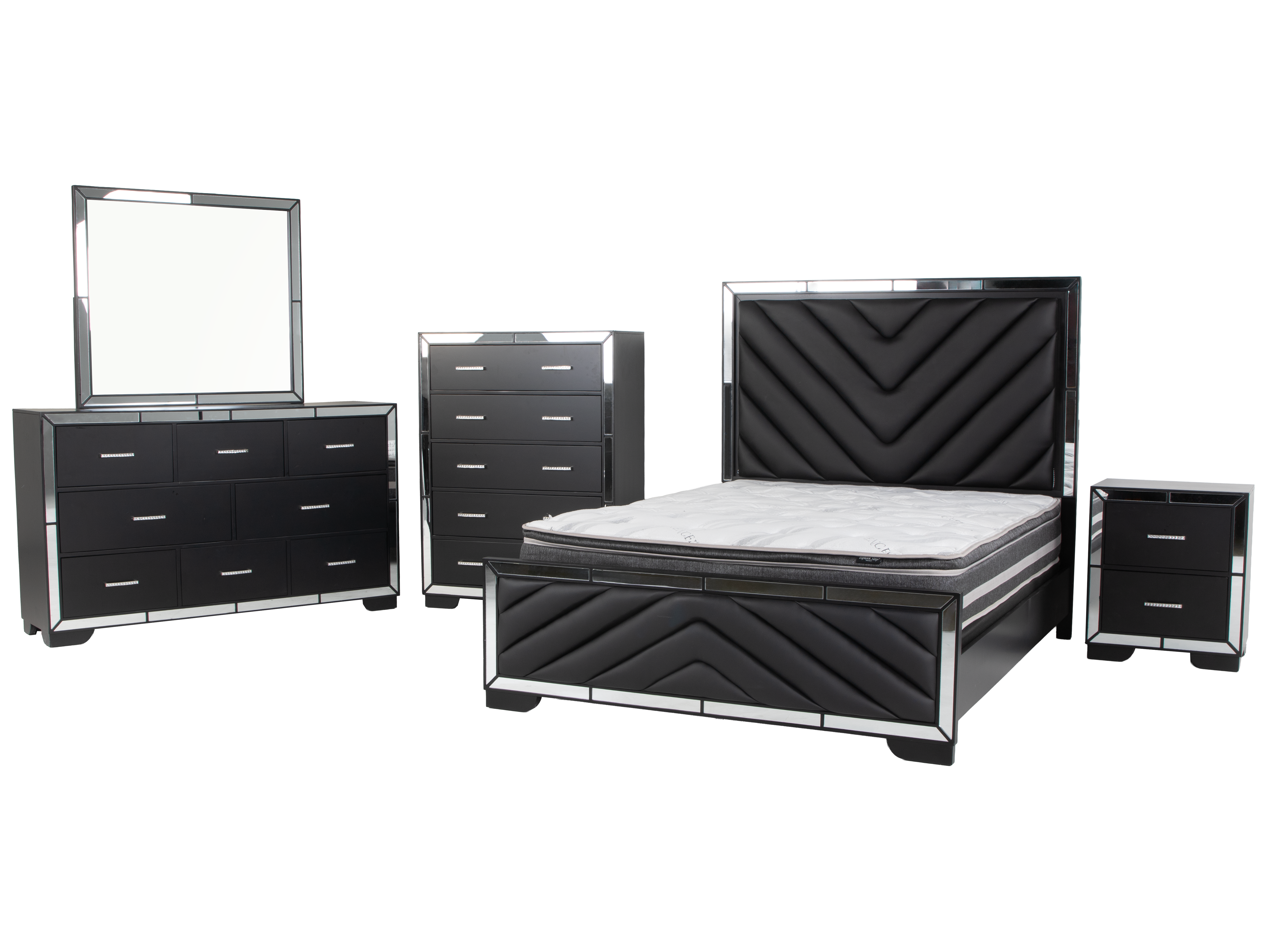 The bed features a sleek black finish with a distinctive chevron pattern on the headboard and footboard, adding a touch of modern sophistication. The dresser, topped with a large, elegantly framed mirror, offers ample storage with multiple drawers, making it perfect for organizing your essentials. The nightstand complements the set with its matching design and two drawers, providing easy access to your bedside necessities.