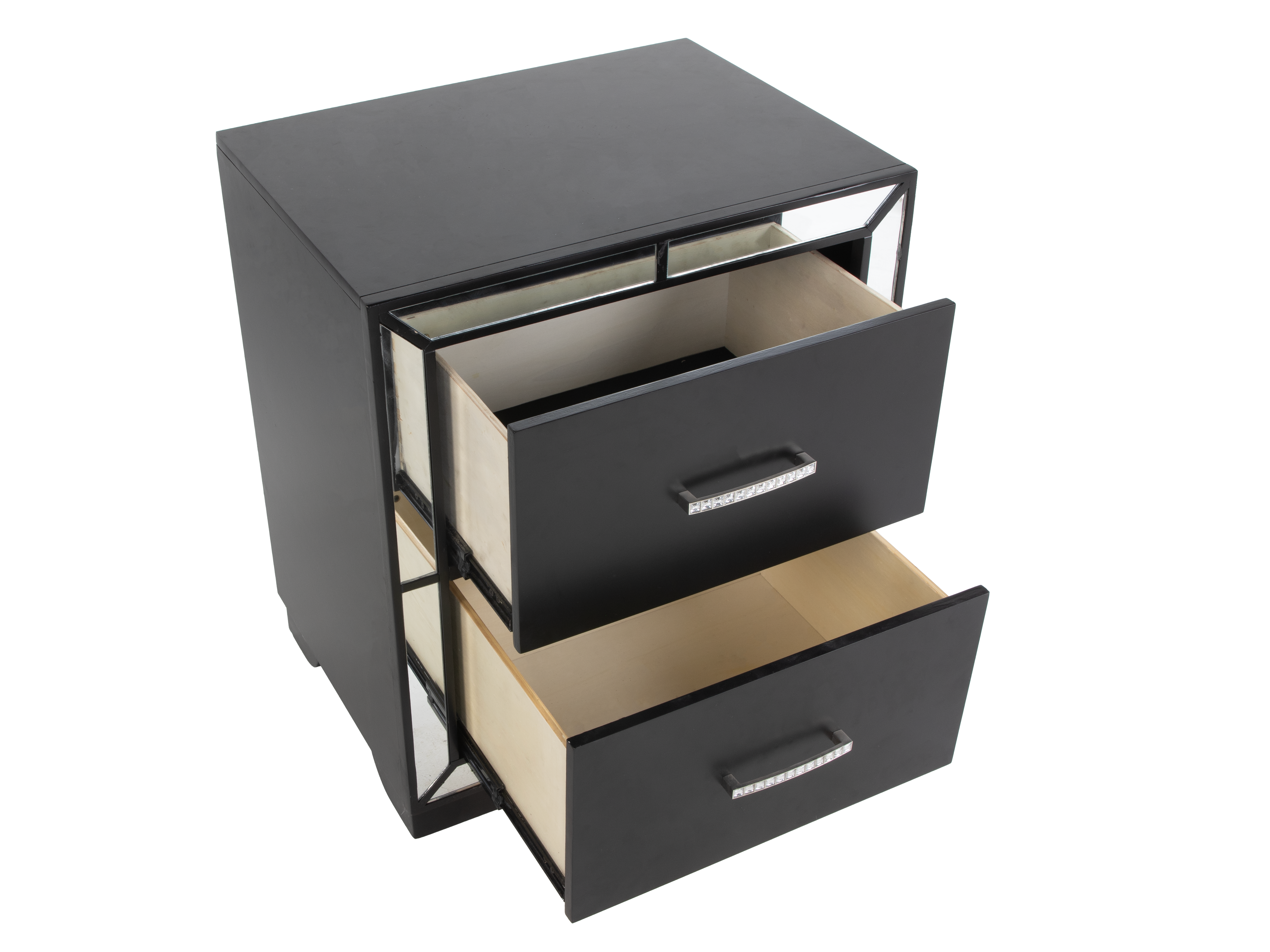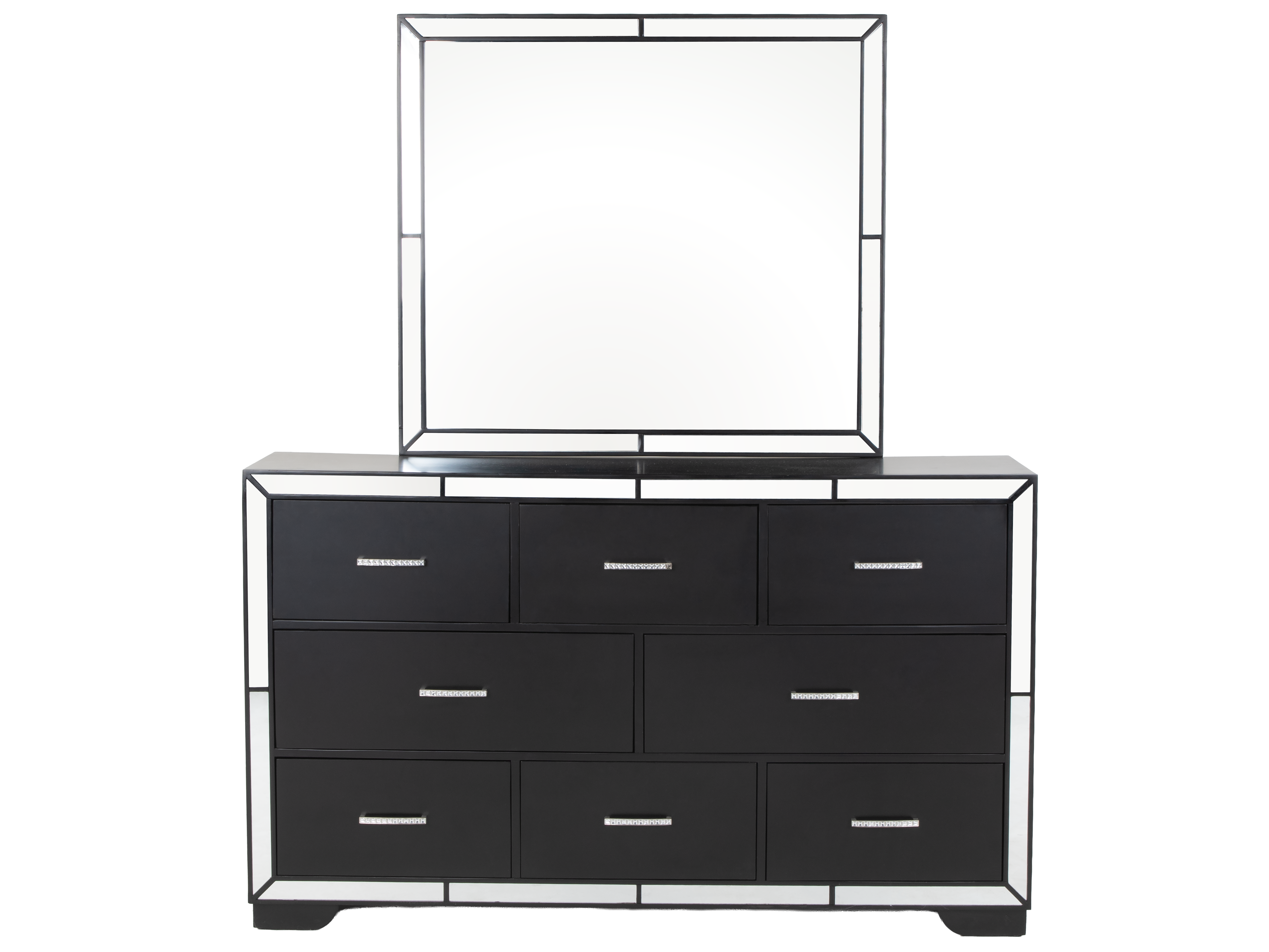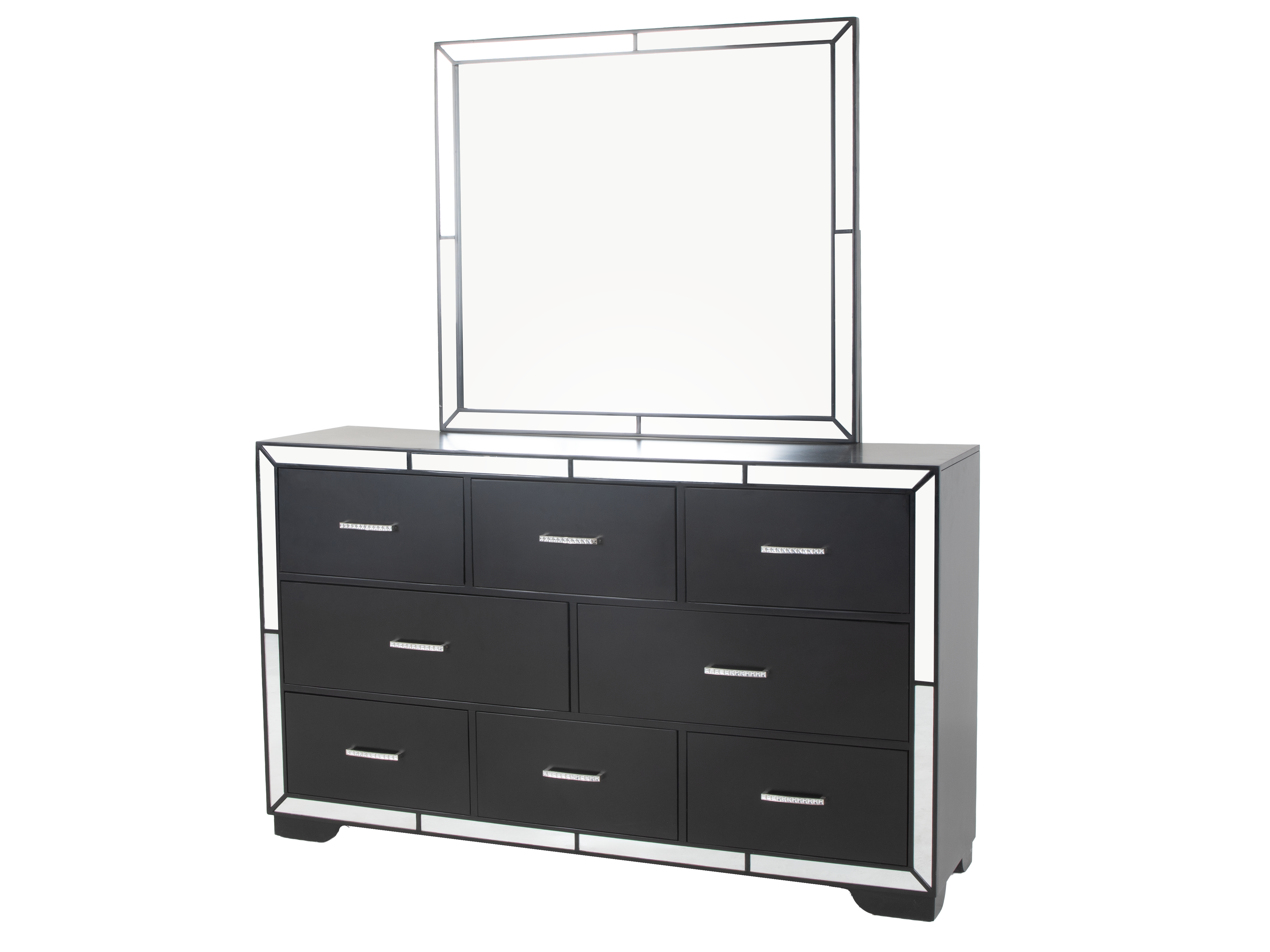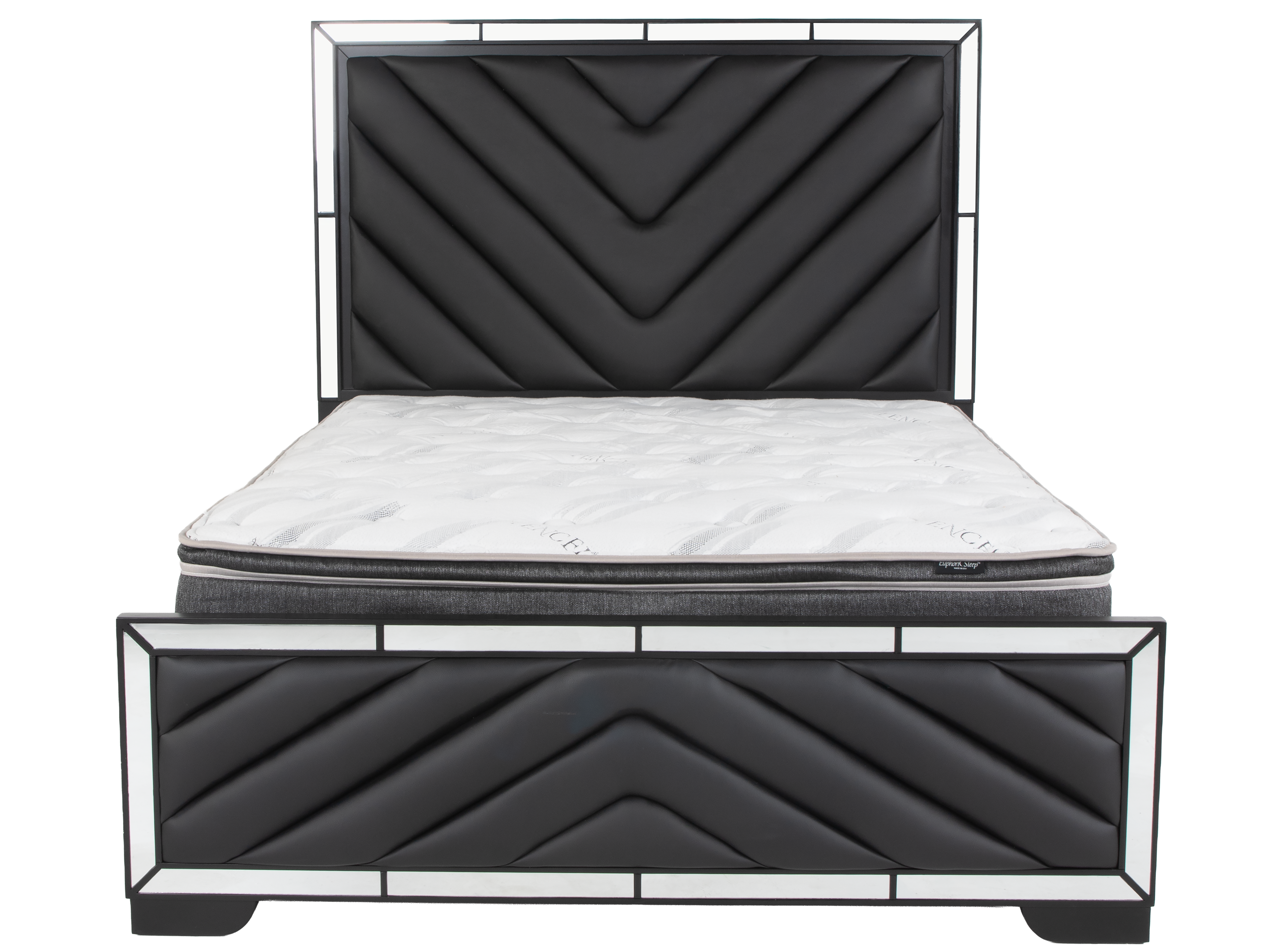 The bed features a sleek black finish with a distinctive chevron pattern on the headboard and footboard, adding a touch of modern sophistication. The dresser, topped with a large, elegantly framed mirror, offers ample storage with multiple drawers, making it perfect for organizing your essentials. The nightstand complements the set with its matching design and two drawers, providing easy access to your bedside necessities.