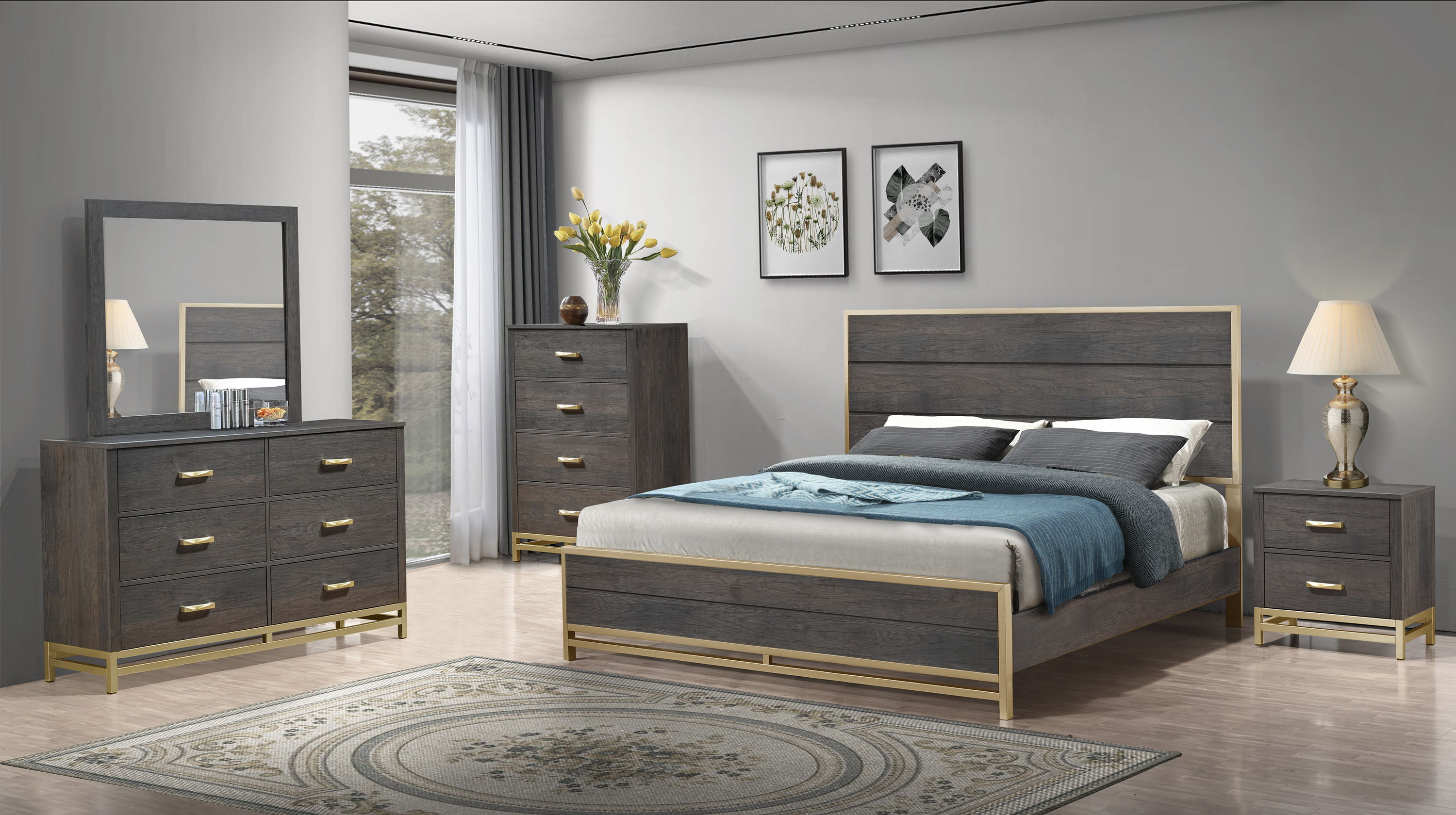 Step into a realm of contemporary sophistication with this bedroom collection. Flaunting a harmonious blend of rich, warm wood tones and bold, metallic accents, each piece exudes a luxe yet inviting appeal. The bed, with its sleek, linear design and striking headboard, becomes the centerpiece, complemented by storage options that blend functionality with chic, clean lines.