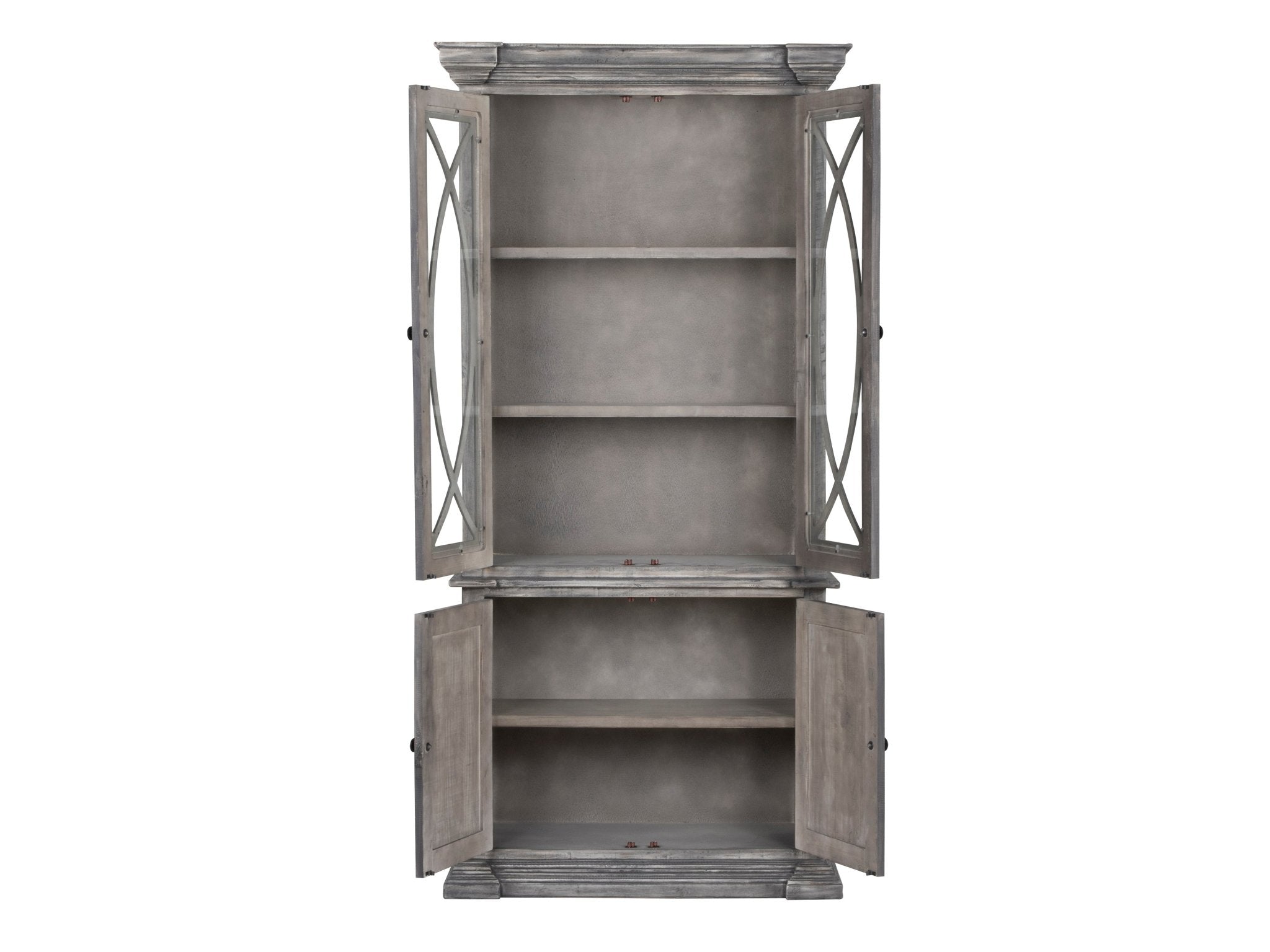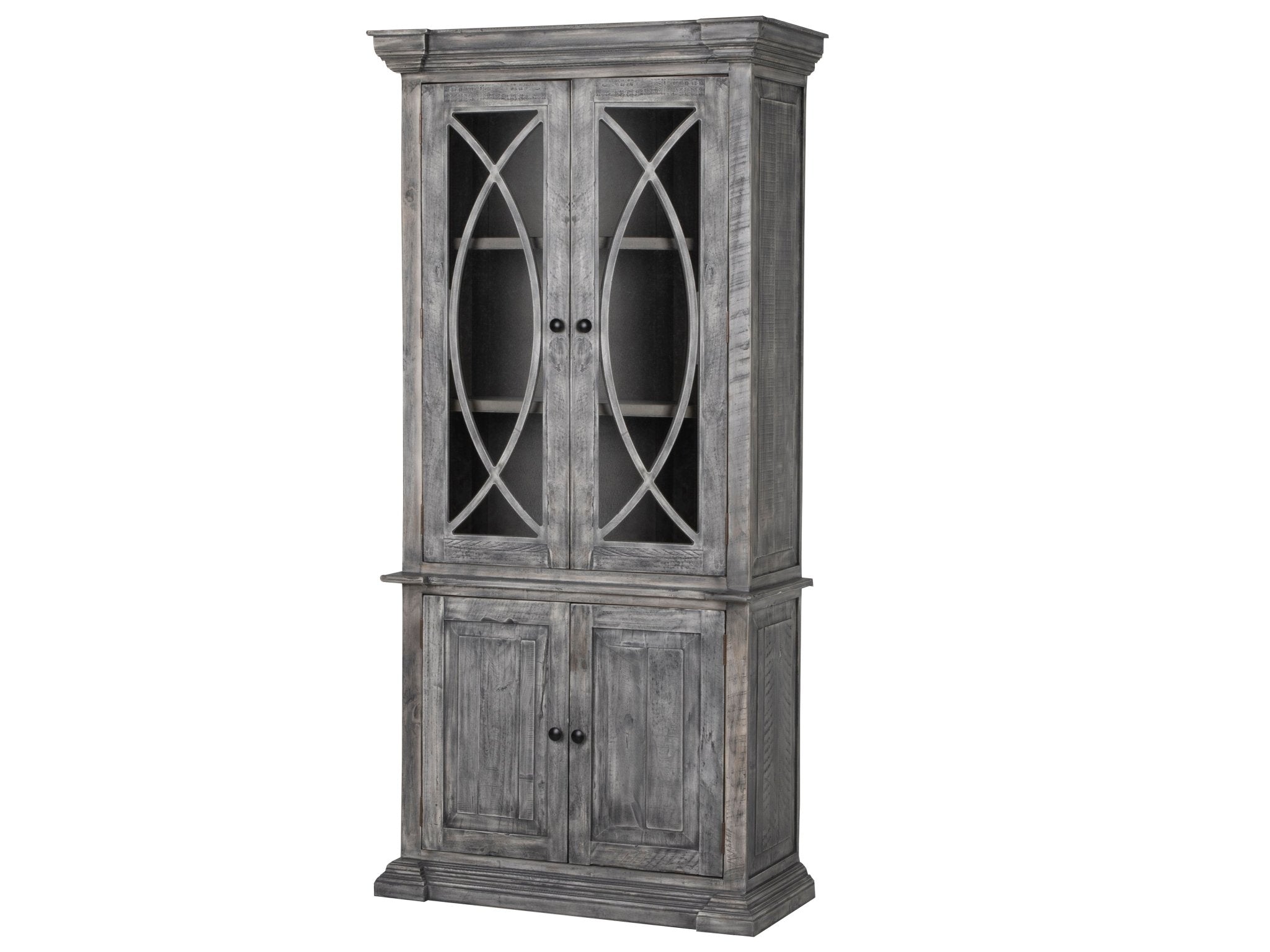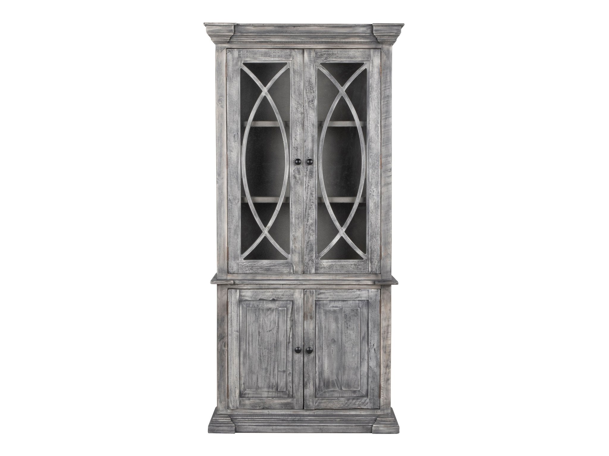 This accent China cabinet made of solid wood in a distressed silver finish. Its two elongated doors have glass fronts with semi-circular wood trim and metal hardware knobs. Inside are three shelves providing ample storage room. In addition, you will find a two-door cabinet below.