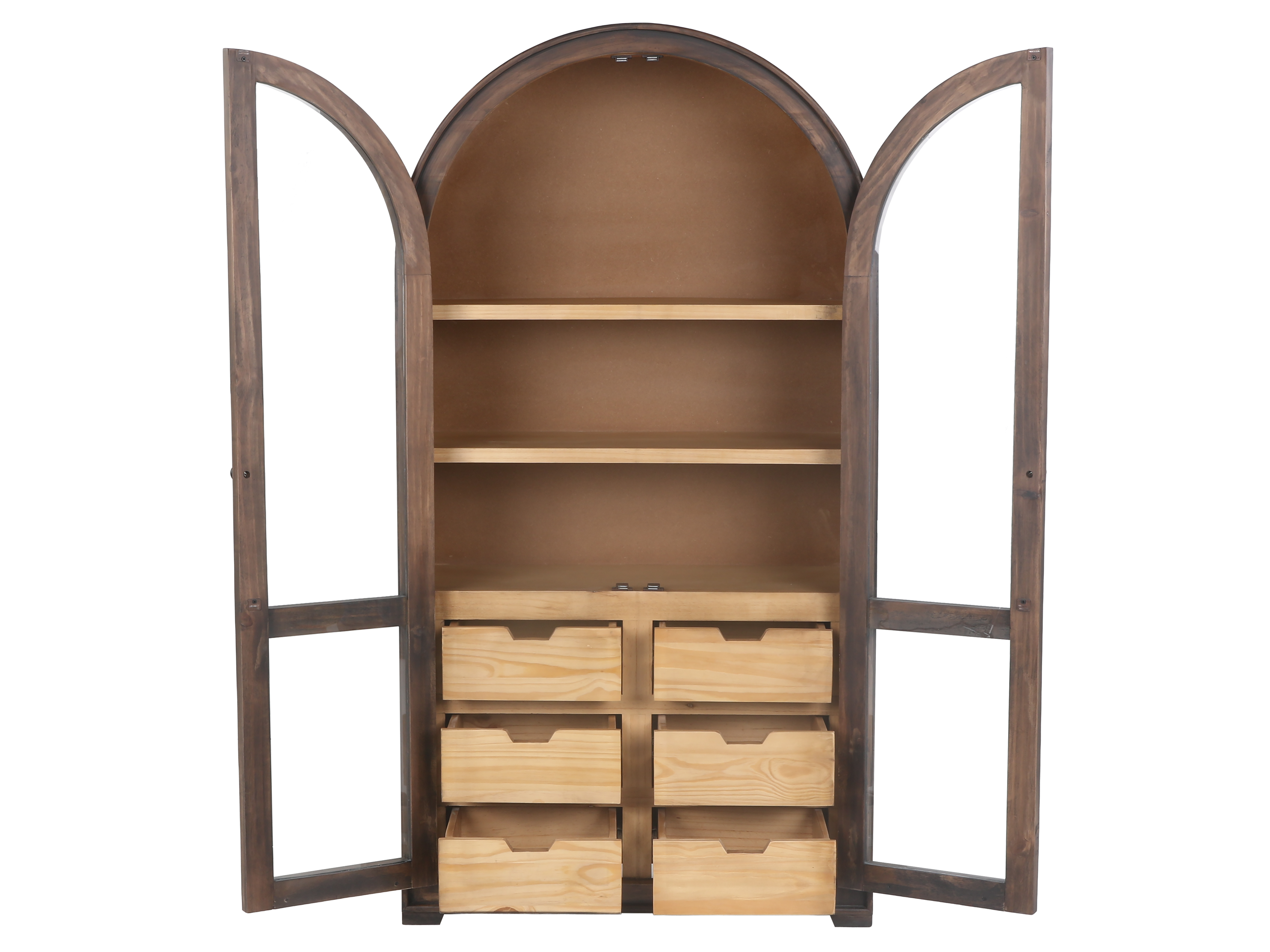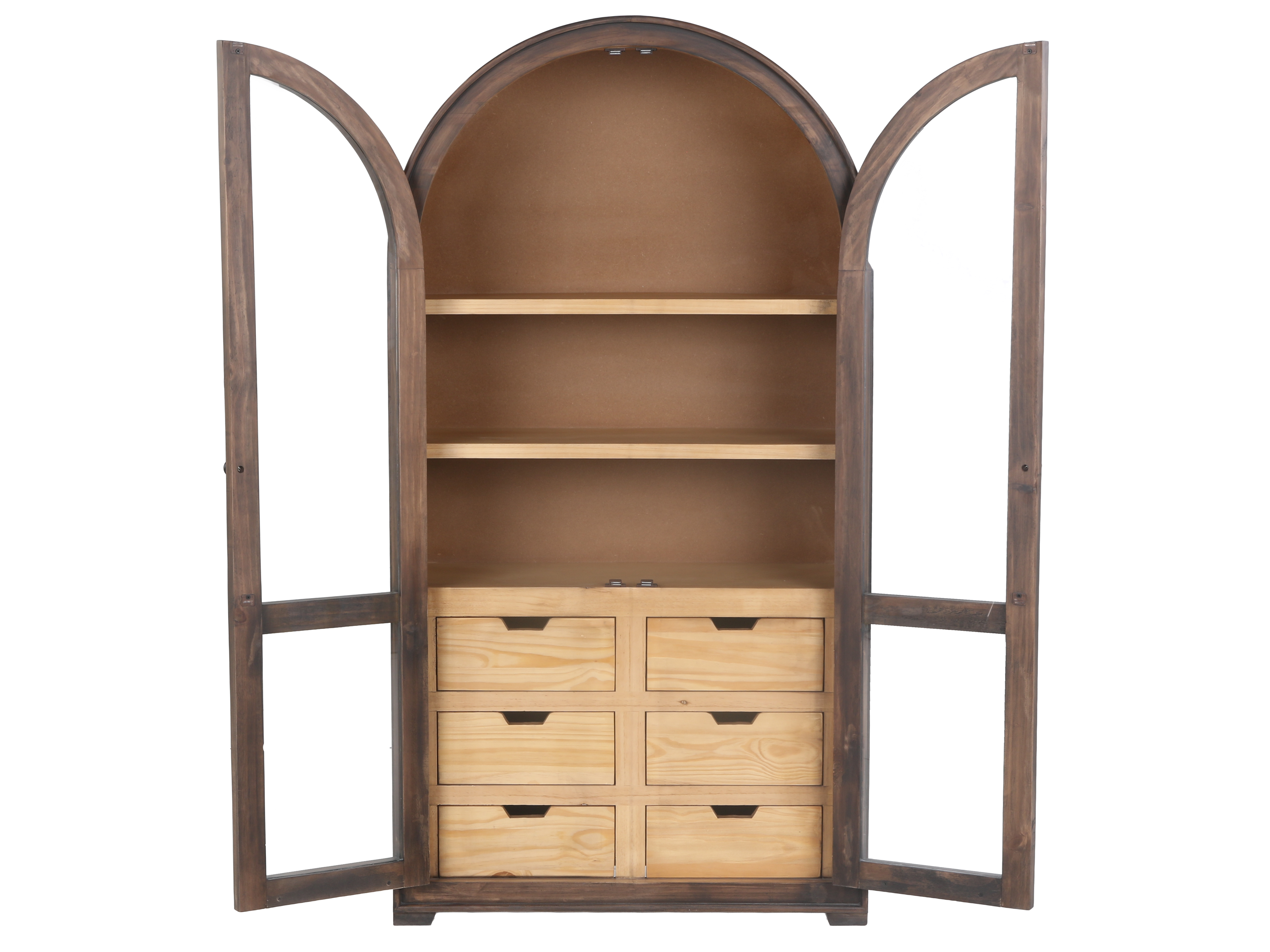 This rustic brown arched cabinet combines charm and functionality with its glass-paneled double doors, two adjustable shelves, and six spacious drawers. Perfect for displaying collectibles or storing essentials, its natural wood drawer fronts add a warm contrast to the rich brown frame. Ideal for living rooms, dining spaces, or home offices, this cabinet offers both style and ample storage in one striking piece.