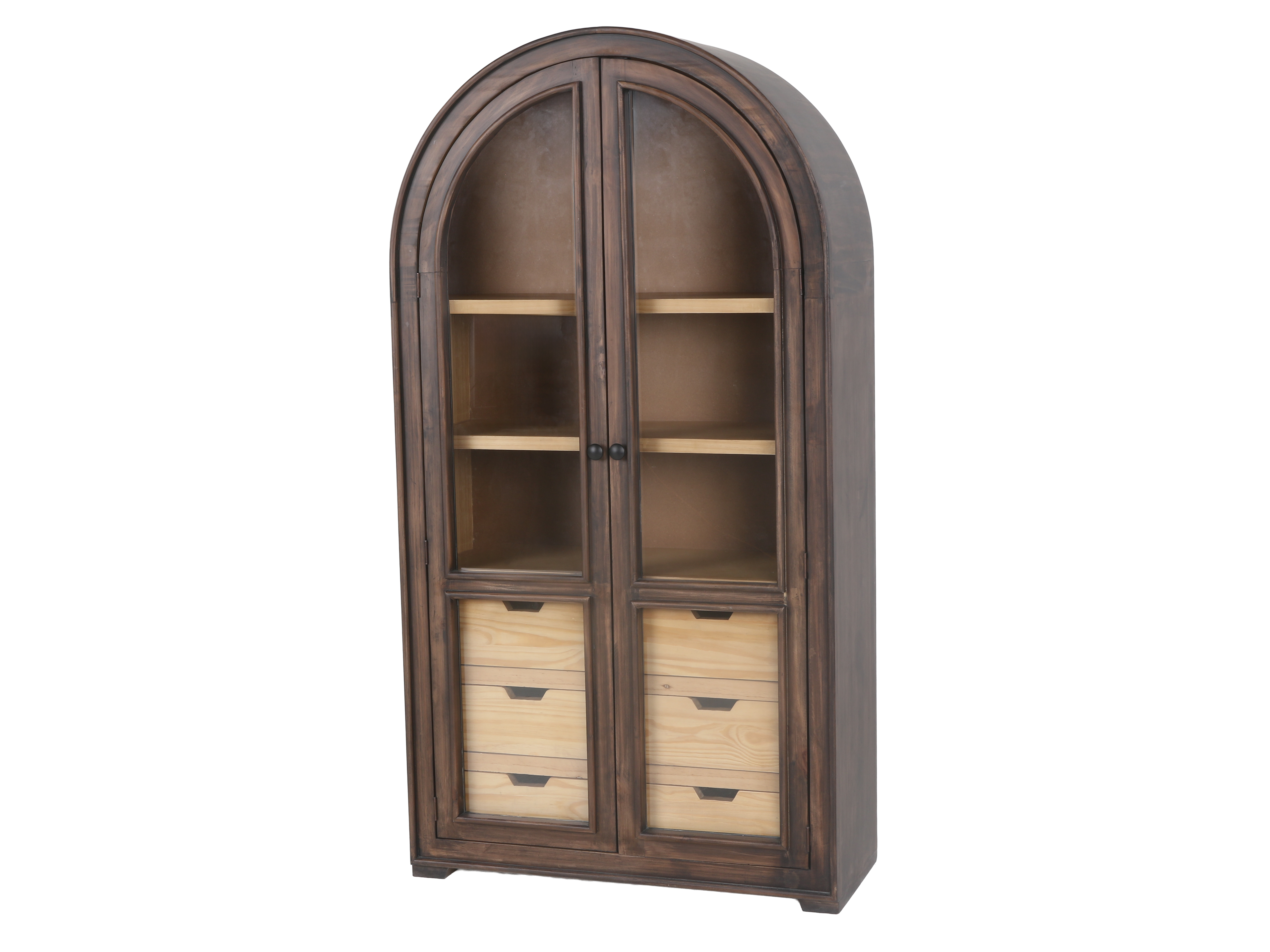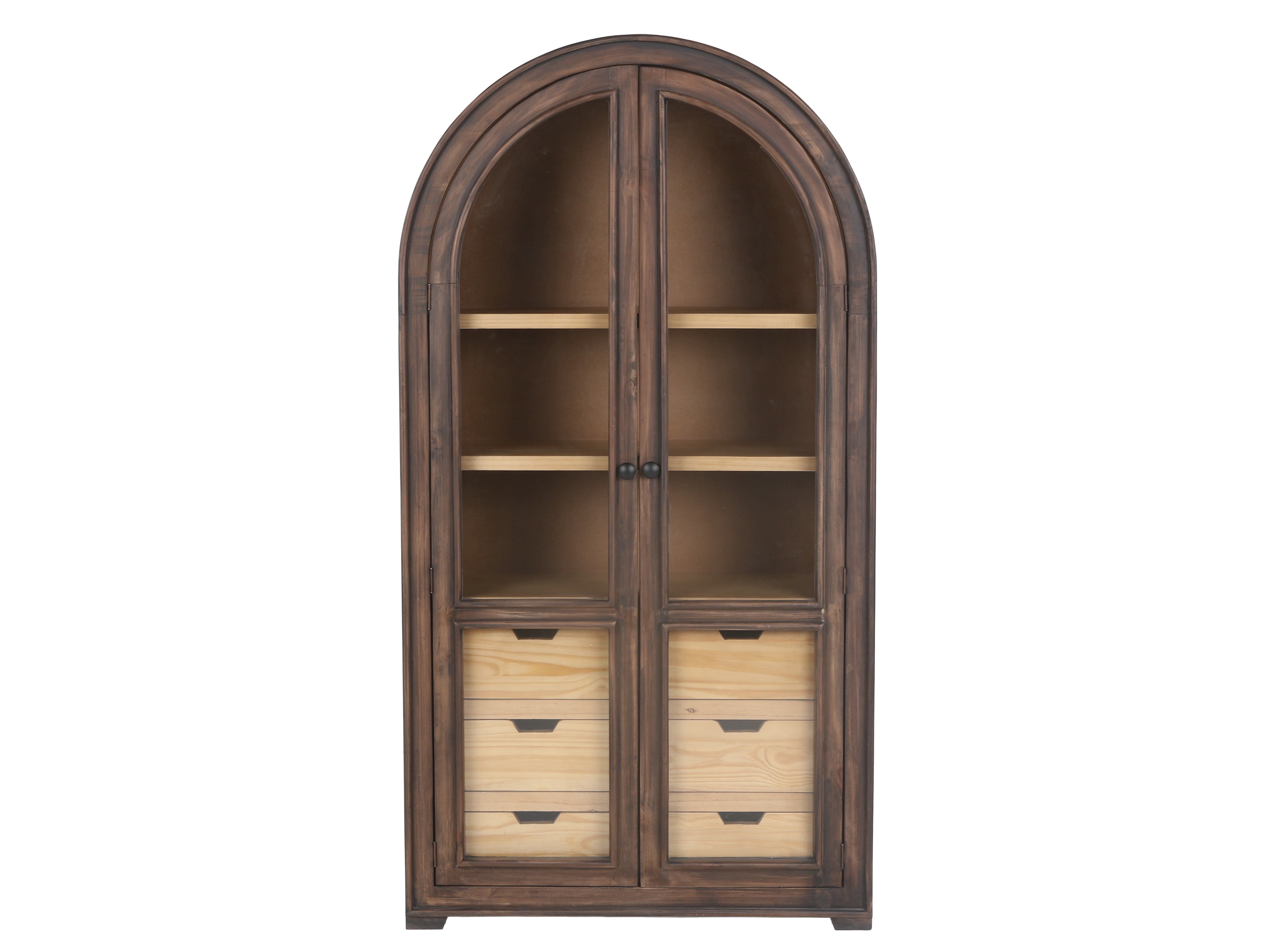 Rustic Brown Arched Glass Door Curio Cabinet with 6 Drawers