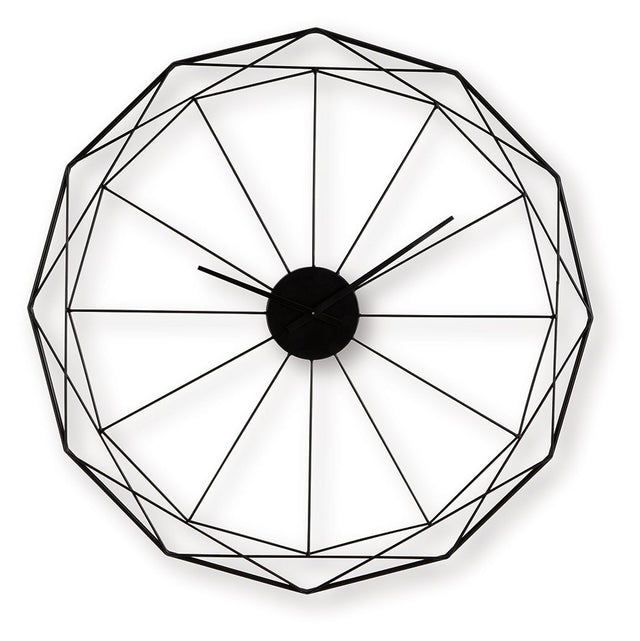 Cool, contemporary style with an industrial edge. This wall clock incorporates eye-catching geometry into your decor. A sleek blend of form and function, it expertly balances the edgy look of black metal with an open and airy design.