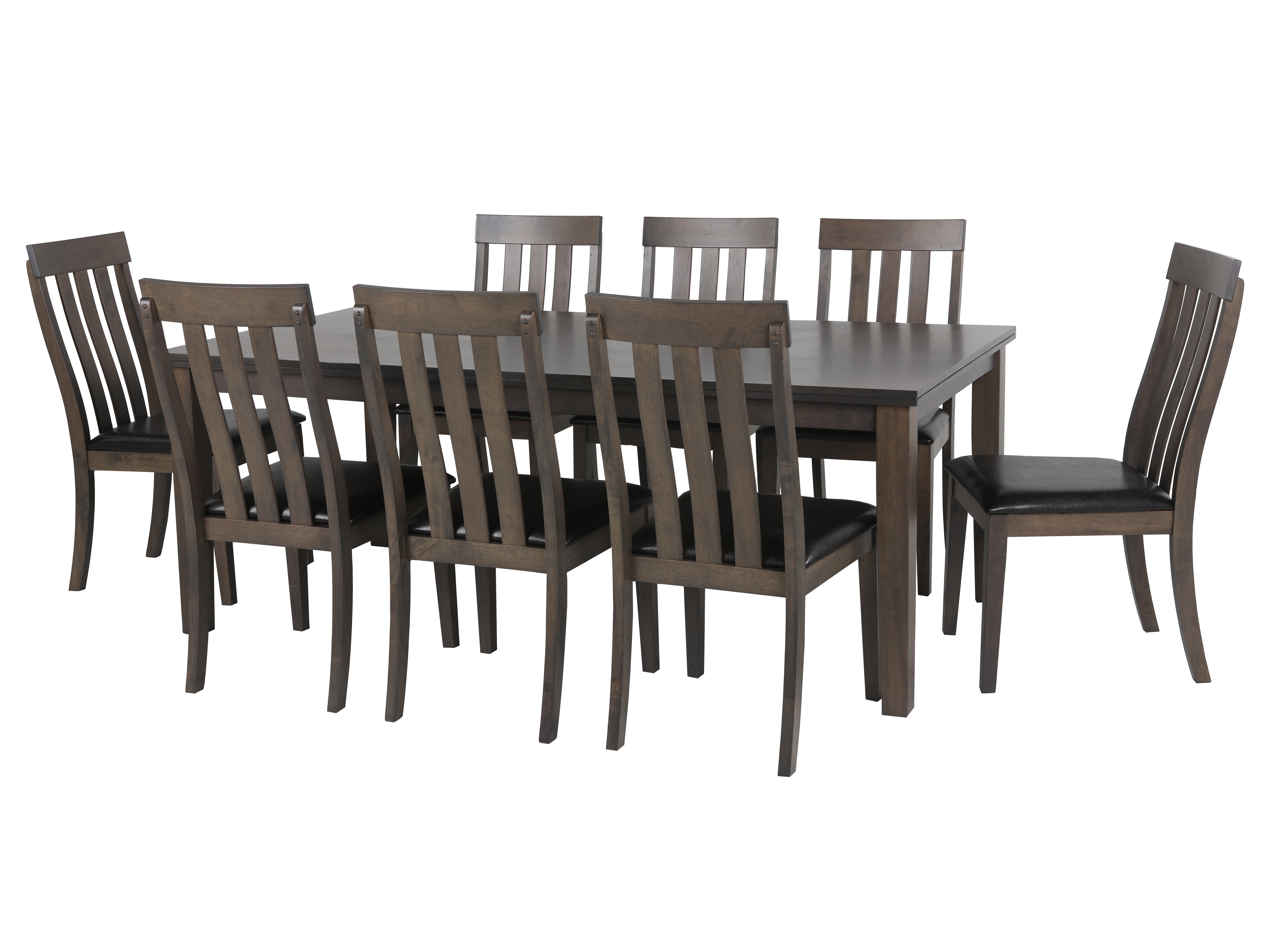 This 9 piece dining room set includes a rectangular dining table and eight dining chairs, providing ample seating for large gatherings. The table features a sturdy engineered wood tabletop, supported by four solid wood legs, ensuring durability and stability. The chairs boast a classic ladder style back with slats, offering both comfort and style. With its timeless design and high-quality materials, this dining set is sure to be a cherished centerpiece in your home for years to come.
