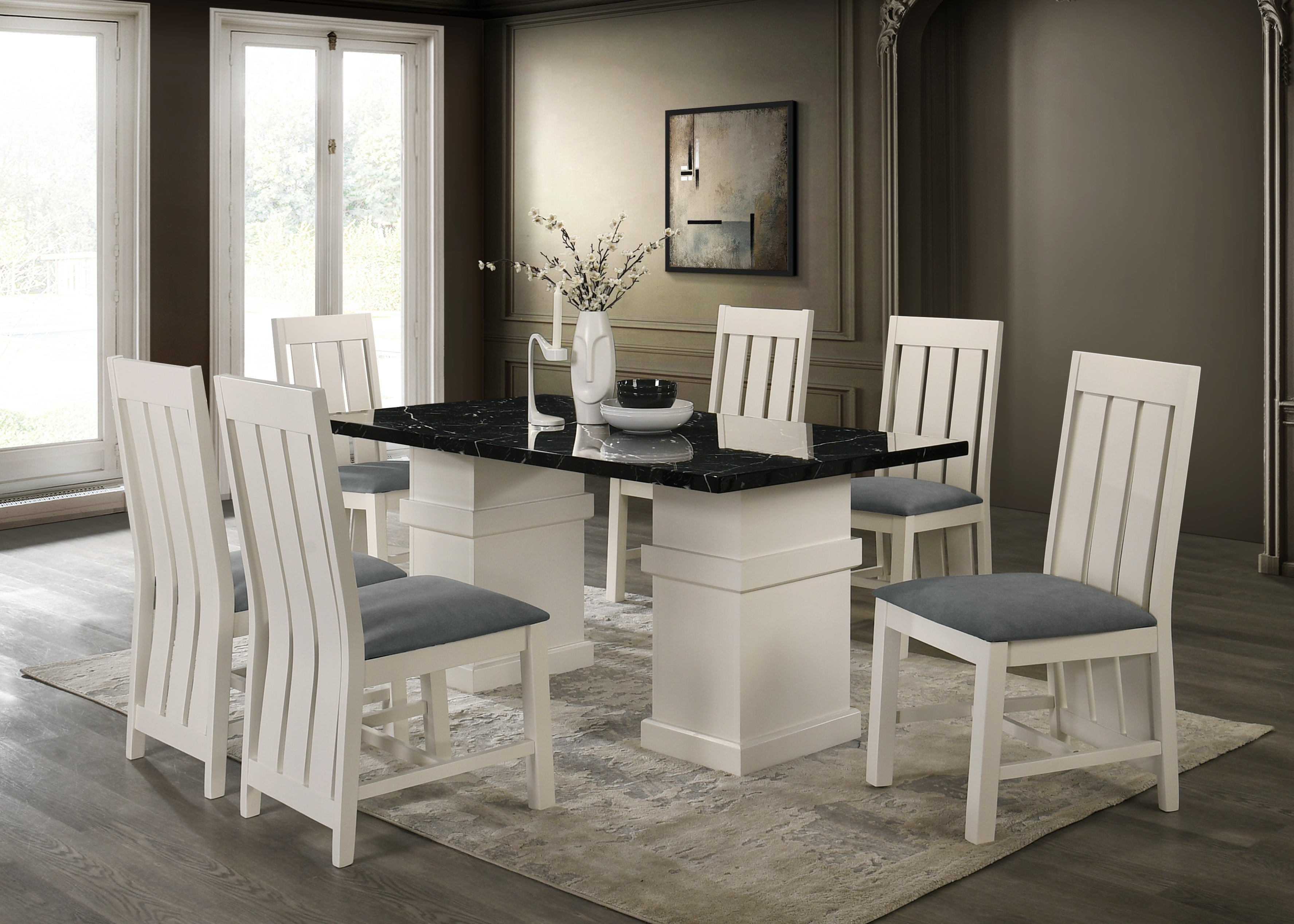 Transform your dining space into a statement of refined sophistication with this stunning 7-piece dining set. The striking contrast of a lustrous black faux marble tabletop paired with architectural white double-pedestal bases creates an unmistakably elegant aesthetic that elevates any interior.