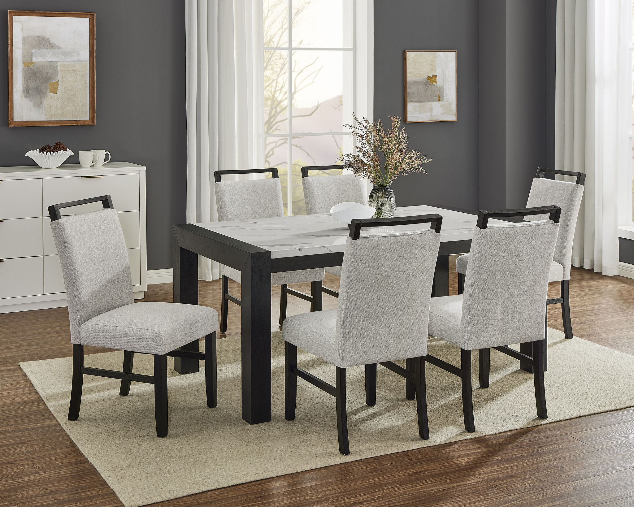 This contemporary dining group offers a clean, sophisticated aesthetic with a perfect balance of contrast and simplicity. The sleek table features a faux marble top that delivers a touch of elegance, while the bold, dark wood frame adds depth and stability. Coordinating chairs and bench are upholstered in a soft, light-toned fabric that enhances comfort and complements the neutral palette, making it easy to style with various décor themes. Ideal for both casual meals and formal gatherings, this set brings modern refinement and everyday functionality to the heart of the home.