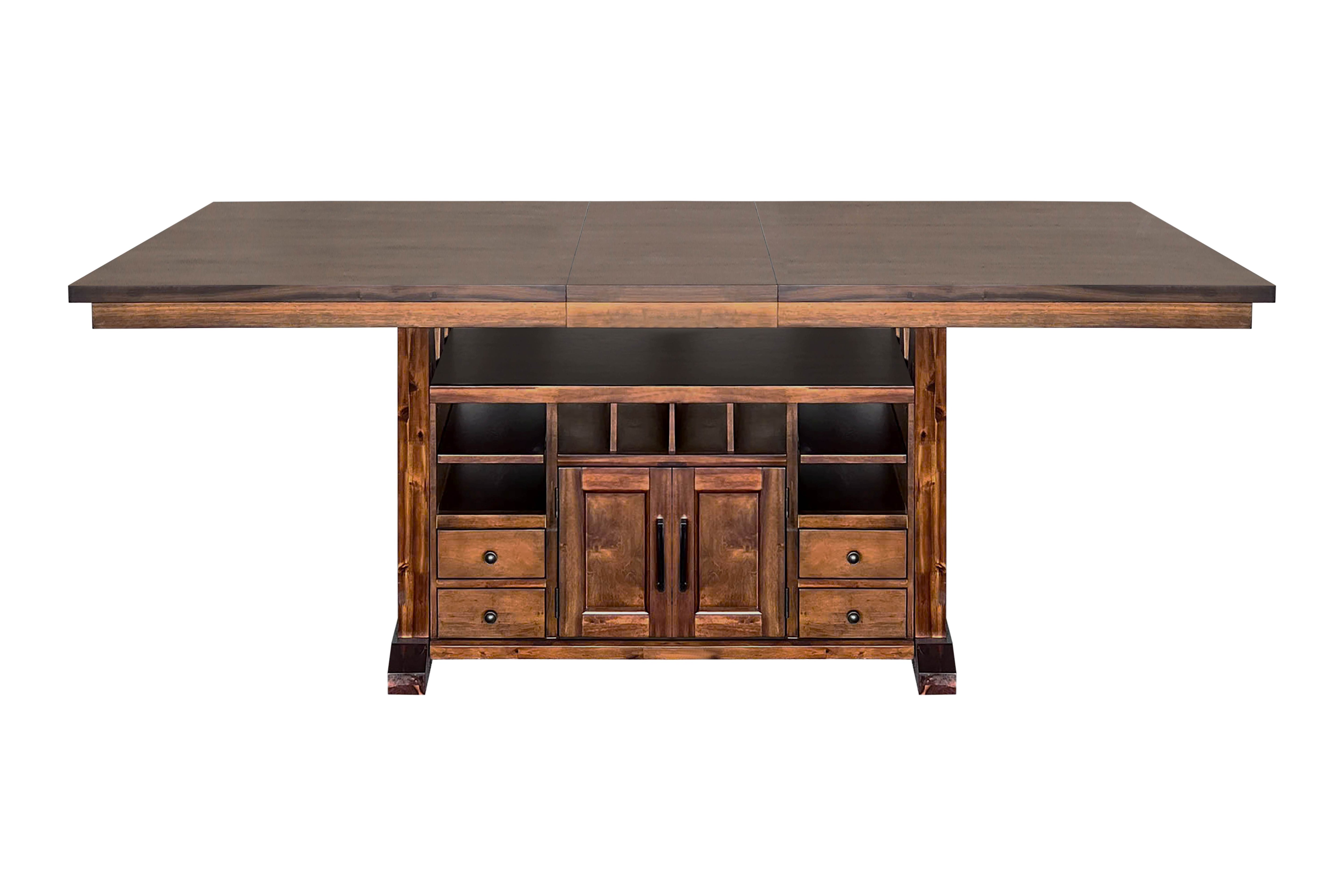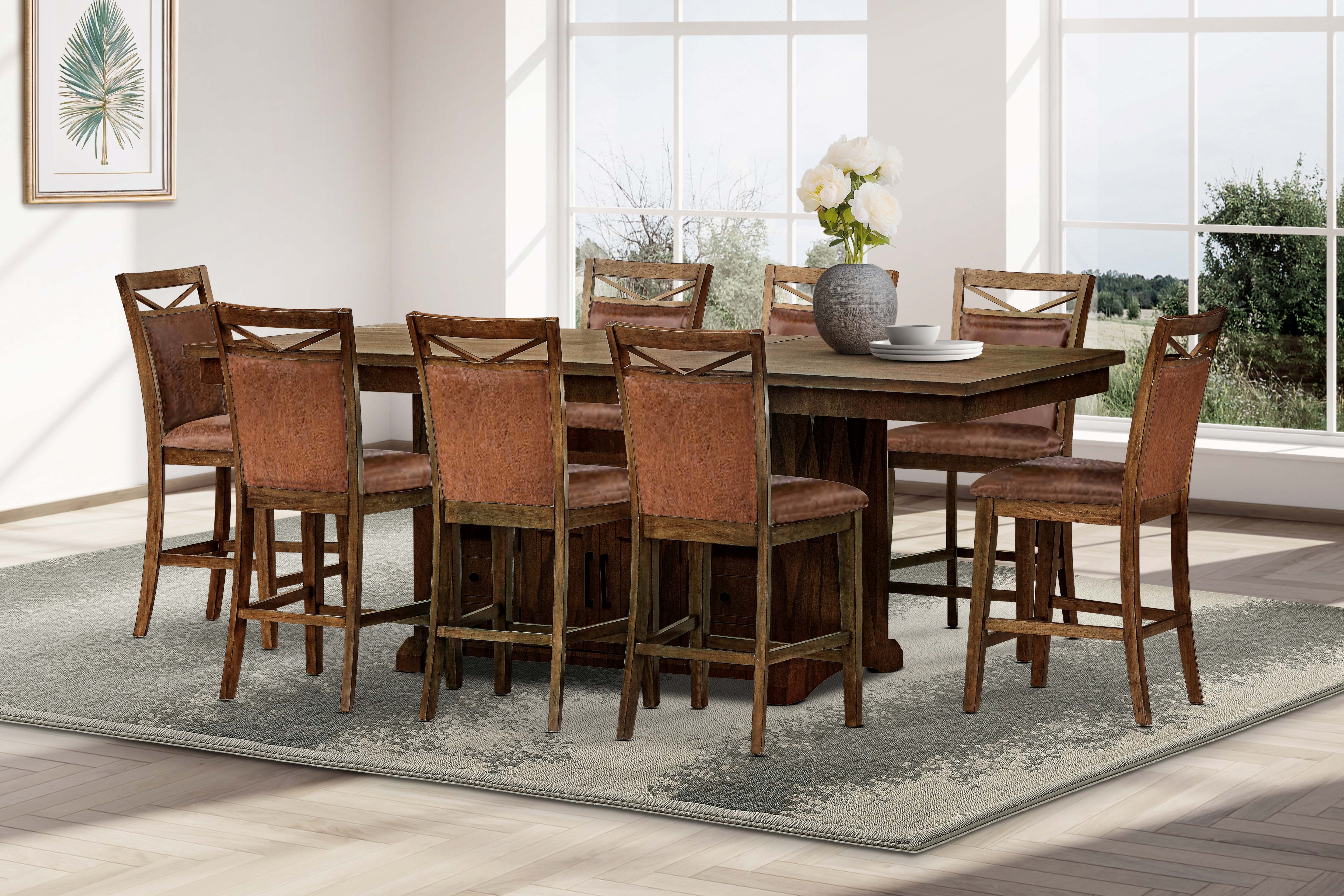 Upgrade your dining experience with this 9-piece rustic counter height dining set, perfect for large family gatherings or entertaining friends. The centerpiece is a stunning pub table featuring a rich brown finish, crafted with a durable MDF top accented by acacia veneer, and a sturdy rubberwood base. The table includes two leaves, expanding up to 96 inches, and boasts a unique storage base with drawers, shelves, and wine cubbies—ideal for keeping your dining essentials organized and within reach.