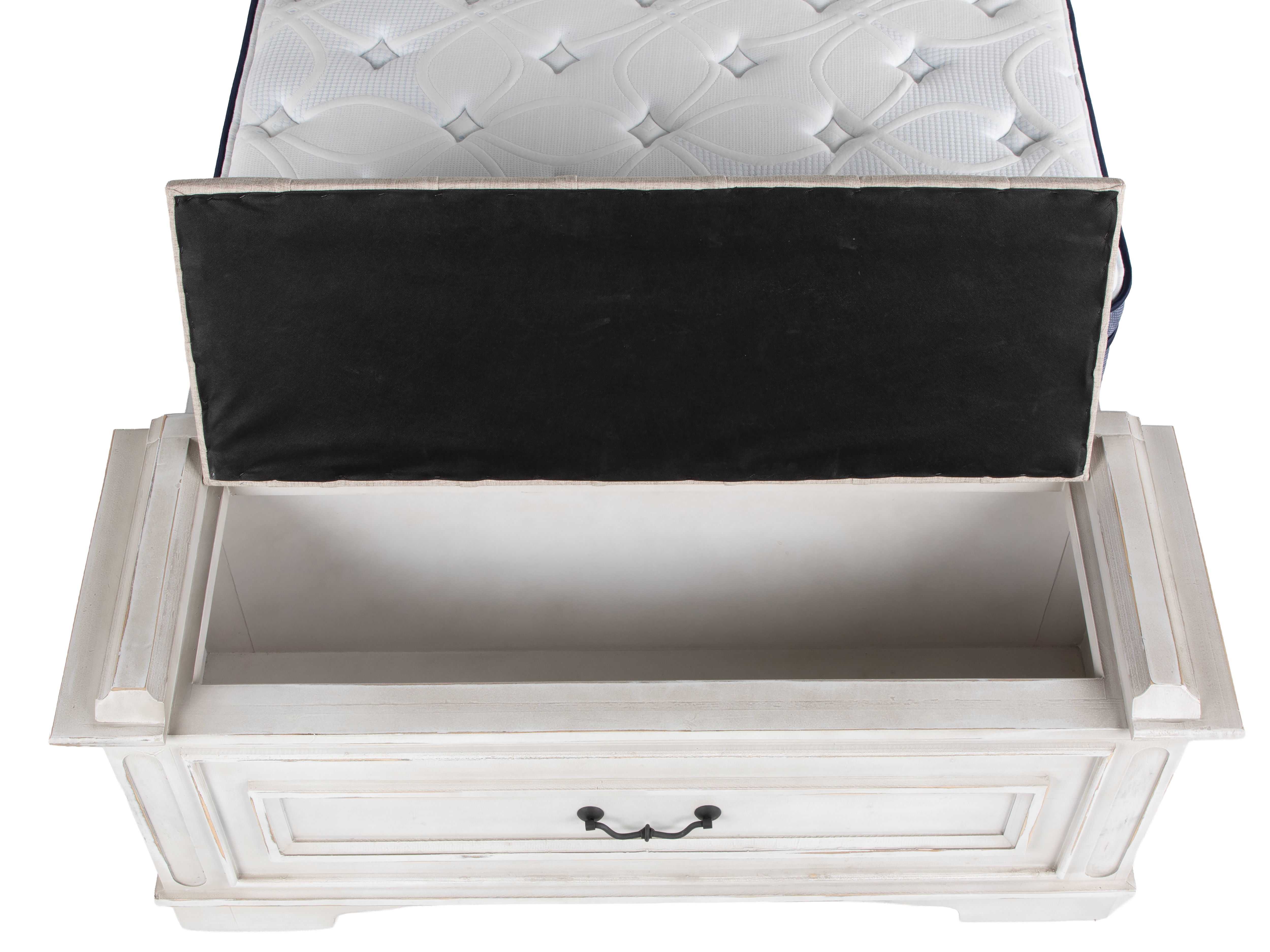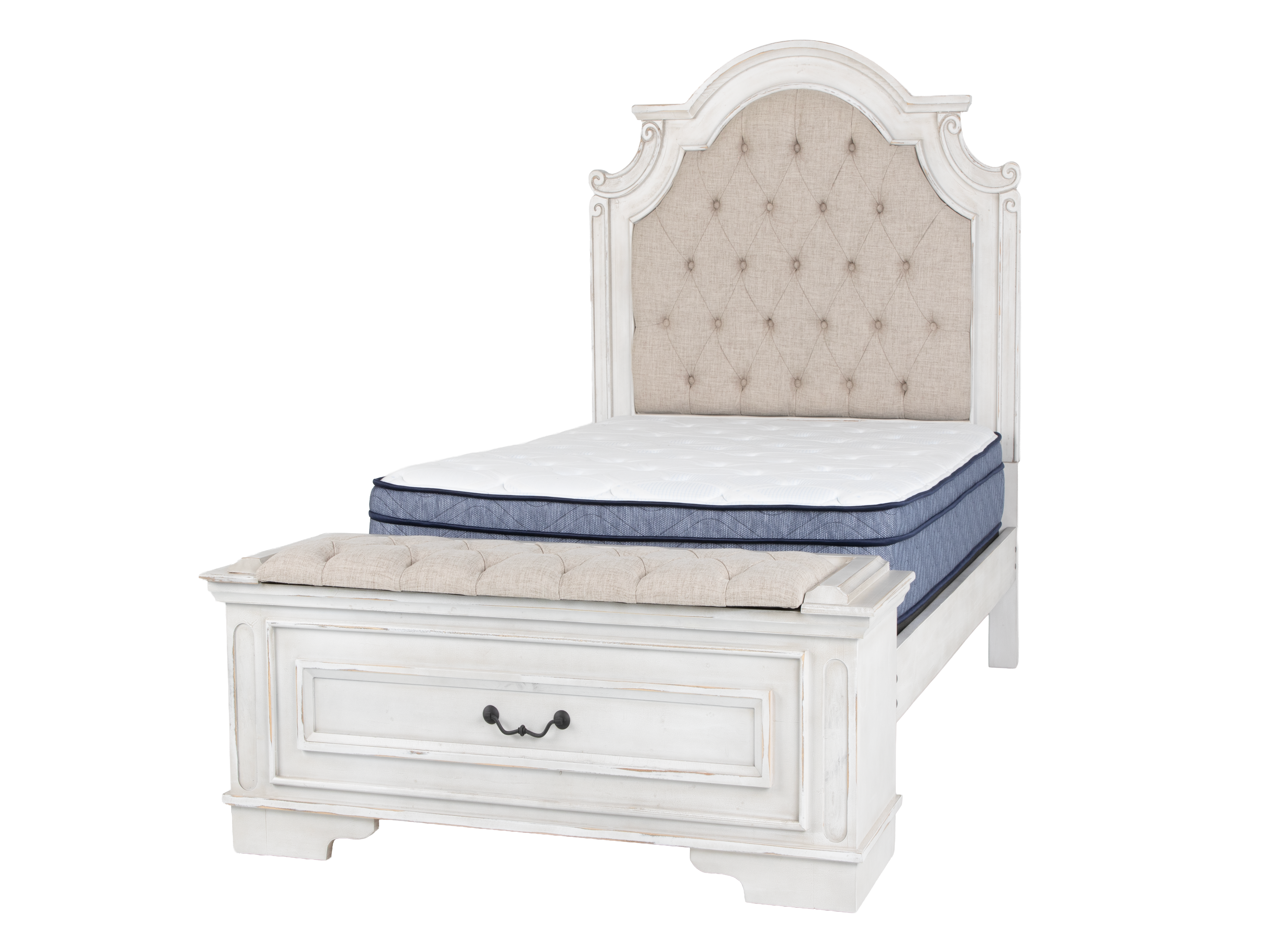 - Storage Bench Footboard: Features a full-width front drawer with dark iron bail-pull hardware plus a lift-top tufted cushion that opens to a deep, fabric-lined storage compartment — perfect for blankets, pillows, and linens.