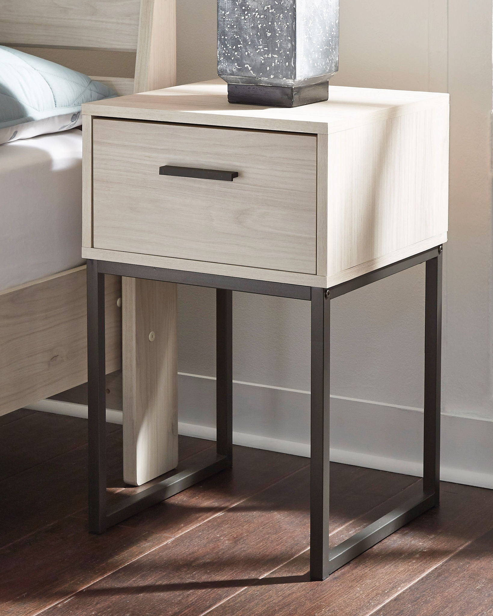 A finish over replicated oak grain with authentic touch. Contemporary handles in a dark colored finish. Spacious drawers with ball bearing glides offer a smooth opening and closing of the drawer. Vinyl wrapped drawer sides and back for extra durability.