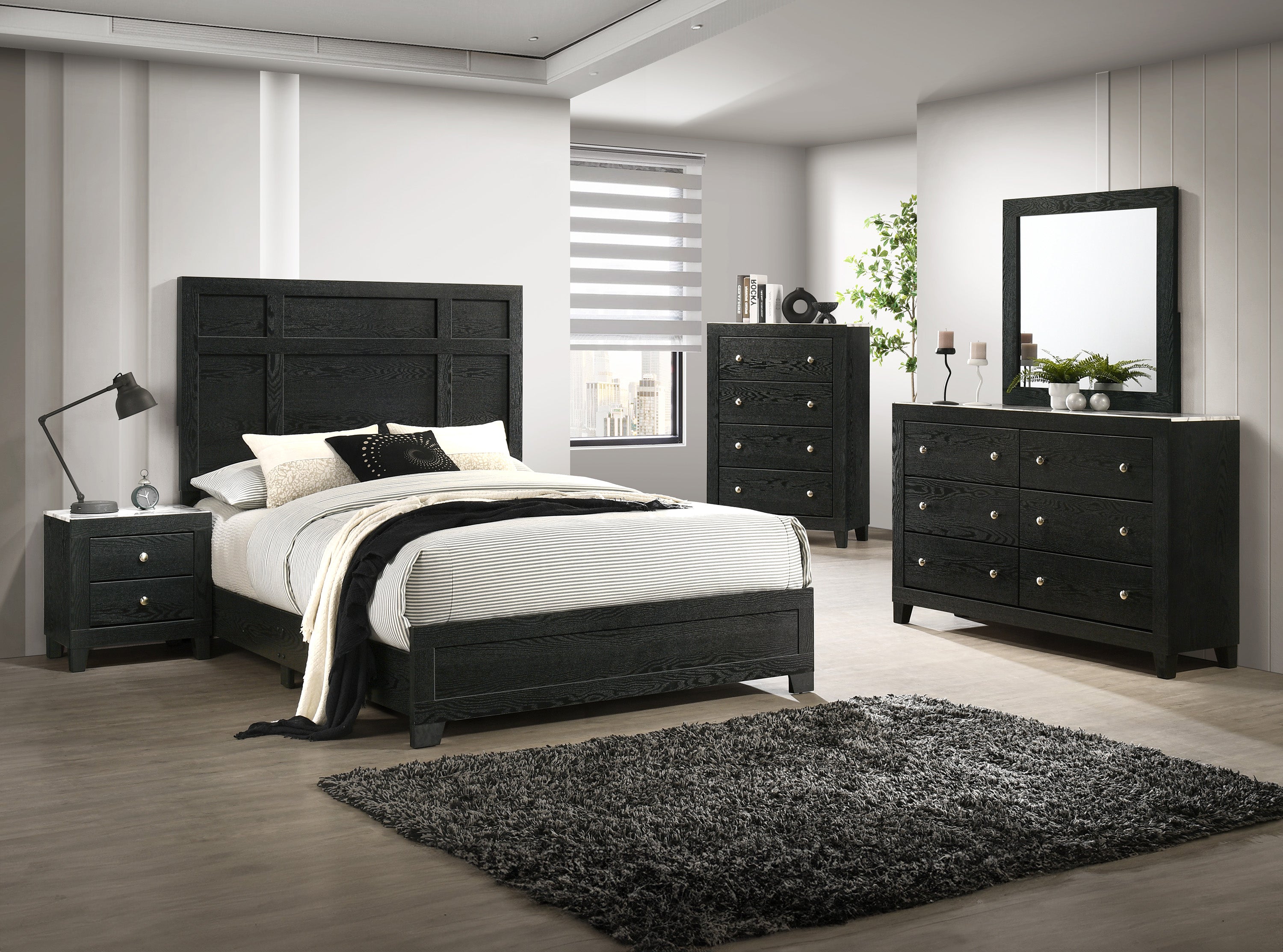 Elevate your sleeping space with this luxurious bedroom suite that perfectly blends modern design with classic elegance. The rich, dark finish creates a bold and sophisticated ambiance, while the faux marble tops on the dresser and nightstand add a touch of opulence and refinement. Crafted with meticulous attention to detail, each piece boasts sleek lines and high-quality hardware, ensuring both style and longevity. The collection offers ample storage solutions to keep your space organized and serene. Transform your bedroom into a chic retreat where comfort meets contemporary charm.. Board and batten headboard Wood grain detail Complete bed frame in one box Complete bed frame in one box