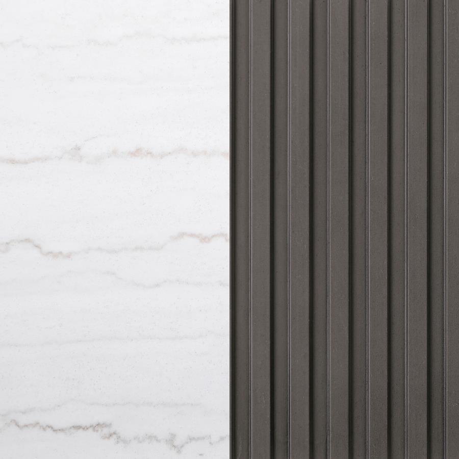Center your living space with this elegant, modern round table. The genuine marble top exudes sophistication with its subtle veining, adding organic flair. The clean, light coloration complements any surrounding decor. A ribbed, engineered wood frame in a charcoal finish creates texture and depth, while the brushed gold metal base brings a luxurious touch. This piece seamlessly blends refined materials and design, making it the perfect addition to your living room.