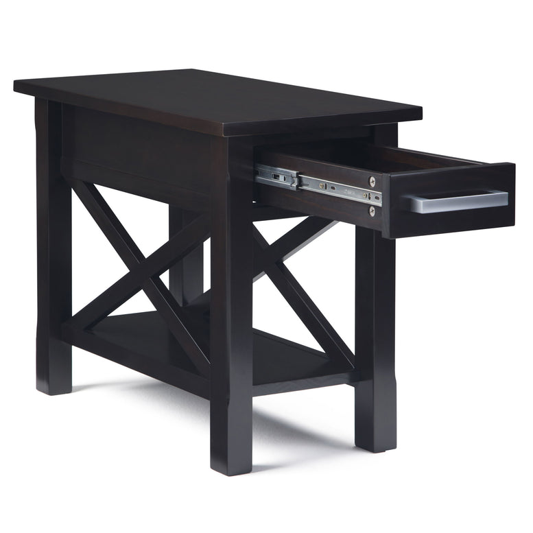 - Features one large drawer with metal drawer glides and an open bottom shelf providing ample storage space.