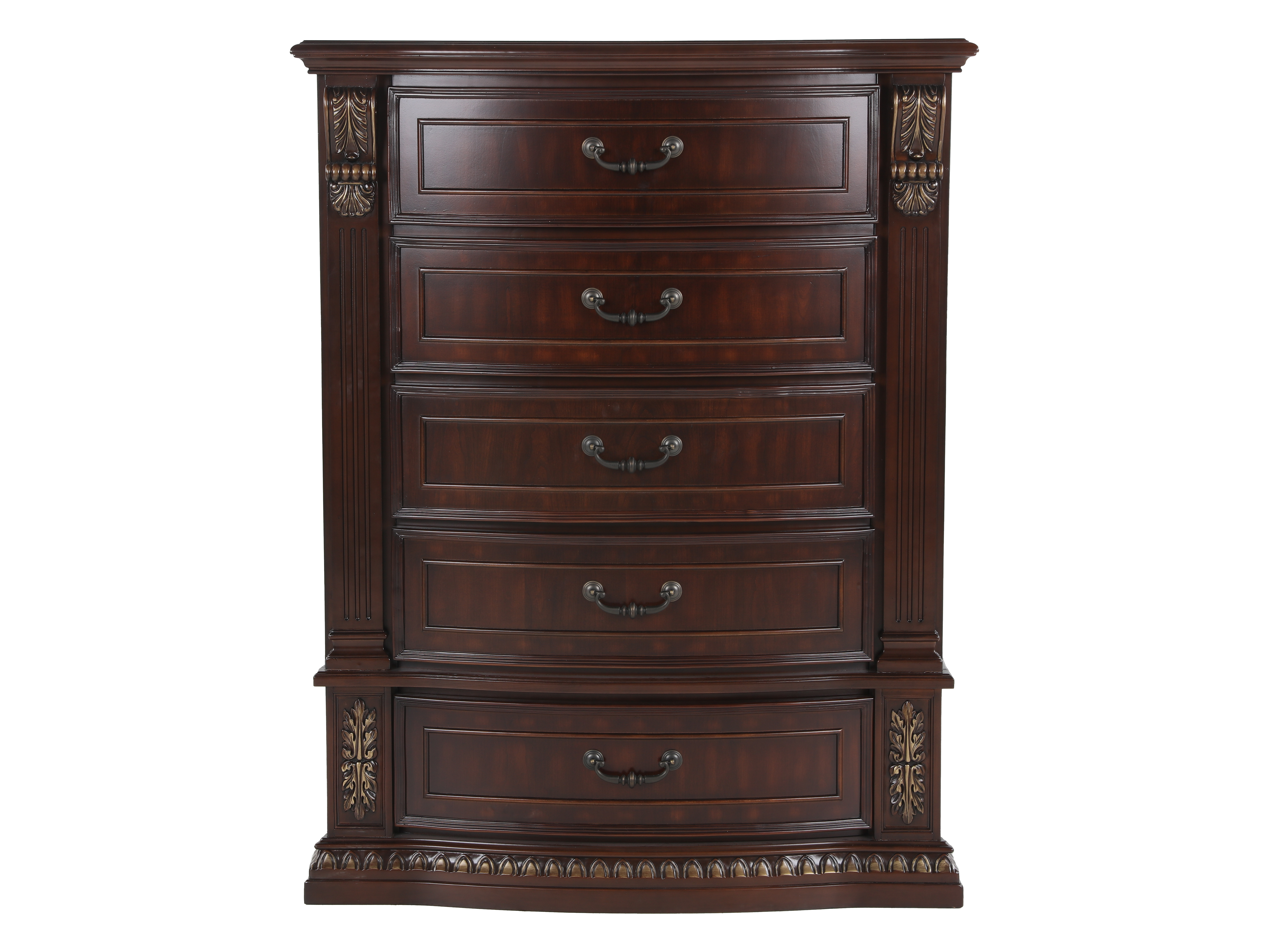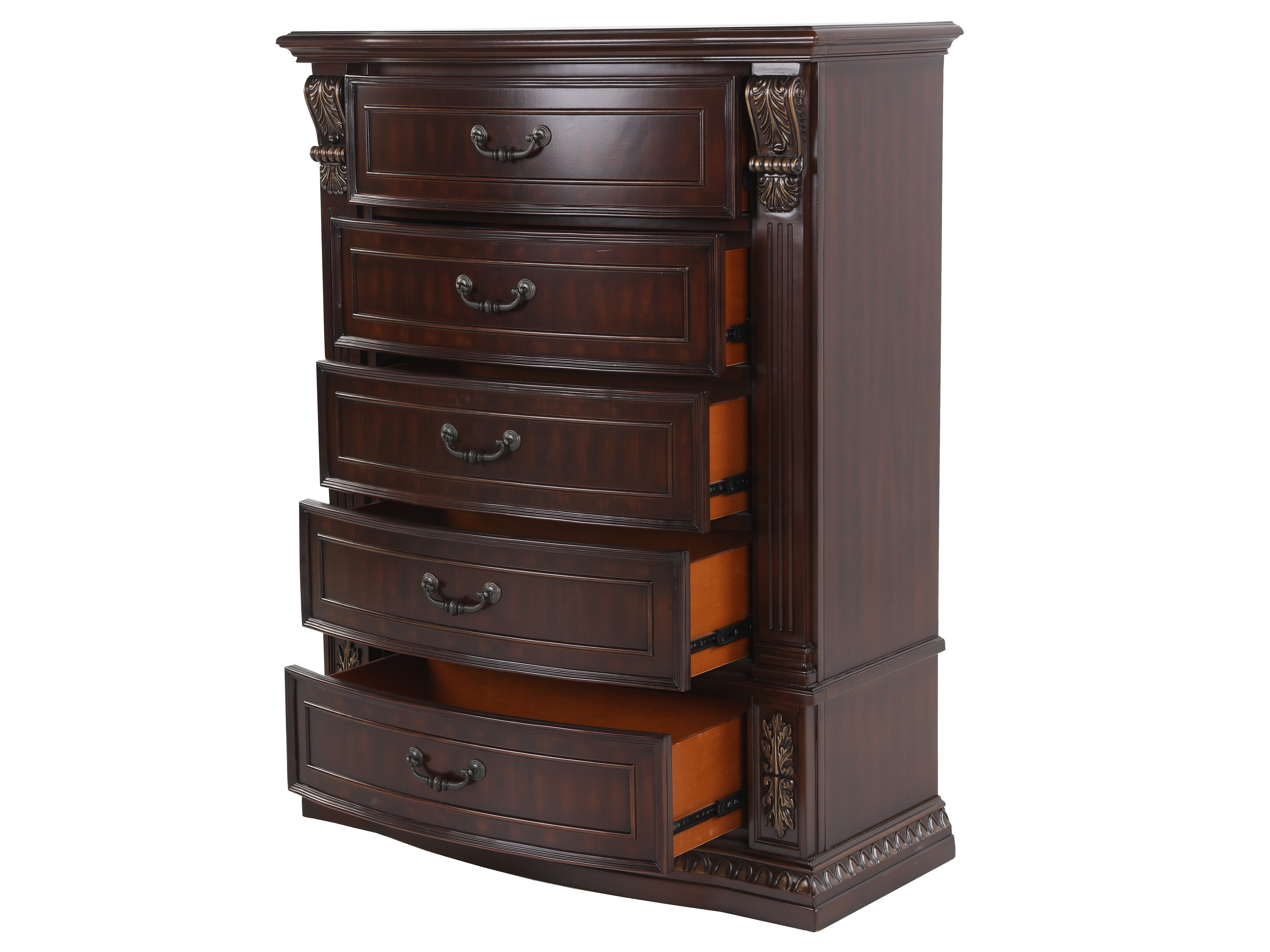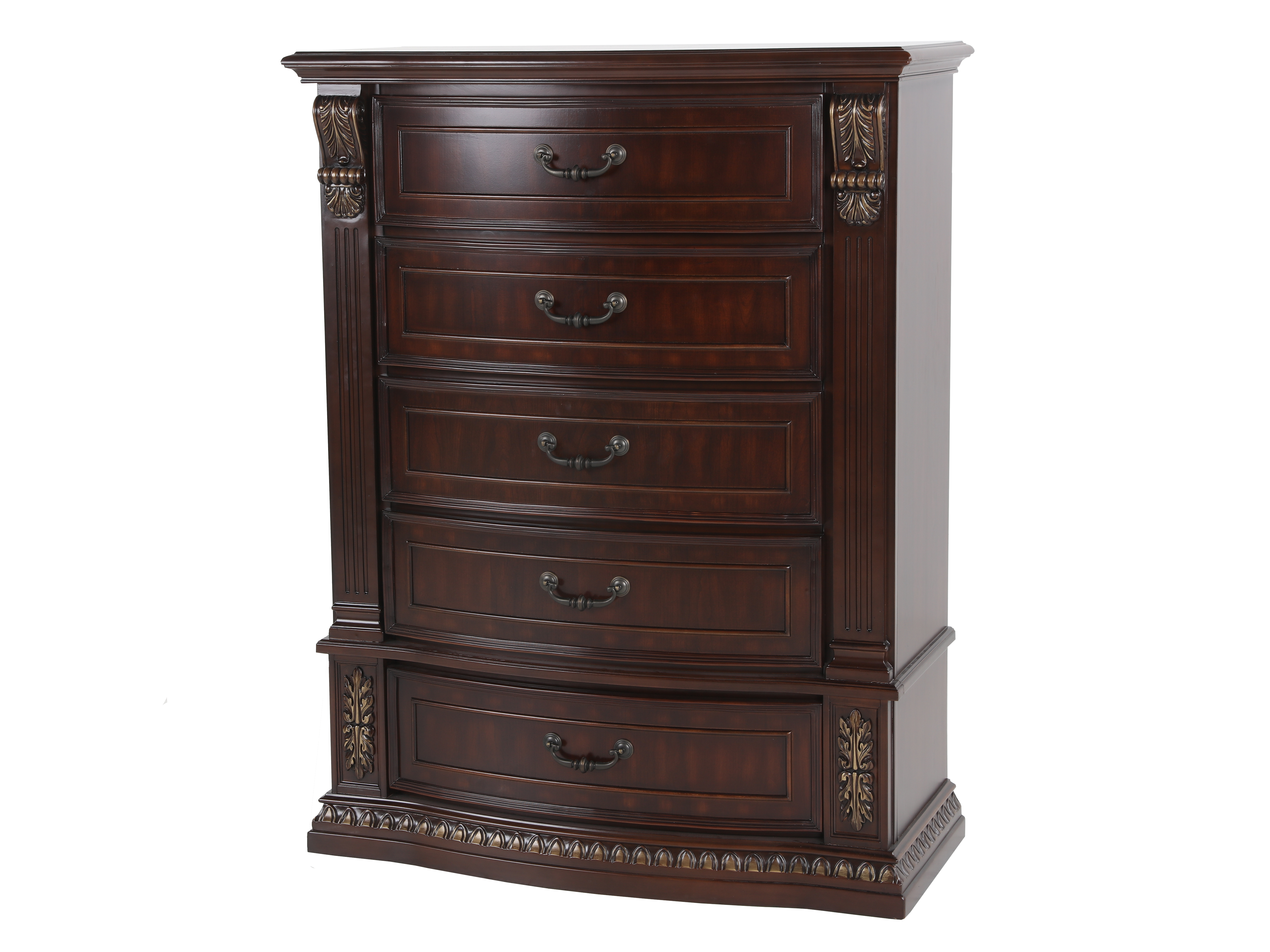 Traditional with ornate carved details, fluted pilasters, and antique-style metal hardware in a warm cherry finish.
