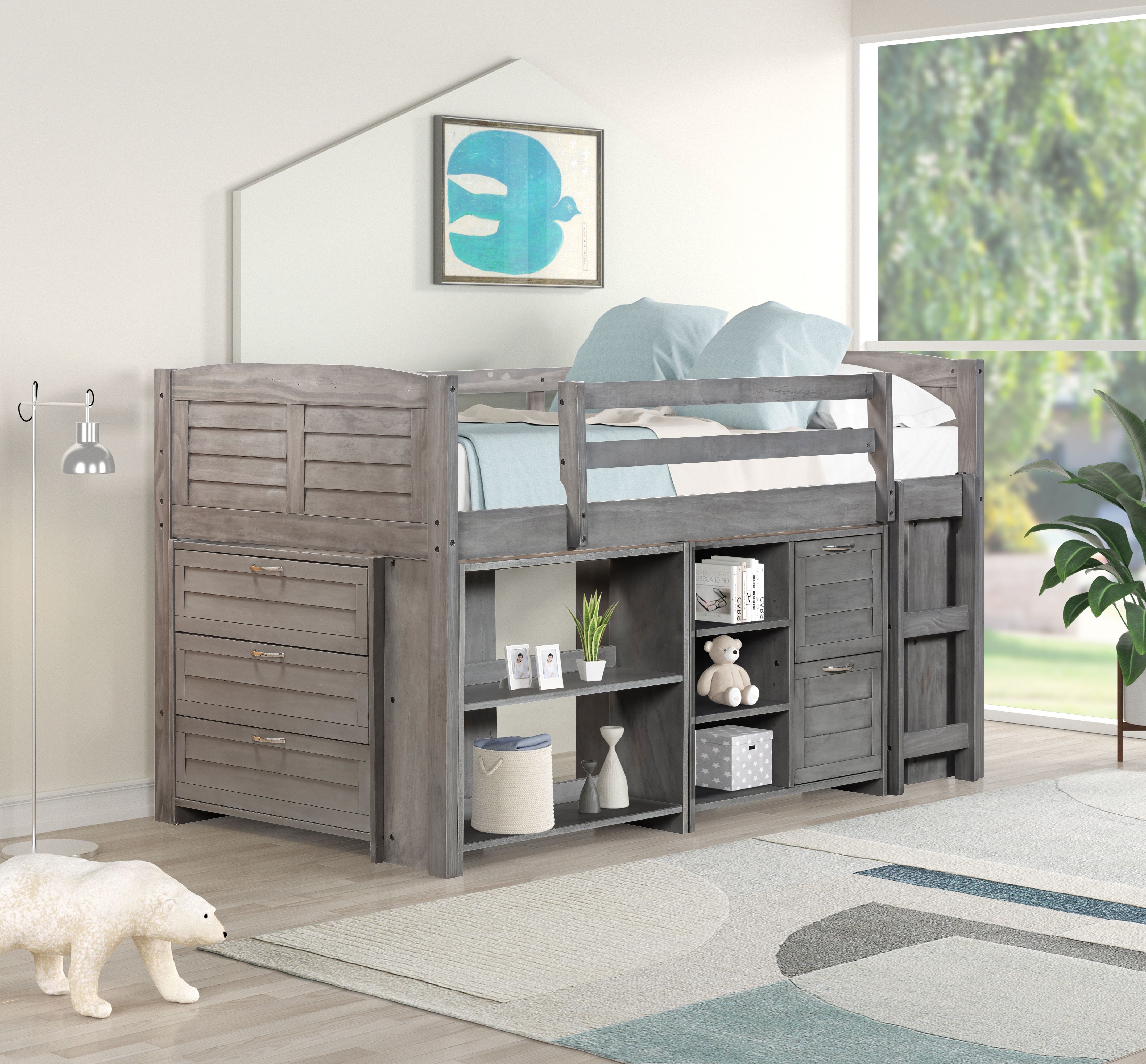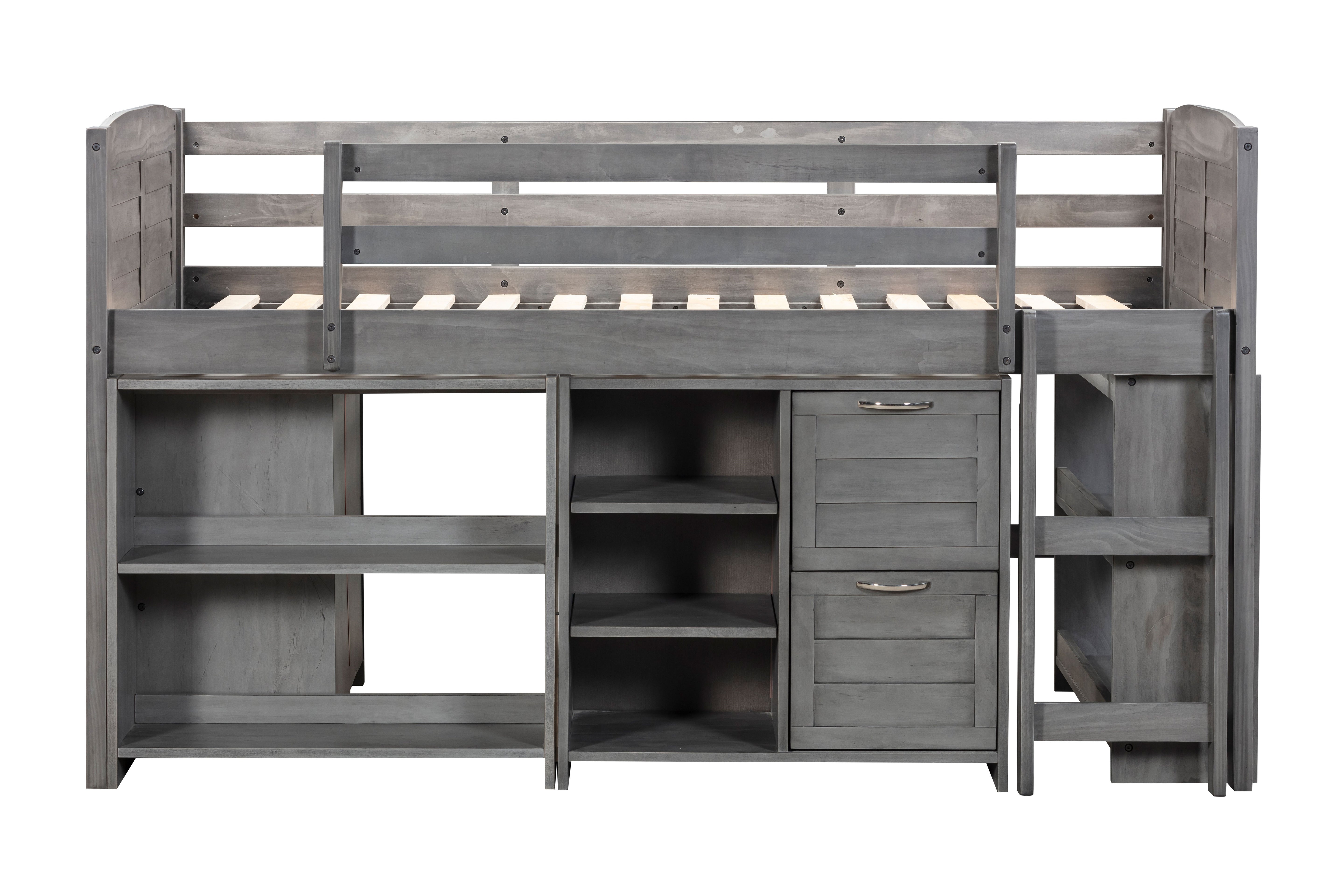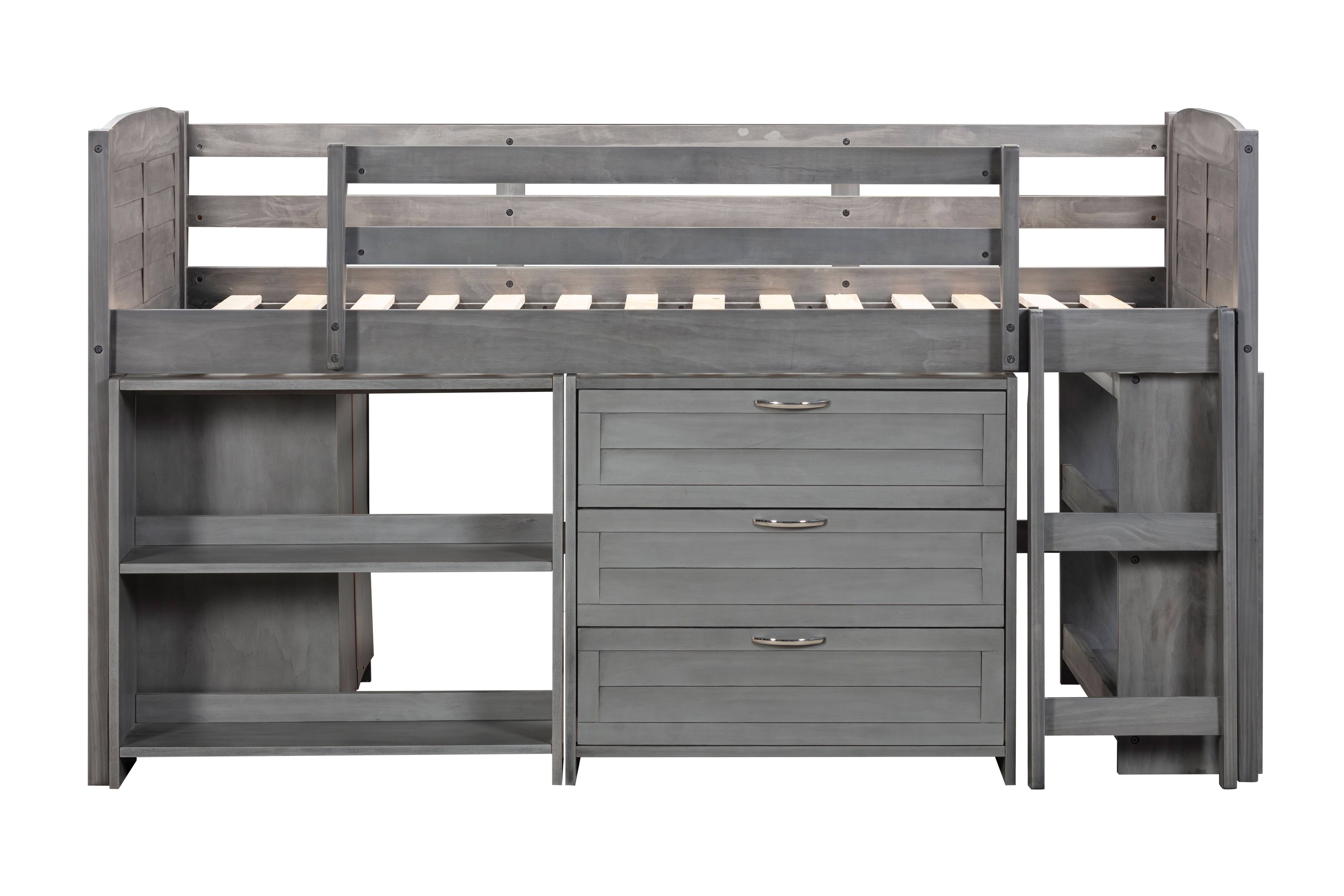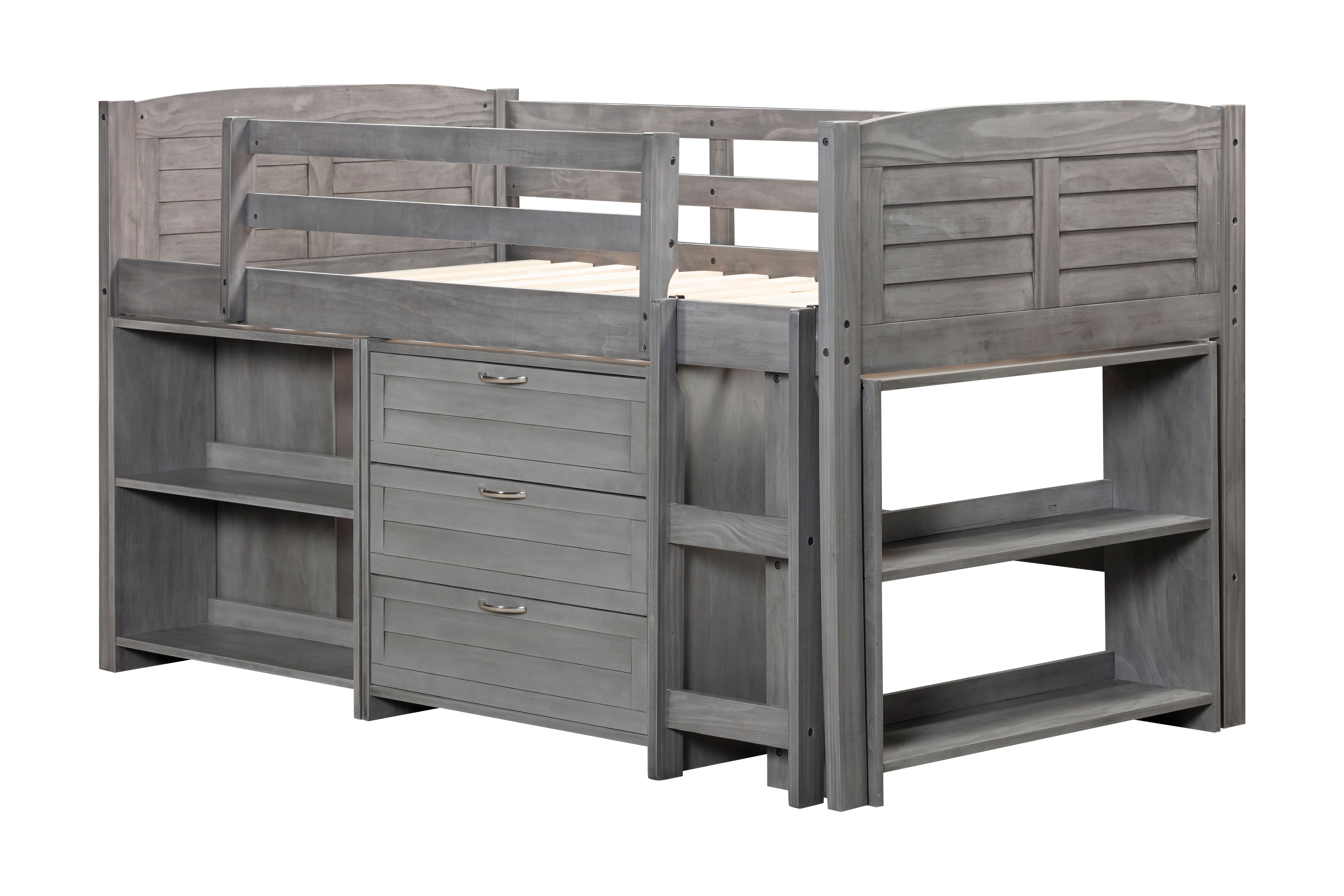 This loft bed is an excellent addition to your child's bedroom. It not only provides a fun and imaginative space to play but also features solid pine wood construction with steel hardware connections, ensuring strength, stability, and durability. The bed comes with a ladder for easy access, shelves and storage for organization, and a slat set for mattress stability. The Grey finish adds elegance to any room and the bed comes with a three-drawer chest, a 2-drawer chest, a small bookcase, a ladder, guardrails, and slat mattress supports.