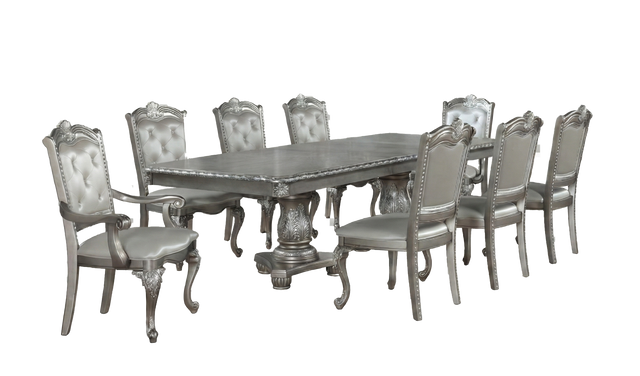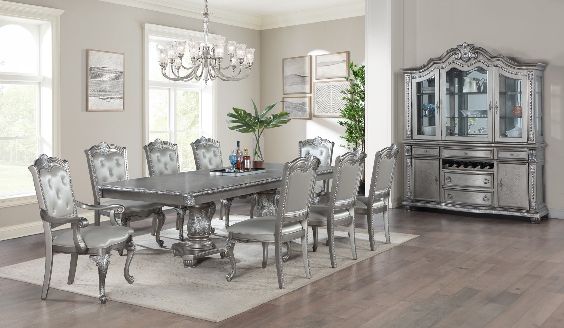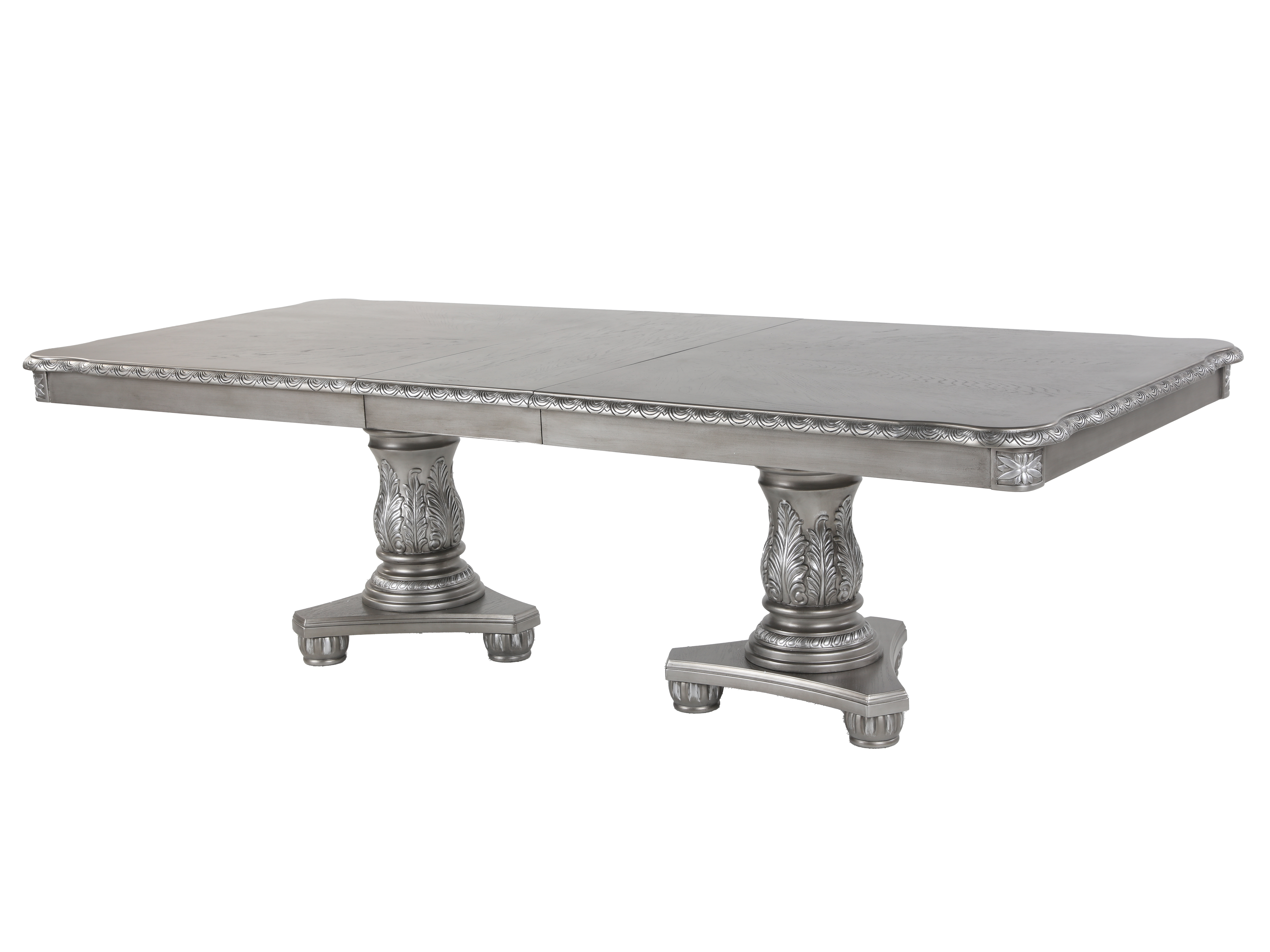 Bring red-carpet glamour to everyday meals with this grey 9-piece double pedestal dining set. A grand rectangular table anchors the room with its oak veneer top, scalloped edges, and intricately carved double pedestals in a soft metallic grey finish. The top features a smooth wooden slide mechanism and center seam, allowing room to add an extension leaf so you can host larger gatherings with ease.