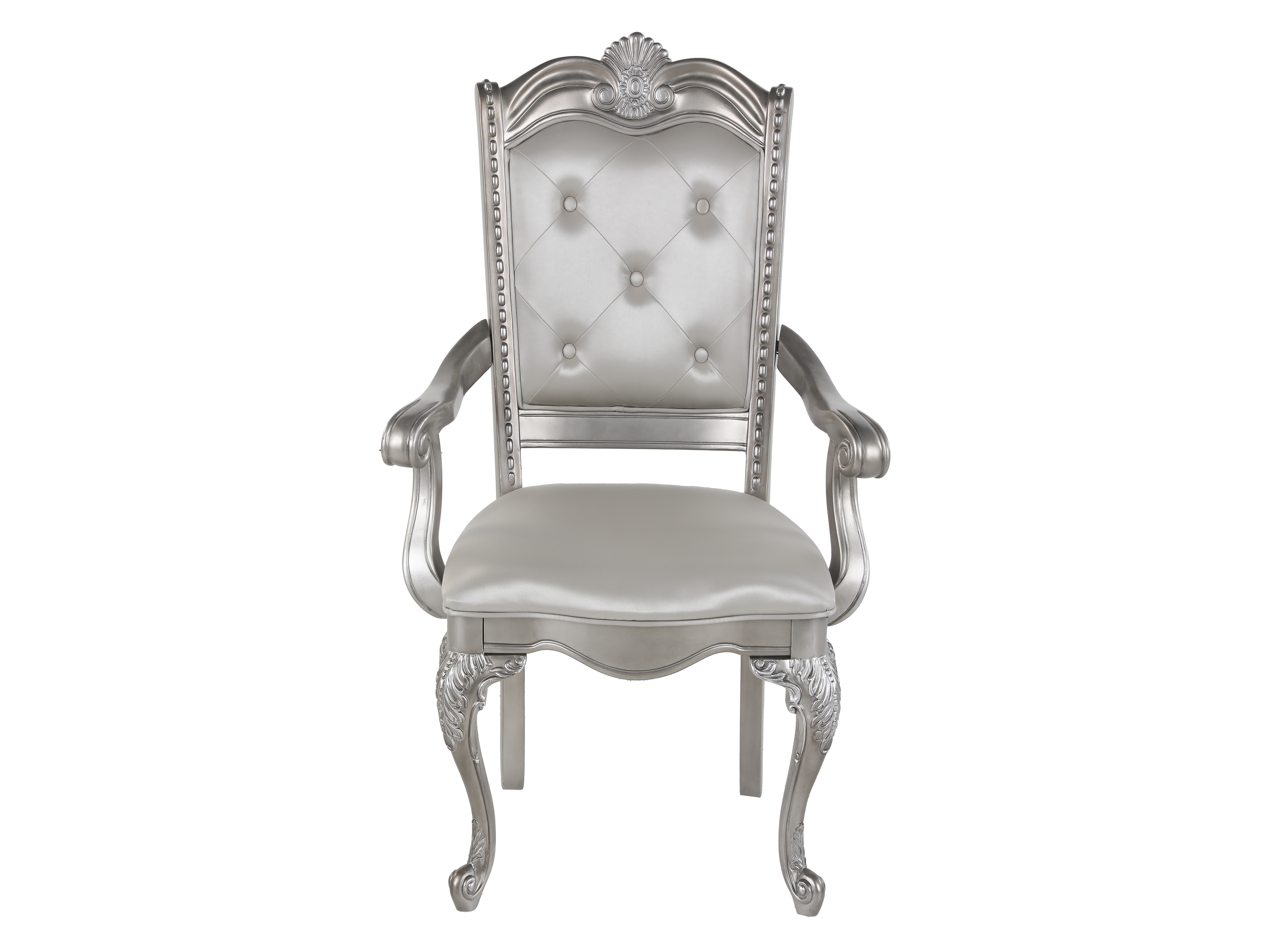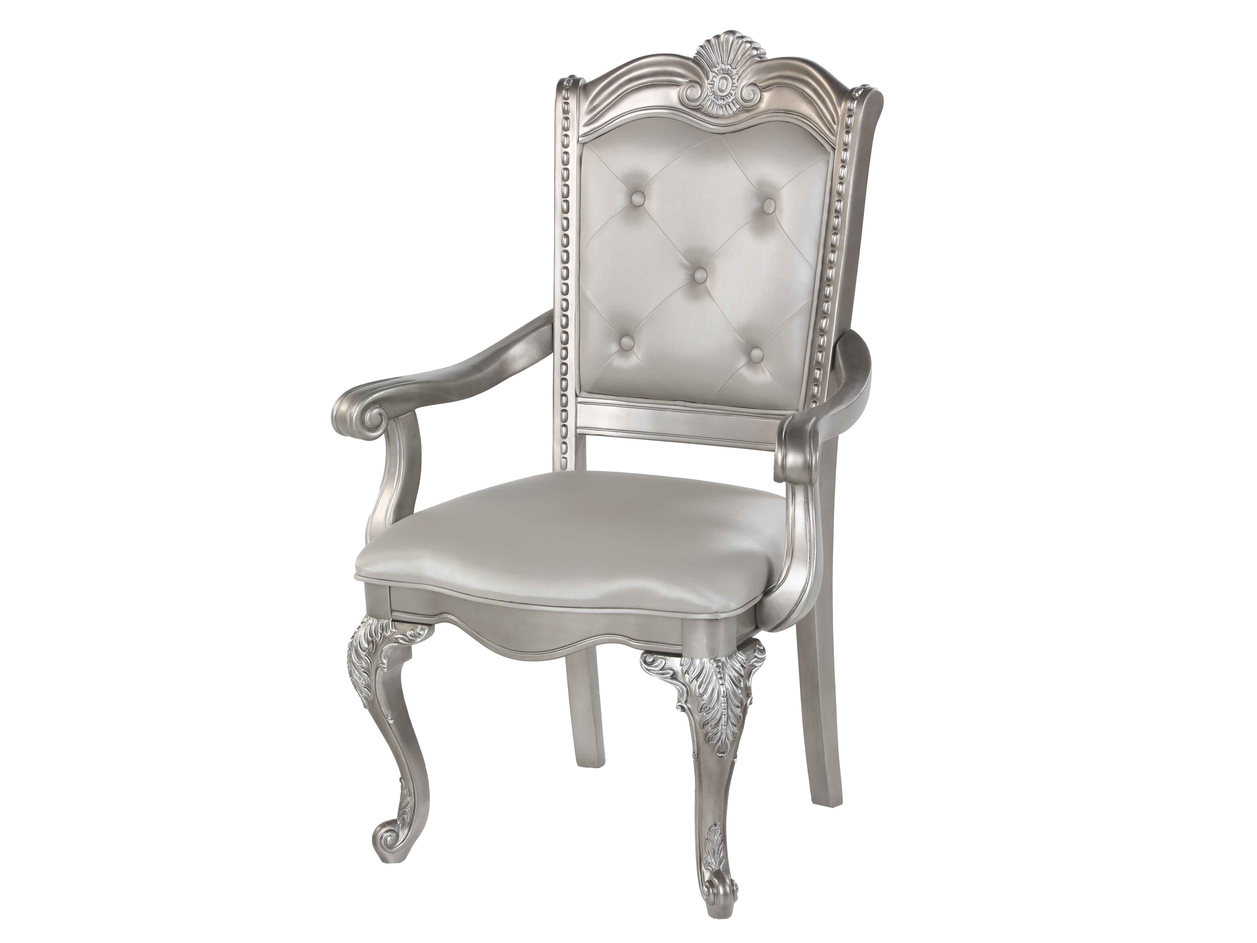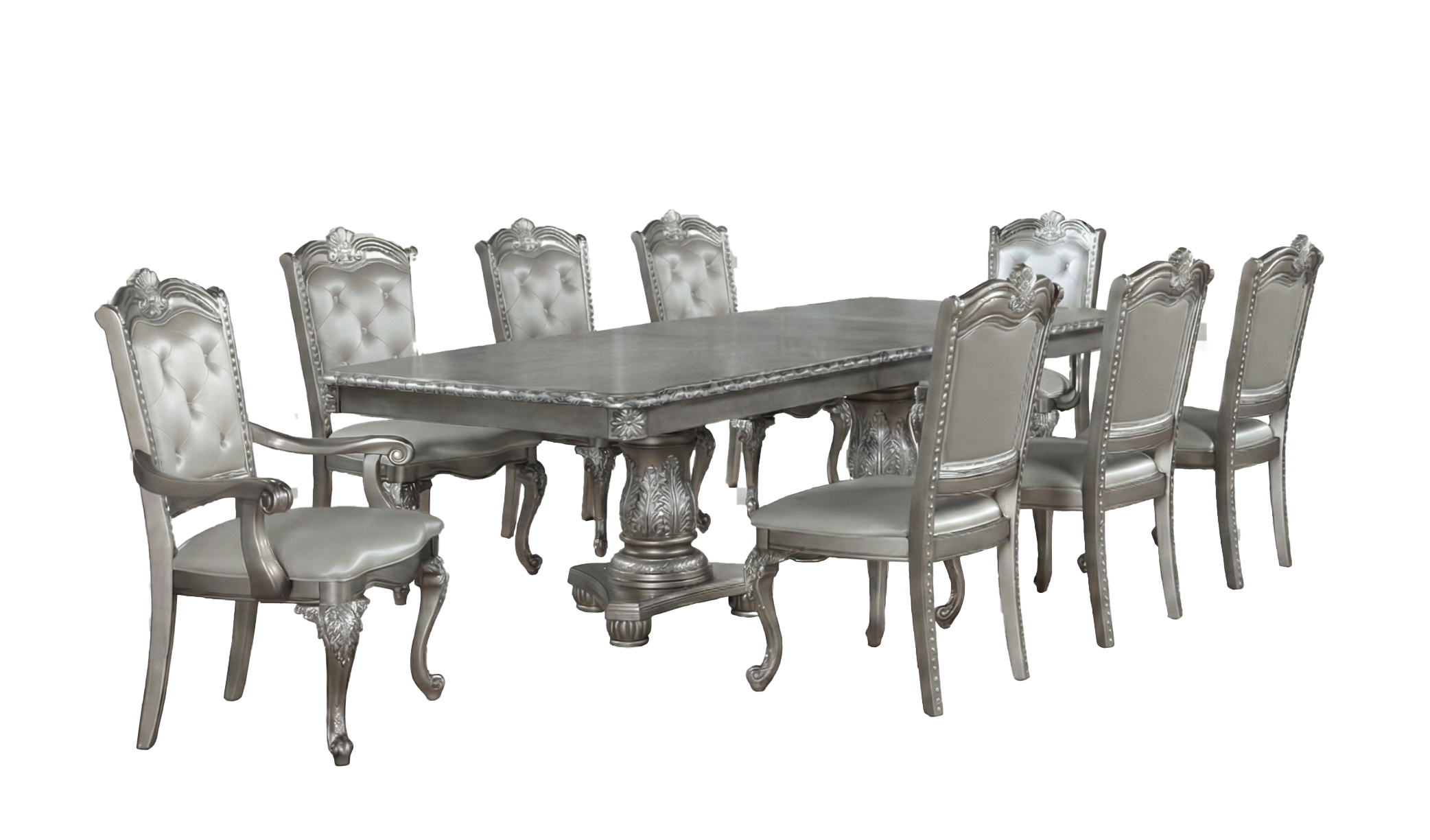 Eight coordinating chairs—six side chairs and two arm chairs—feature luxuriously padded seats and button-tufted backs in silver-grey PU leather. Cabriole legs, scroll arms, and shell carvings echo the ornate details of the table base, creating a cohesive formal look.