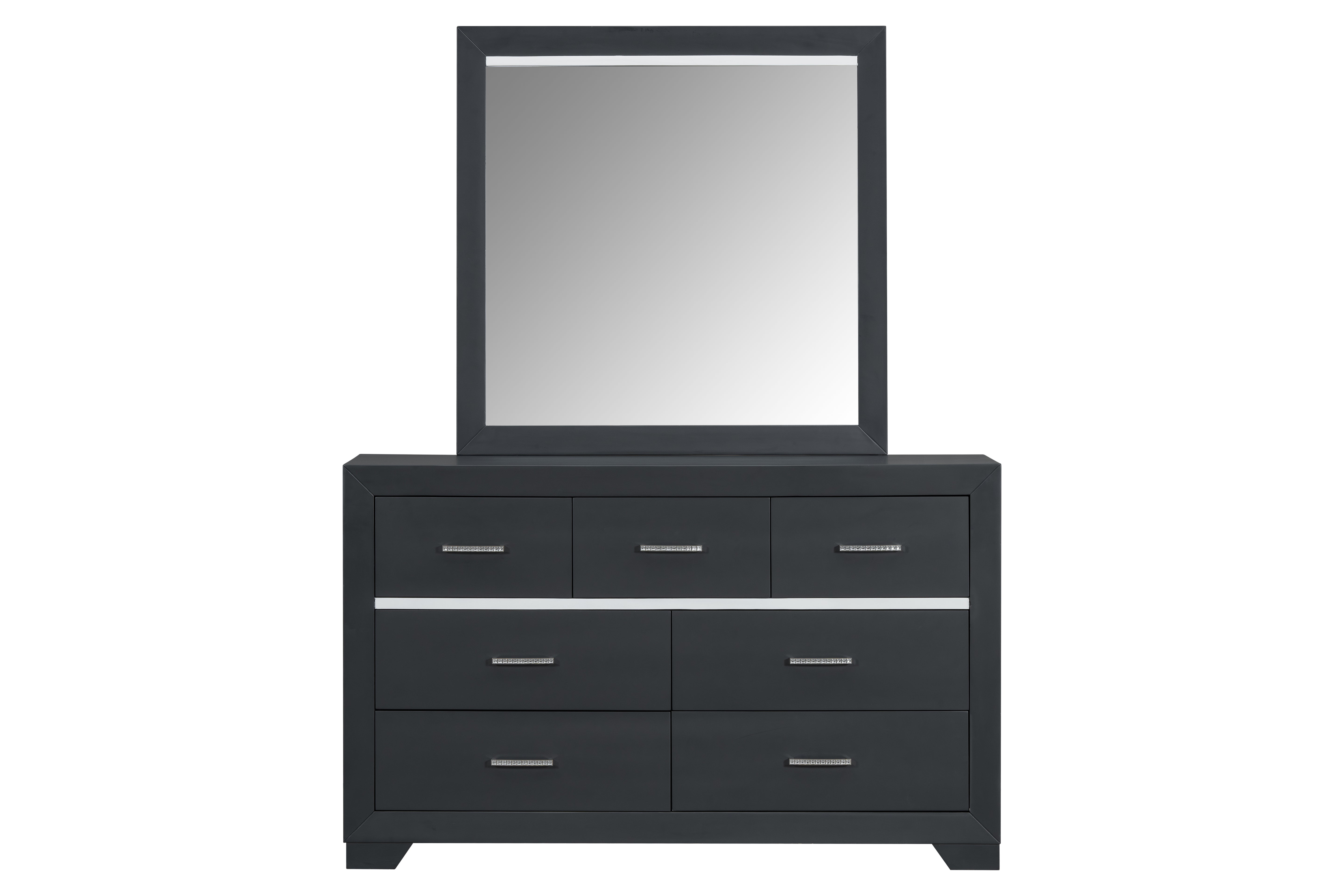 Bring sleek, contemporary style to your primary suite with this modern gray 6-piece bedroom set. The statement canopy bed pairs with a 7-drawer dresser, beveled mirror, and a 2-drawer nightstand to complete the room (chest sold separately). Built with pine wood, MDF, and plywood for everyday durability, the case pieces feature full-extension wooden drawer glides, felt-lined top drawers, and streamlined black hardware for a clean, refined look.