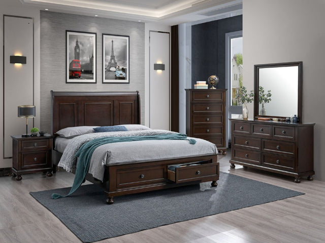 Bring timeless warmth and smart storage to your bedroom with this 6-piece queen storage bedroom set. Finished in a rich tobacco stain, each piece features classic panel detailing, clean lines, and turned bun feet that blend beautifully with traditional, transitional, or modern décor.