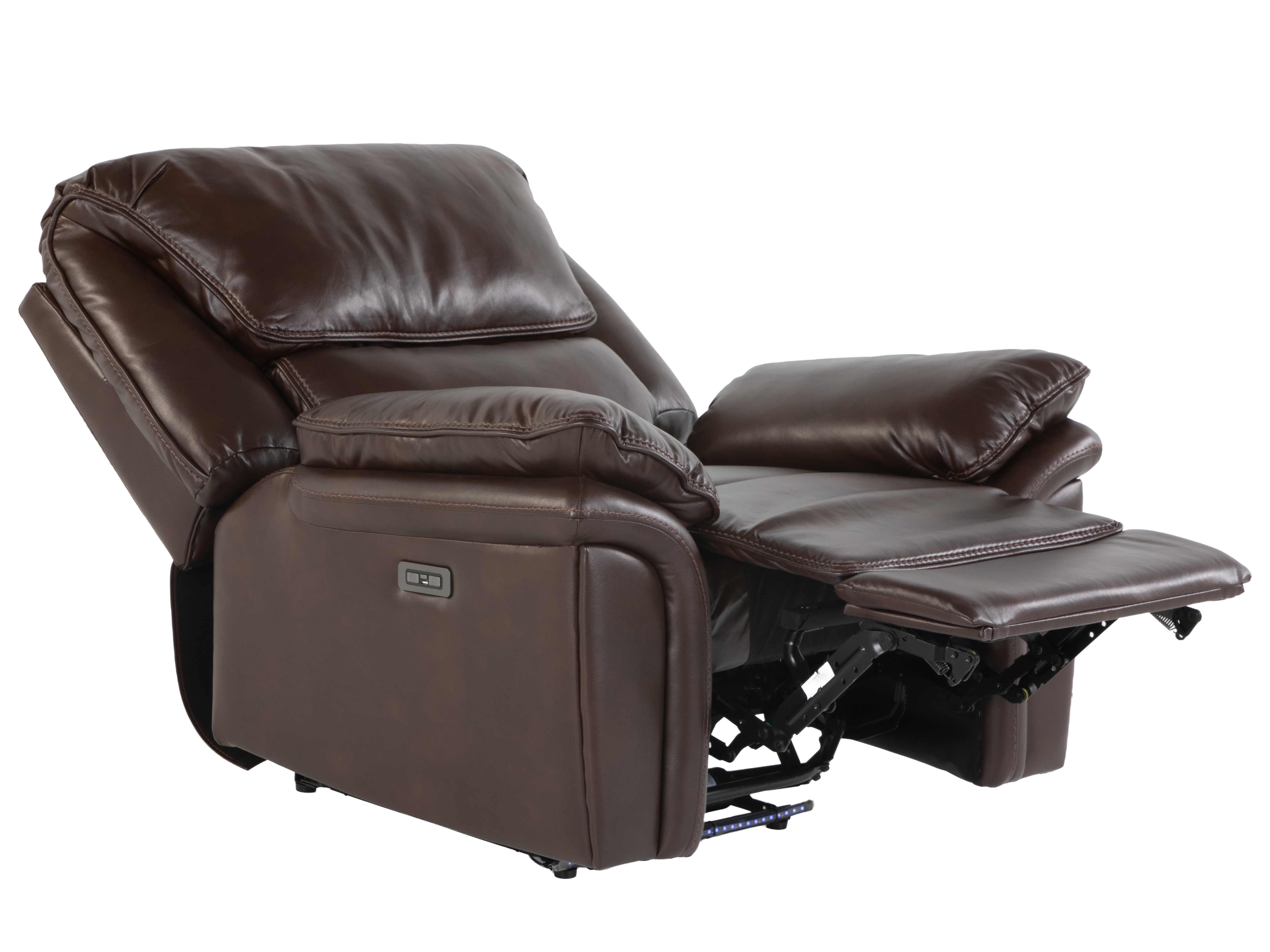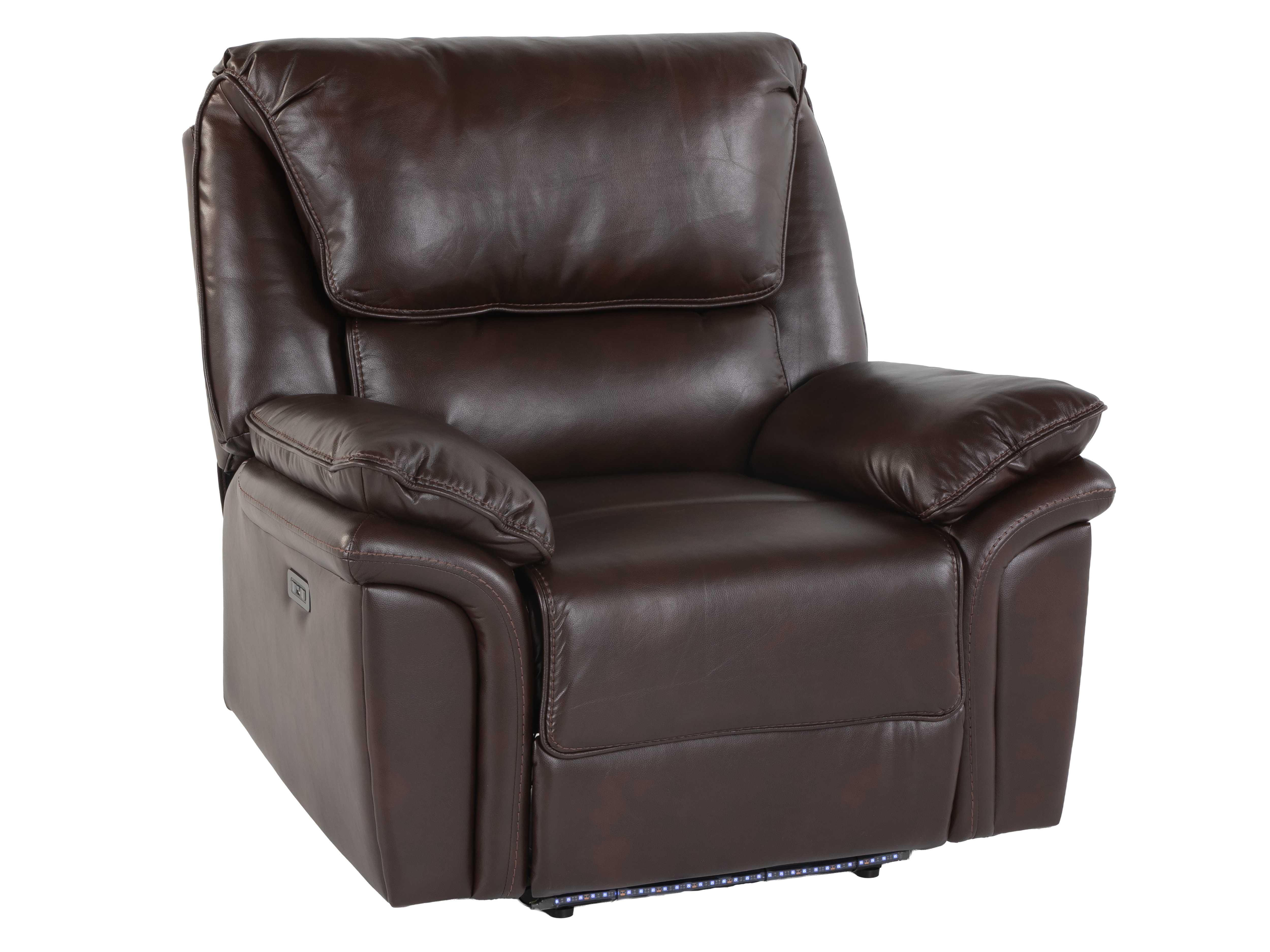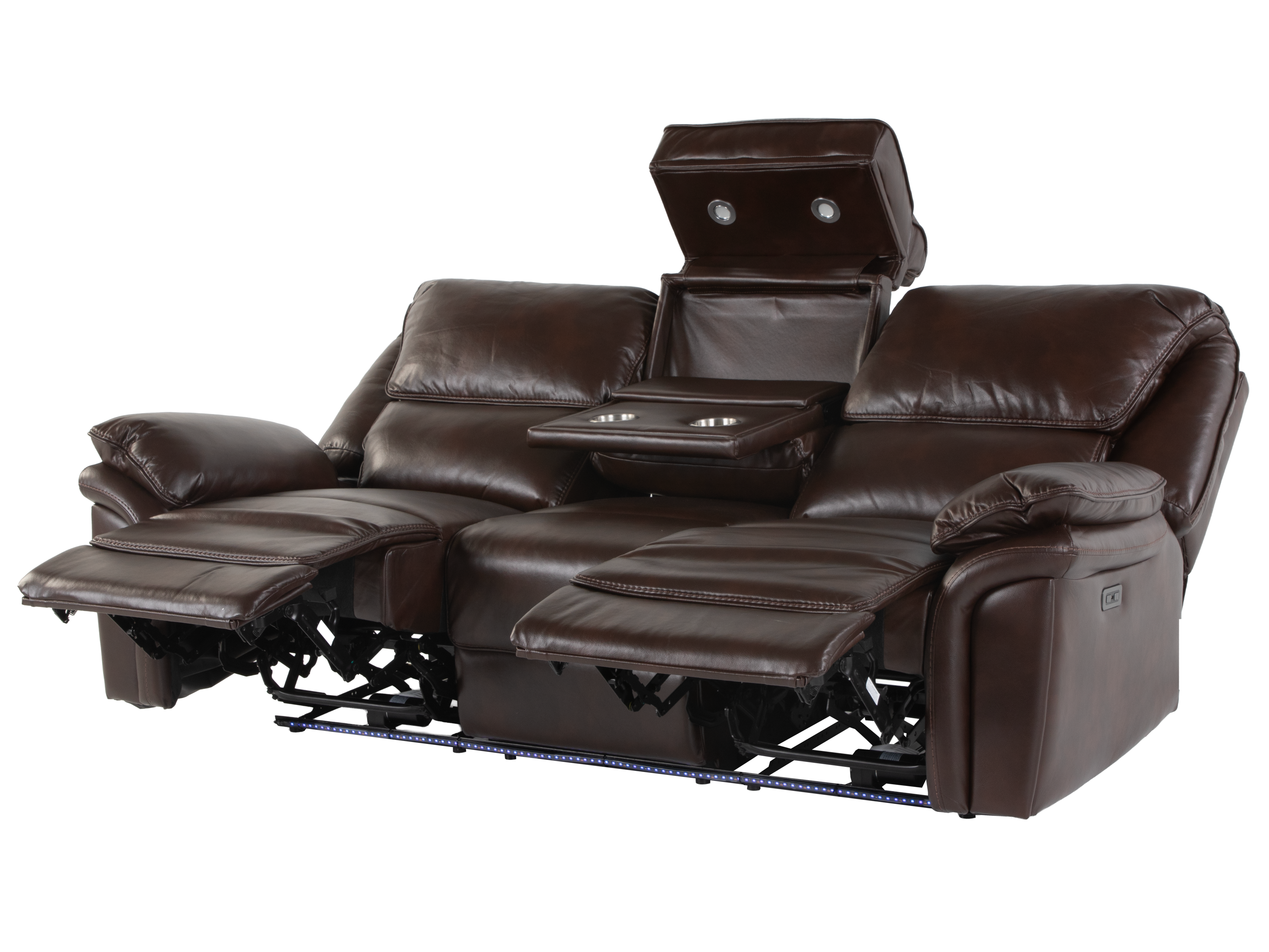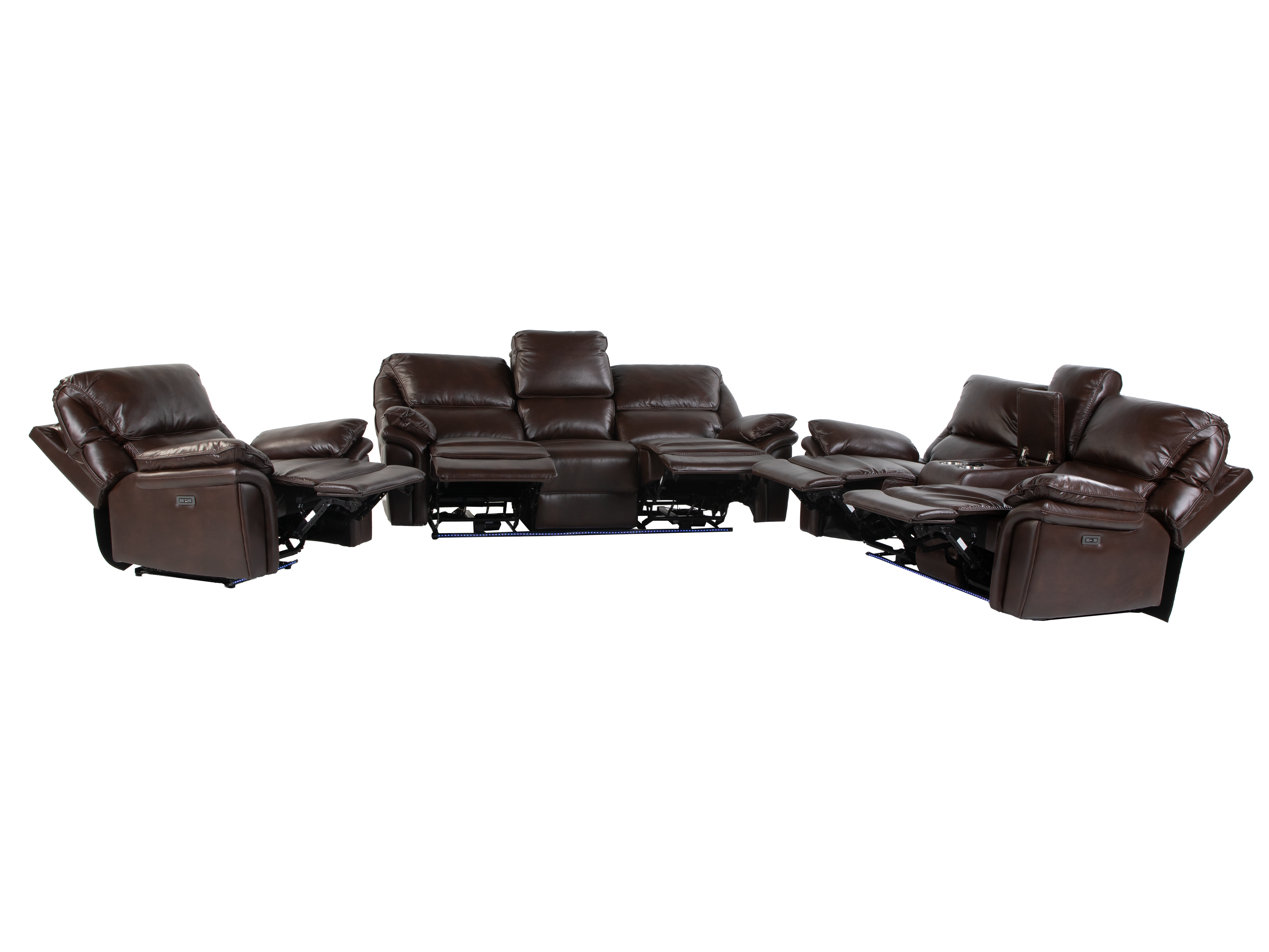 Transform your living room into the ultimate entertainment hub with this Modern Power Reclining Living Room Set. Upholstered in rich, dark brown faux leather, this luxurious 3-piece set includes a reclining sofa, loveseat, and recliner—each designed for maximum comfort and cutting-edge style. The power recline feature allows effortless adjustment at the touch of a button, while integrated blue LED lighting beneath each piece adds a sleek, contemporary glow to your space. The loveseat features a built-in console with cup holders, storage, and USB charging ports for ultimate convenience. Plush cushions, padded armrests, and deep seating ensure every seat is the best seat in the house.