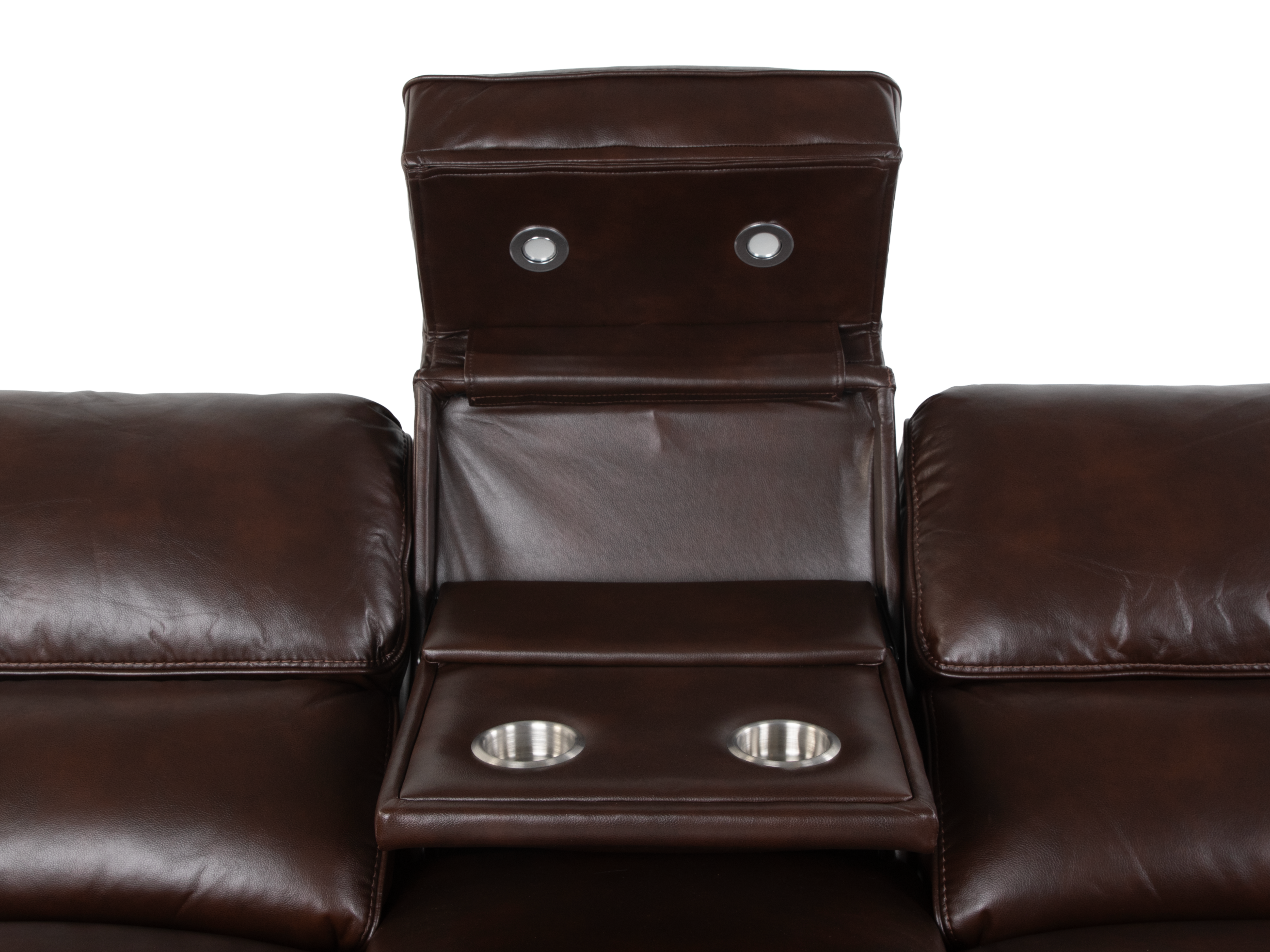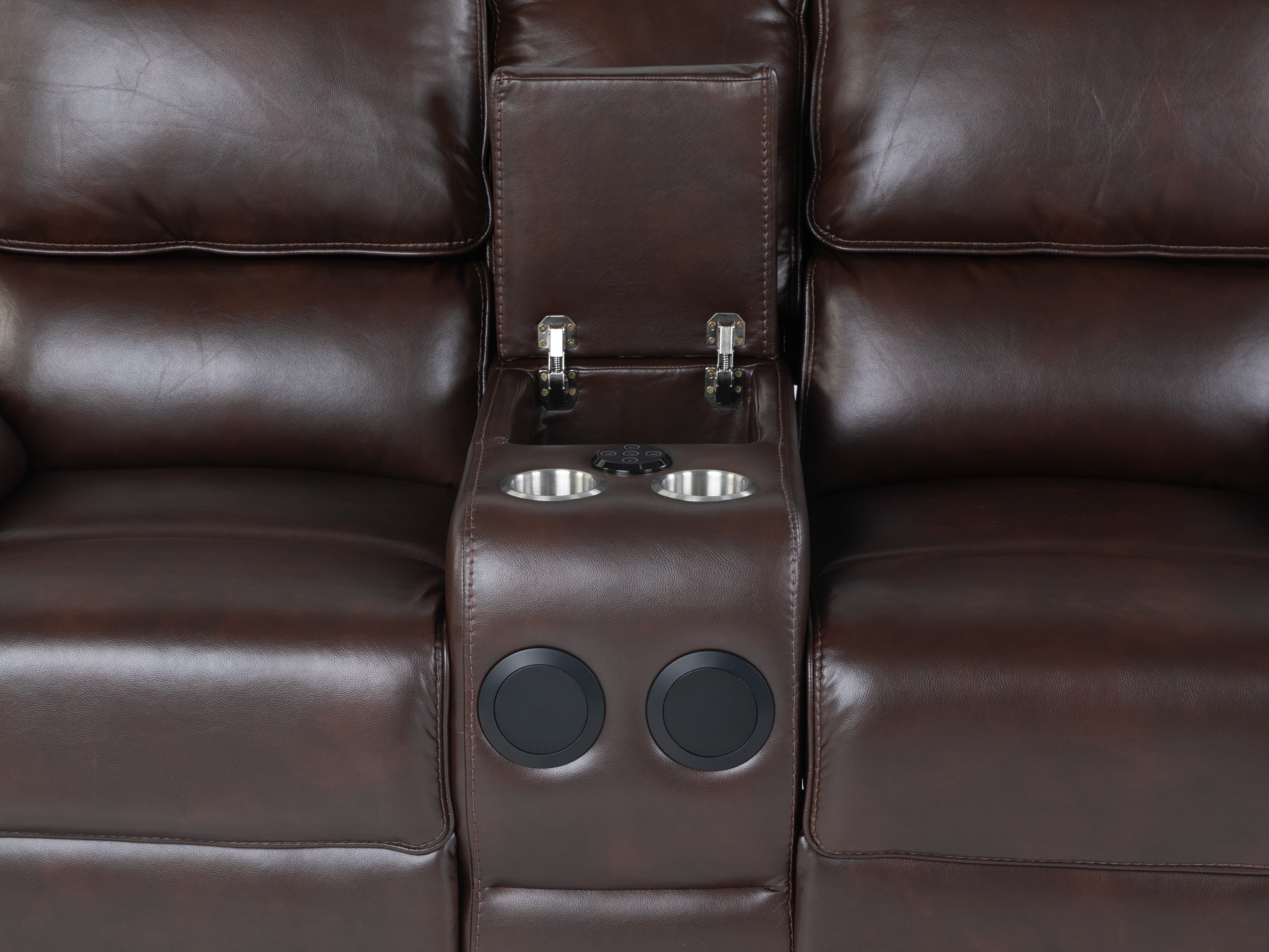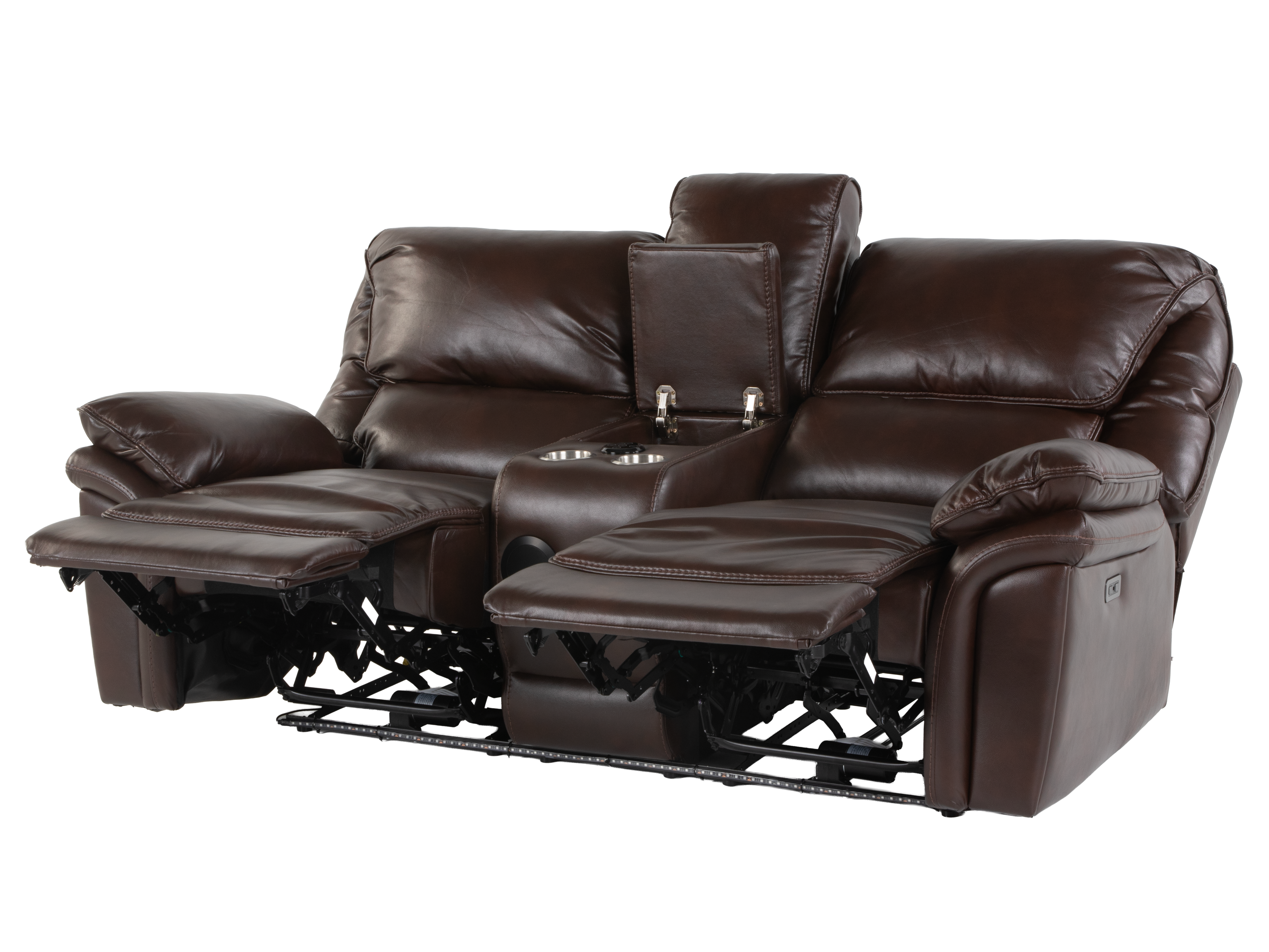 - Loveseat features a center console with cup holders, storage, and USB charging