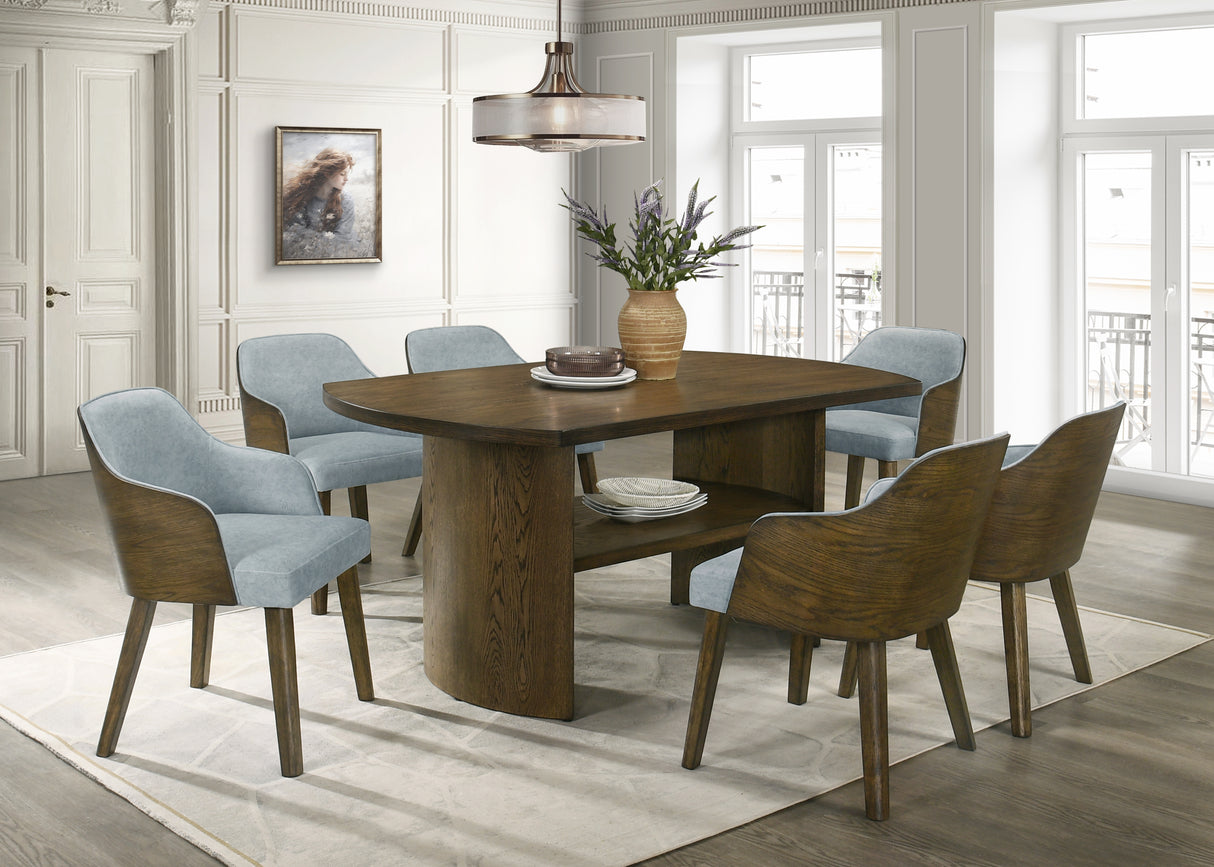 Sculpted curves meet easy comfort. The set pairs a softly radiused 70″ rectangular table with six barrel-back side chairs. A Rustique Brown finish highlights the white-oak grain, while the chairs wrap you in Omega Silver fabric over a molded wood shell and solid wood legs. Built for daily dining, the table uses MDF with white-oak veneer over a sturdy rubberwood base; the chairs are comfortably padded for long meals and game nights.