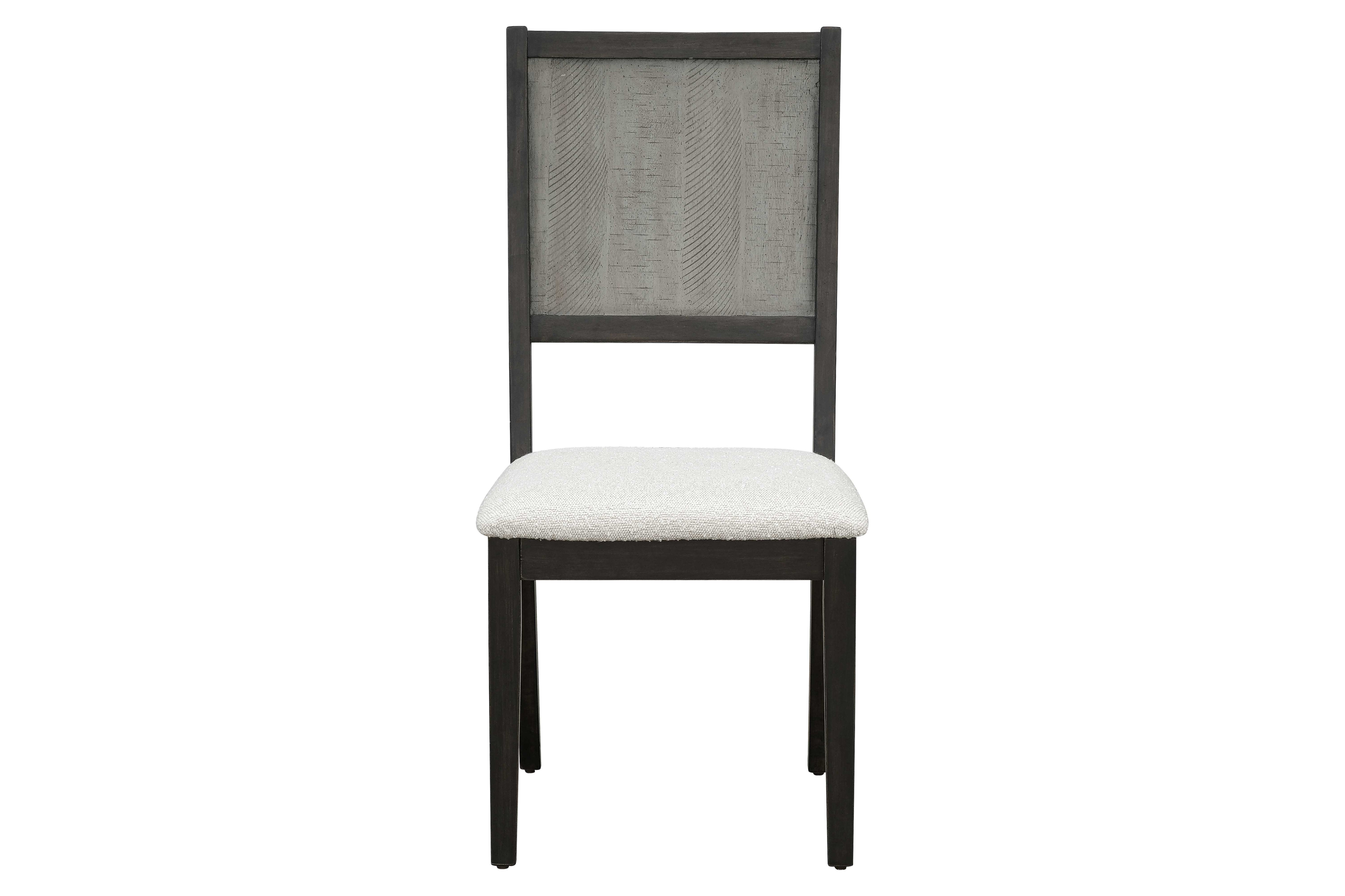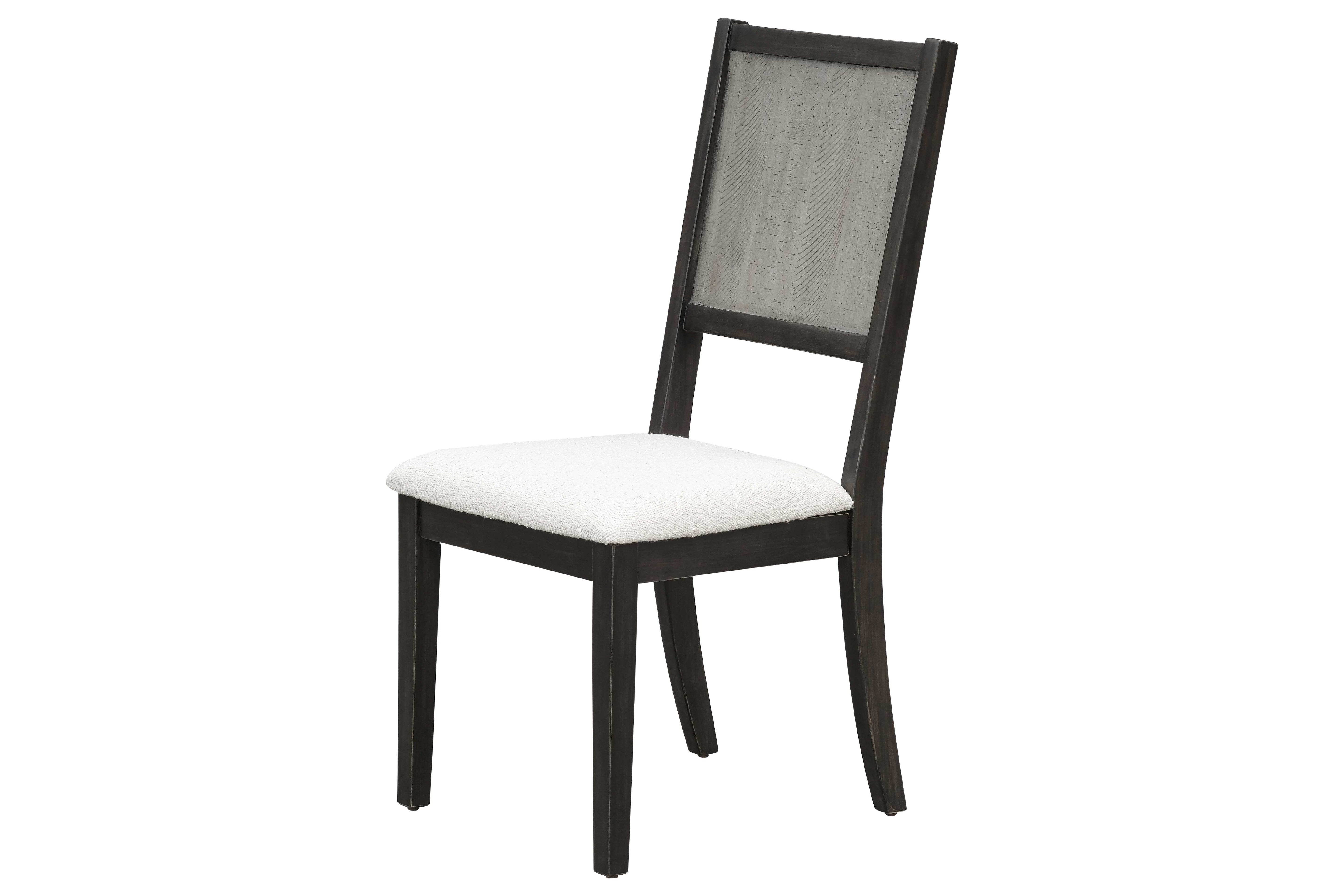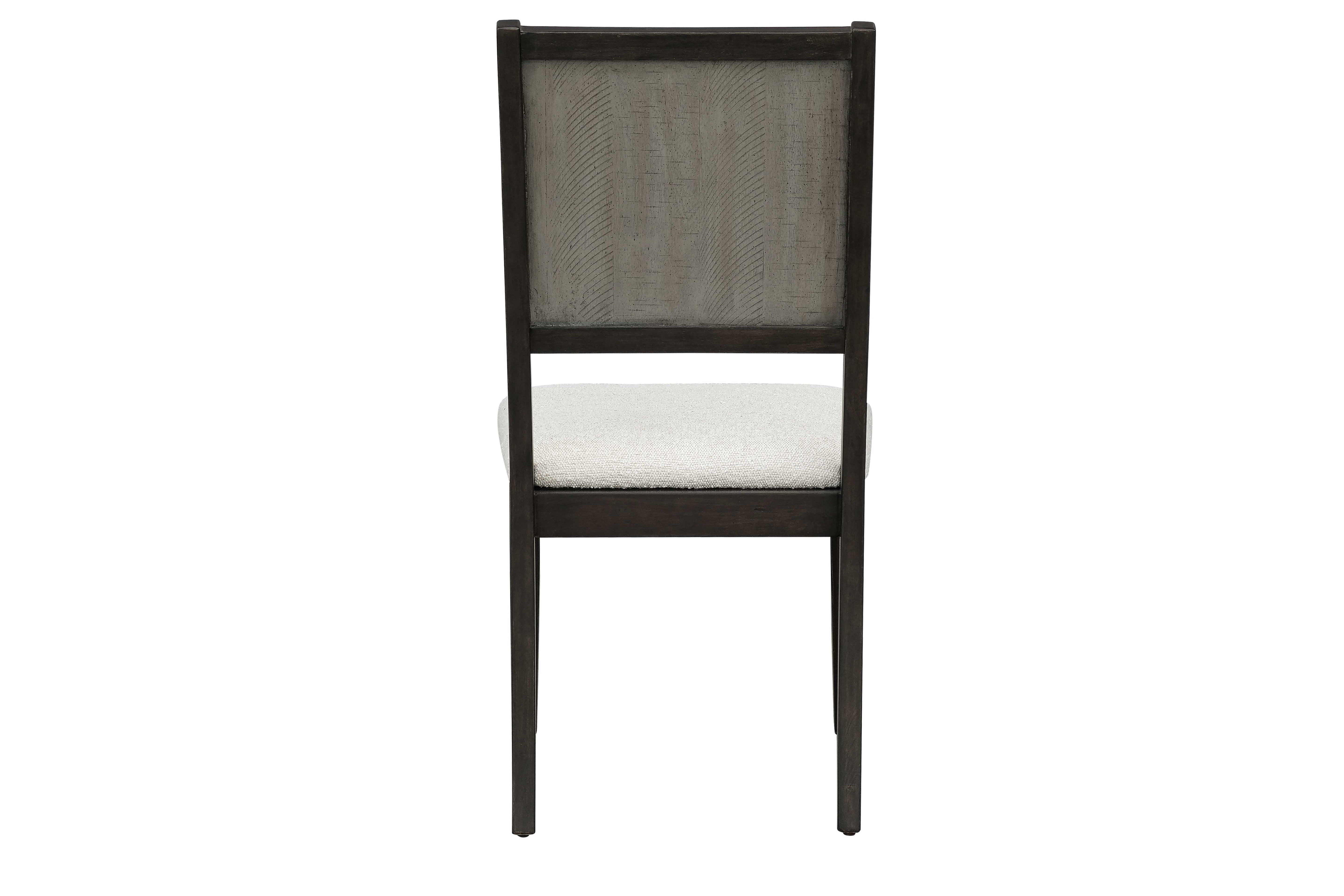 Accompanying the table are six matching chairs that perfectly complement the overall aesthetic. Each chair showcases a dark wooden frame with subtly tapered legs, providing a balanced and elegant silhouette. The chair backs feature a unique textured wood panel in the same distressed finish as the tabletop, adding visual interest and continuity to the set. For added comfort, the seats are generously cushioned and upholstered in a soft, neutral-toned fabric with a fine weave texture that invites you to linger longer at the table.