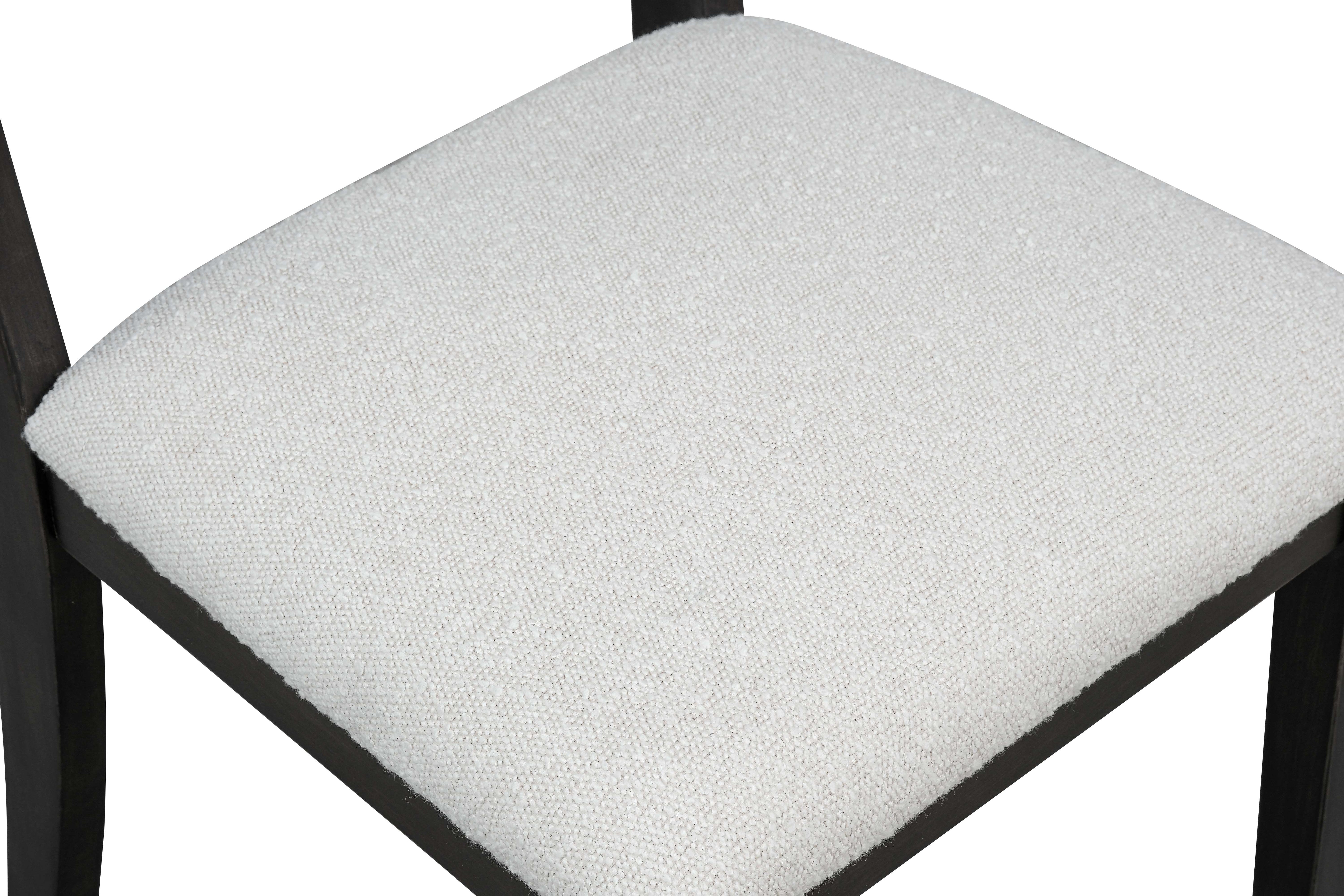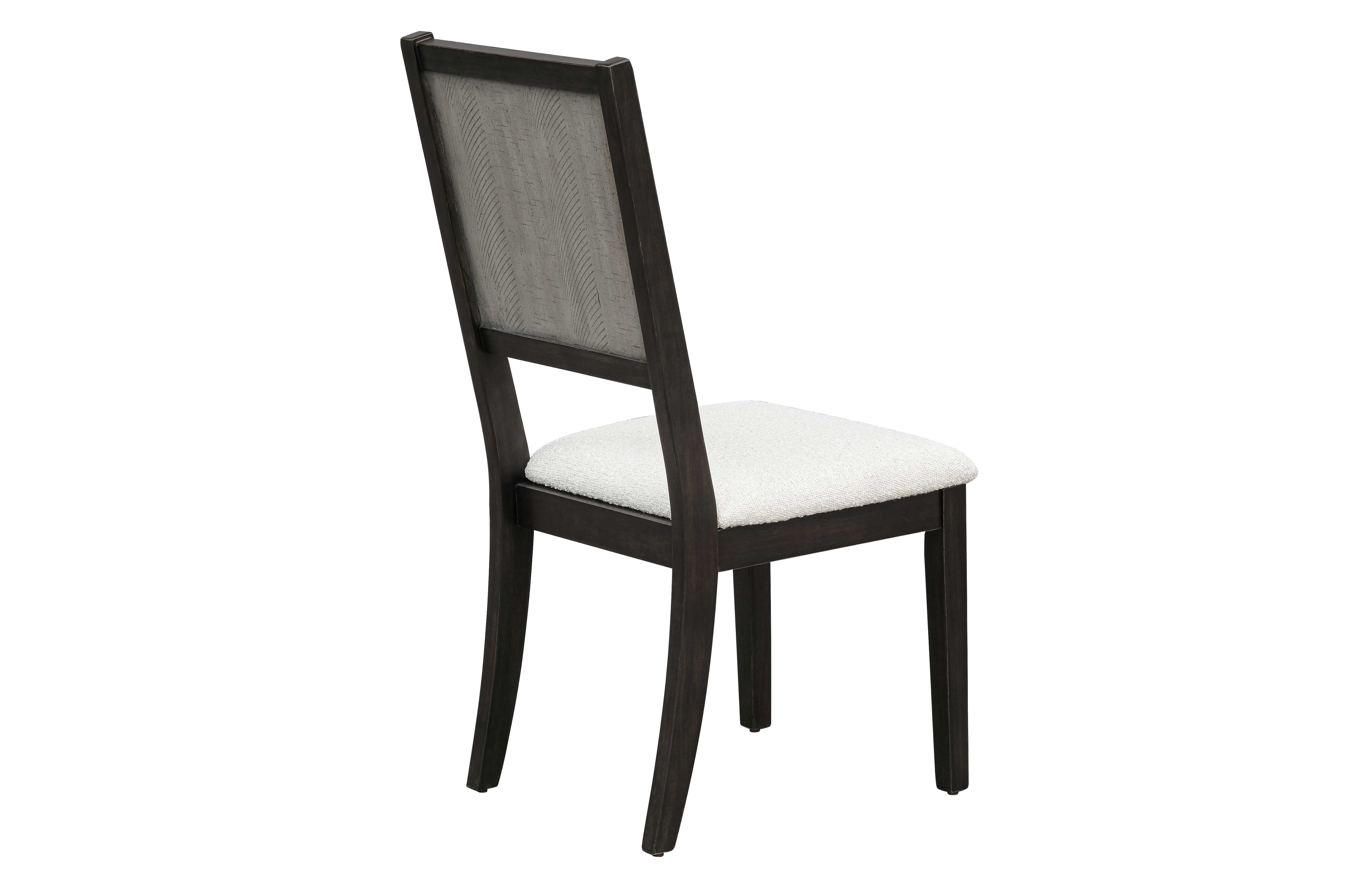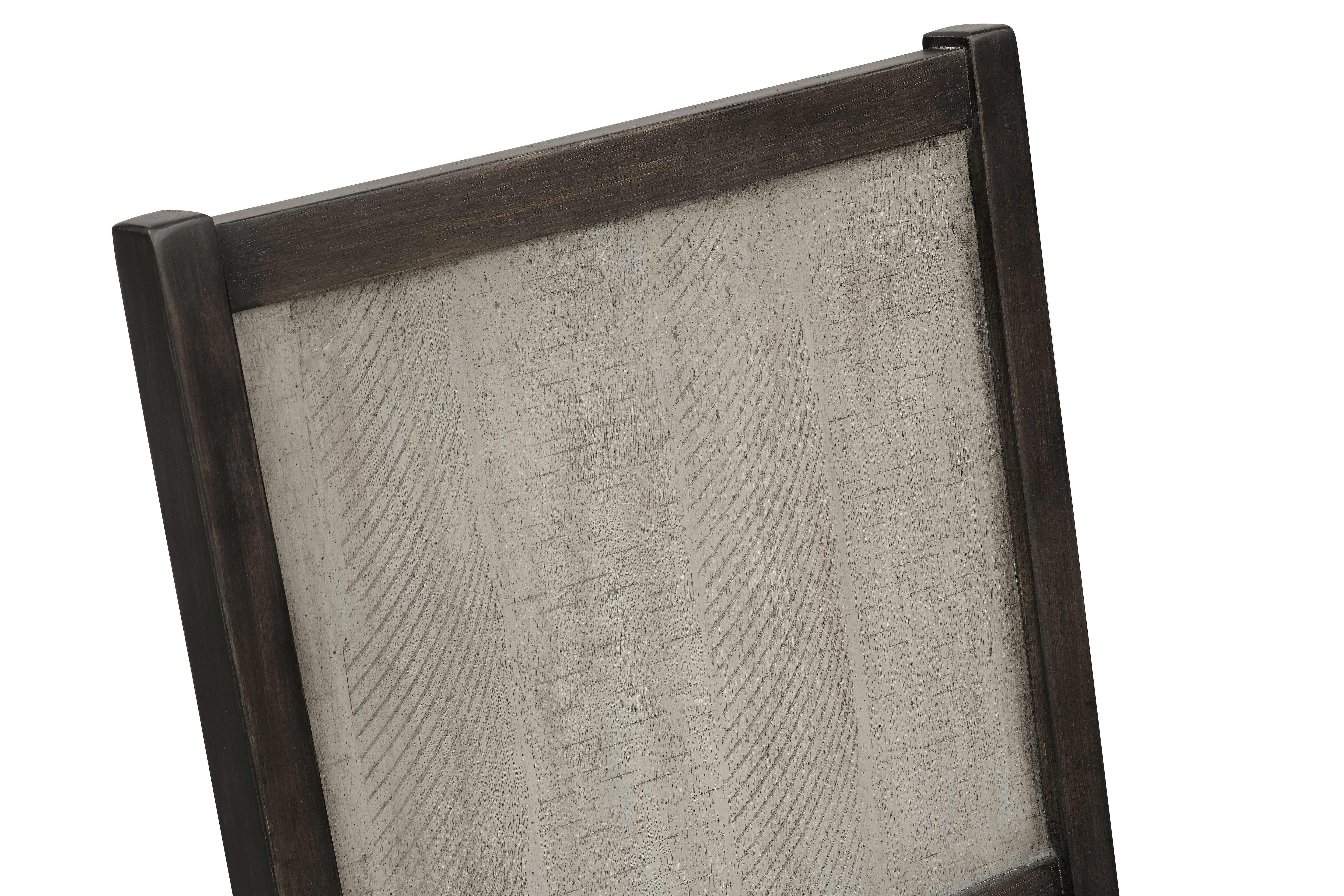 Accompanying the table are six matching chairs that perfectly complement the overall aesthetic. Each chair showcases a dark wooden frame with subtly tapered legs, providing a balanced and elegant silhouette. The chair backs feature a unique textured wood panel in the same distressed finish as the tabletop, adding visual interest and continuity to the set. For added comfort, the seats are generously cushioned and upholstered in a soft, neutral-toned fabric with a fine weave texture that invites you to linger longer at the table.