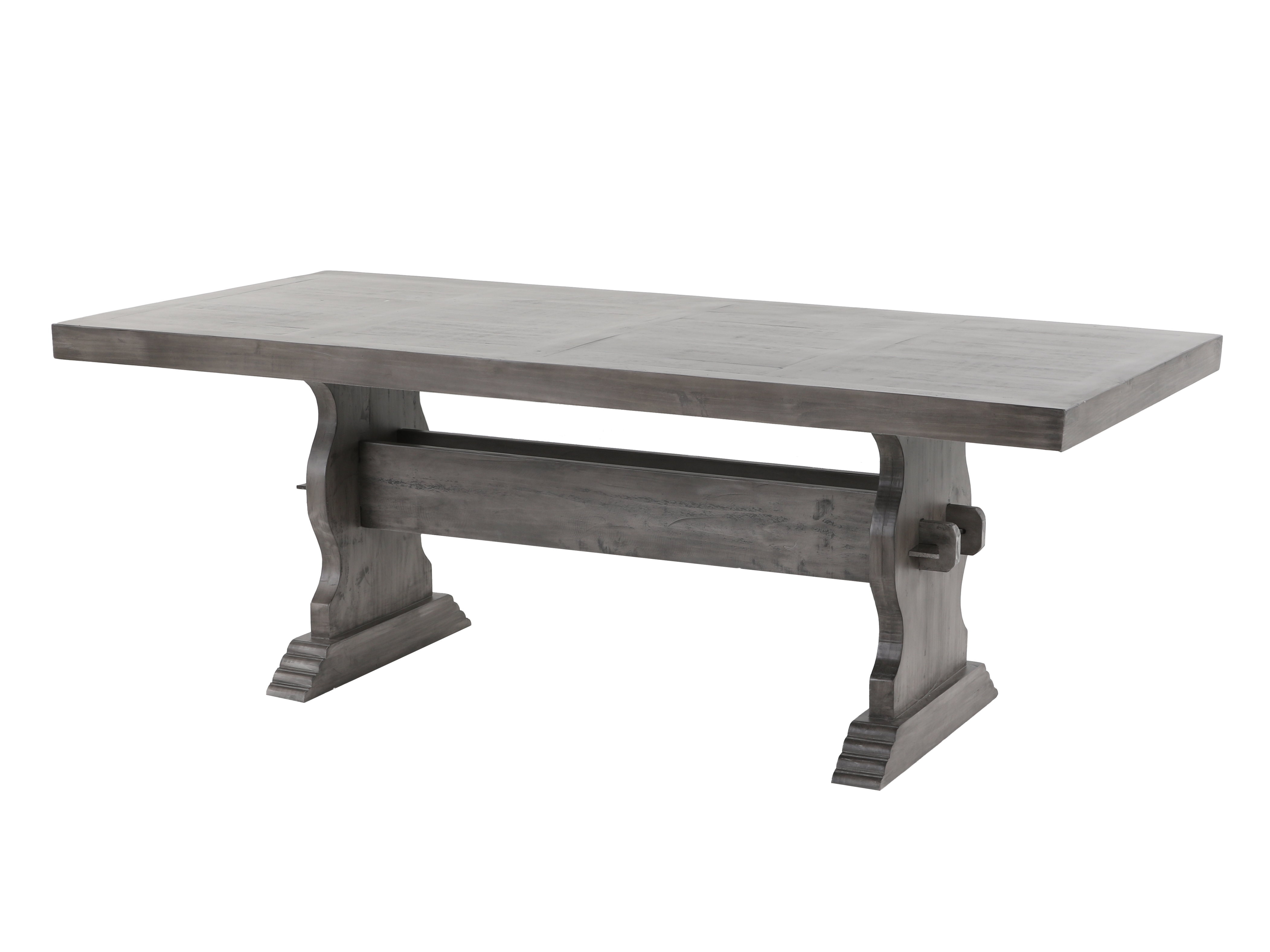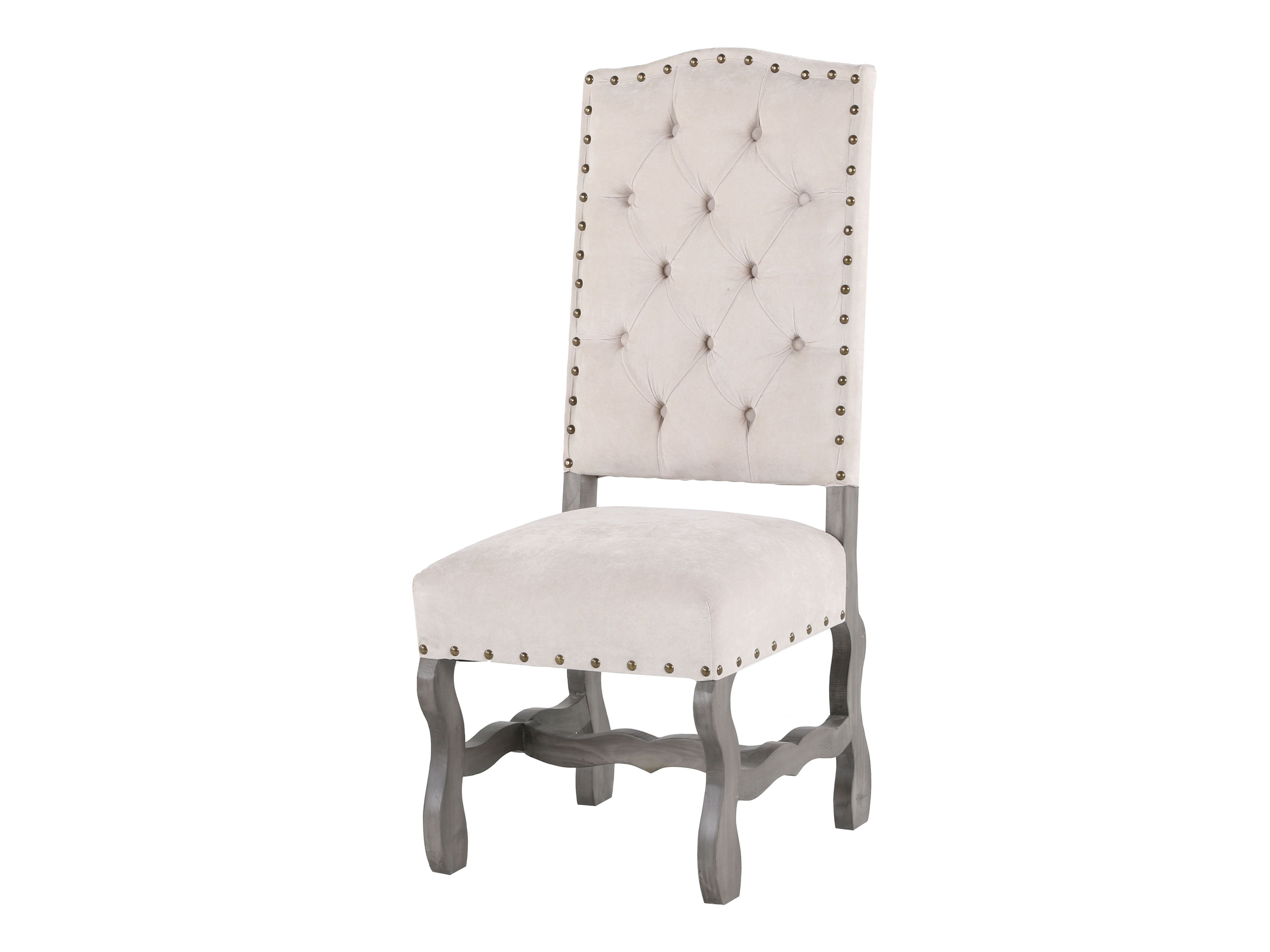 A classic-meets-modern look featuring a gray wood trestle table and ivory upholstered, diamond-tufted chairs with nailhead trim.