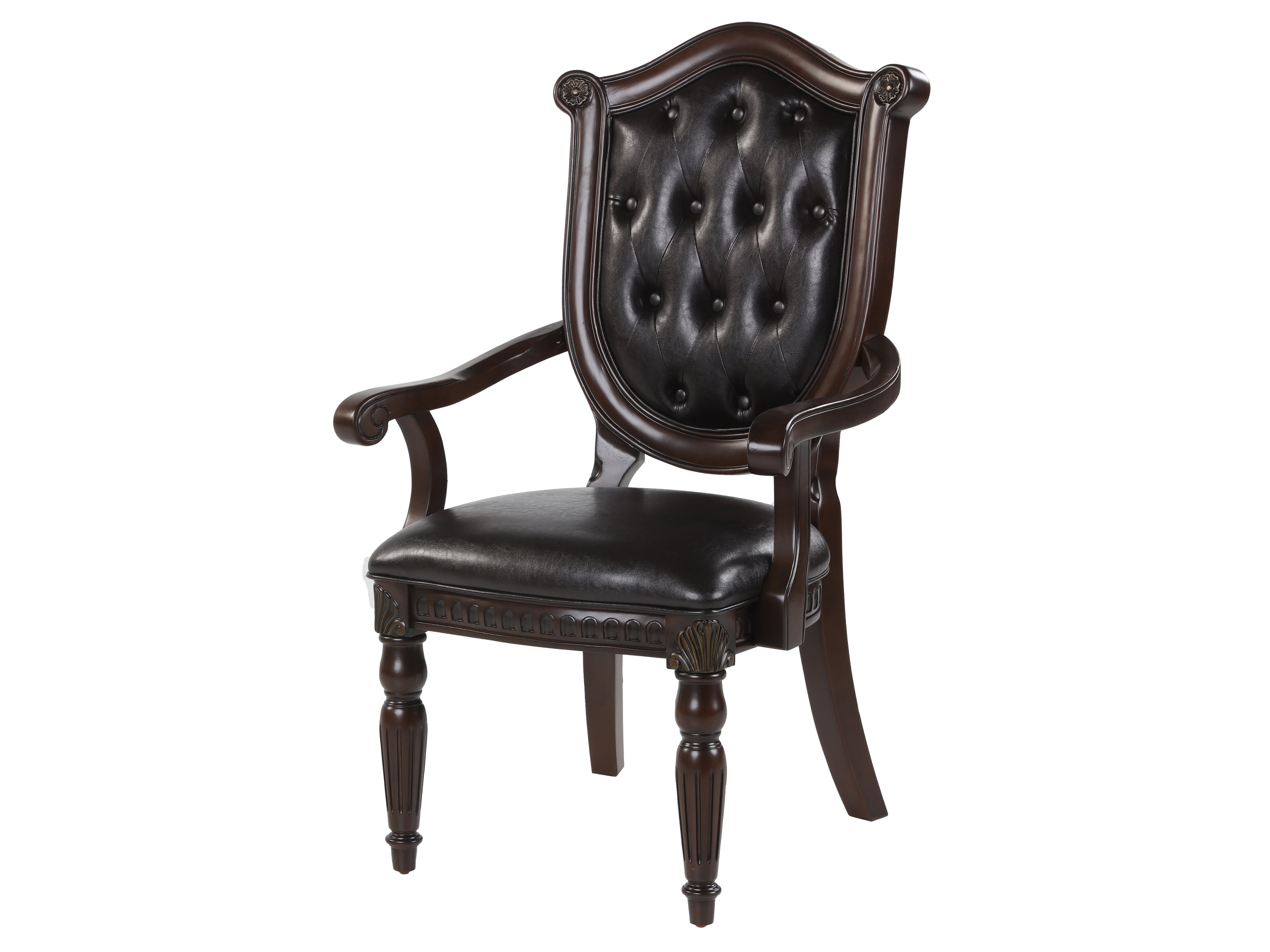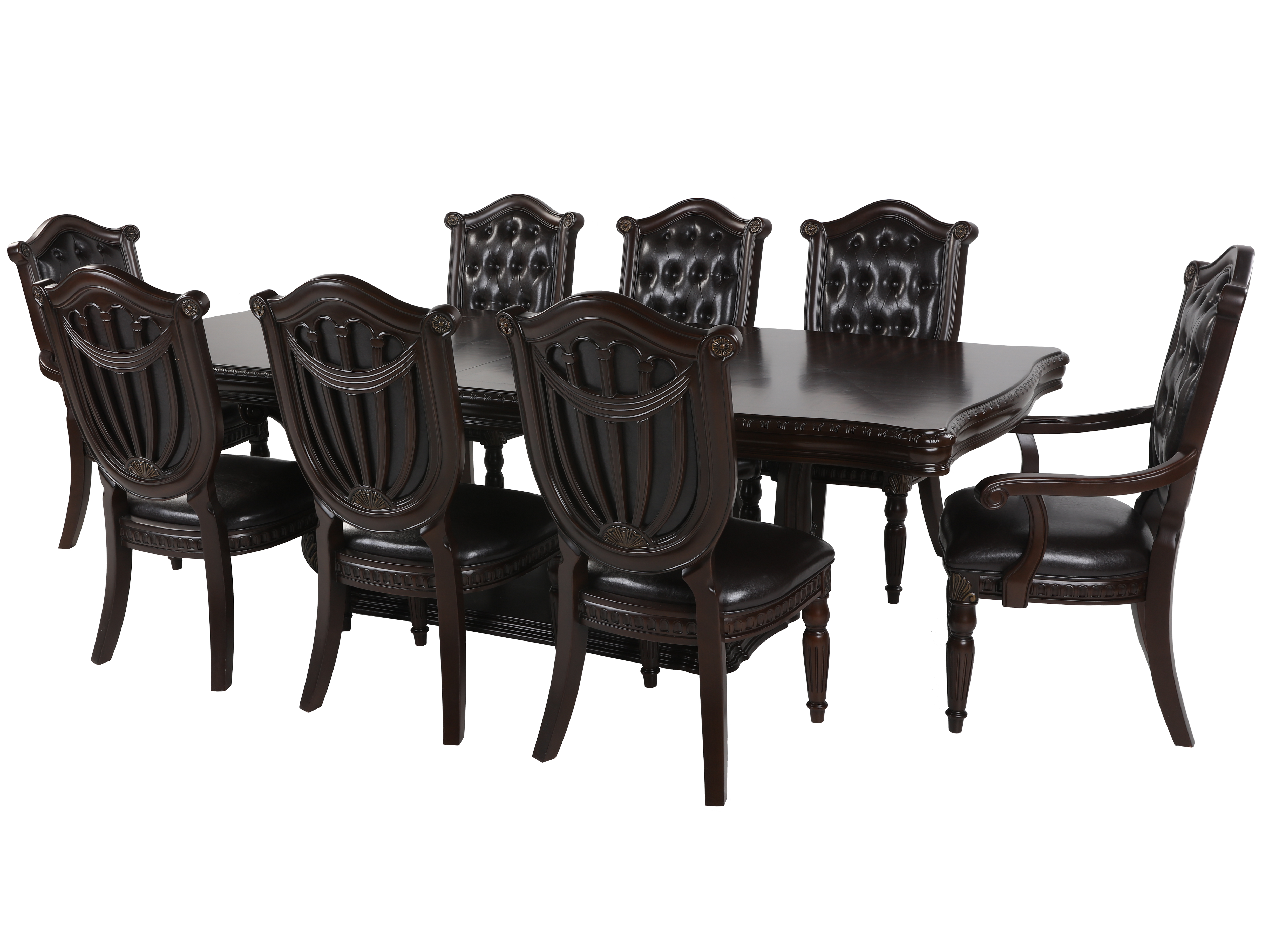 The upholstered side and arm chairs echo classic European styling with shield-shaped backs, deep button tufting, and smooth faux-leather seating. Turned front legs and carved details tie the whole collection together, giving your dining space a luxurious, heirloom look.