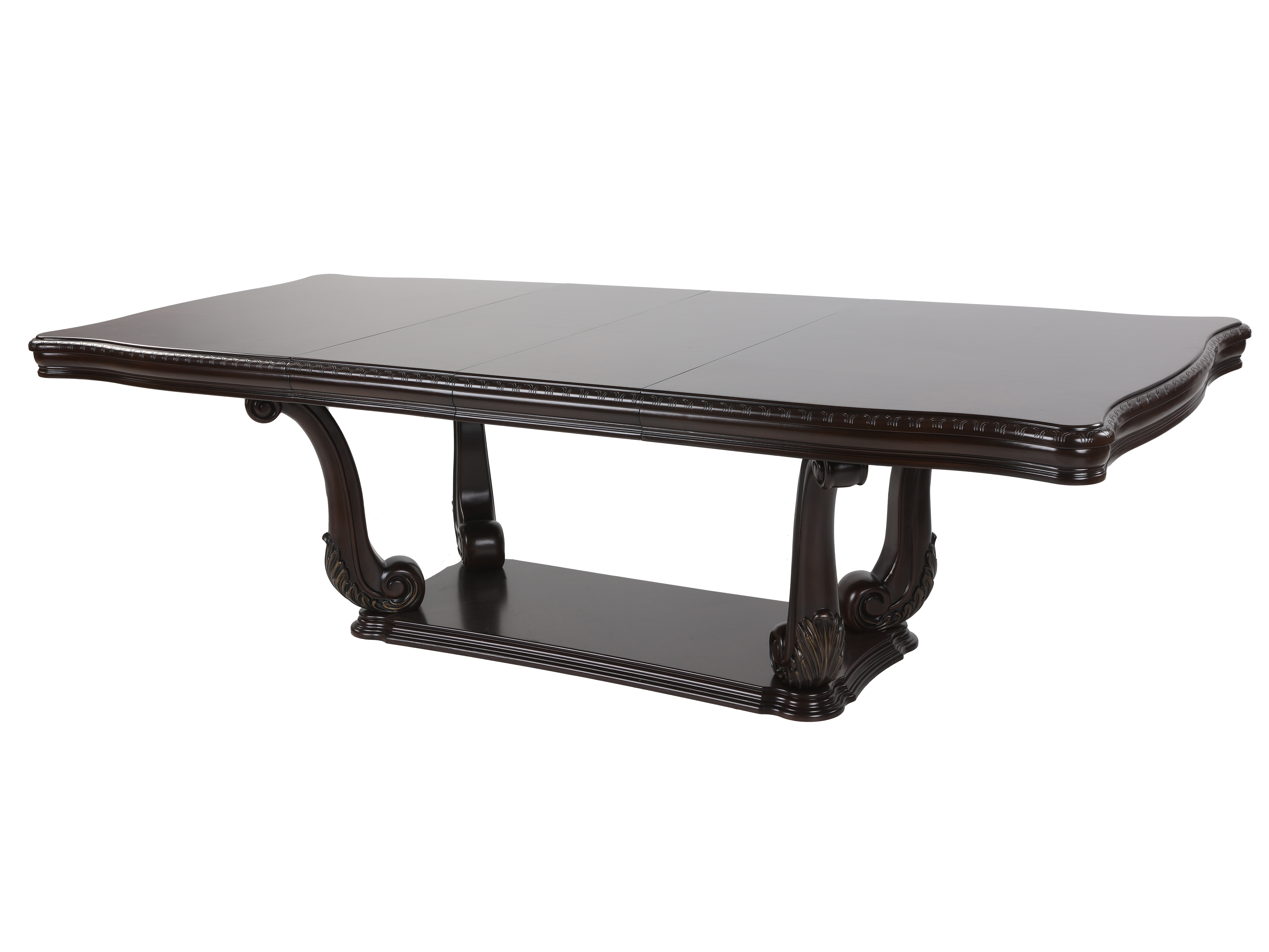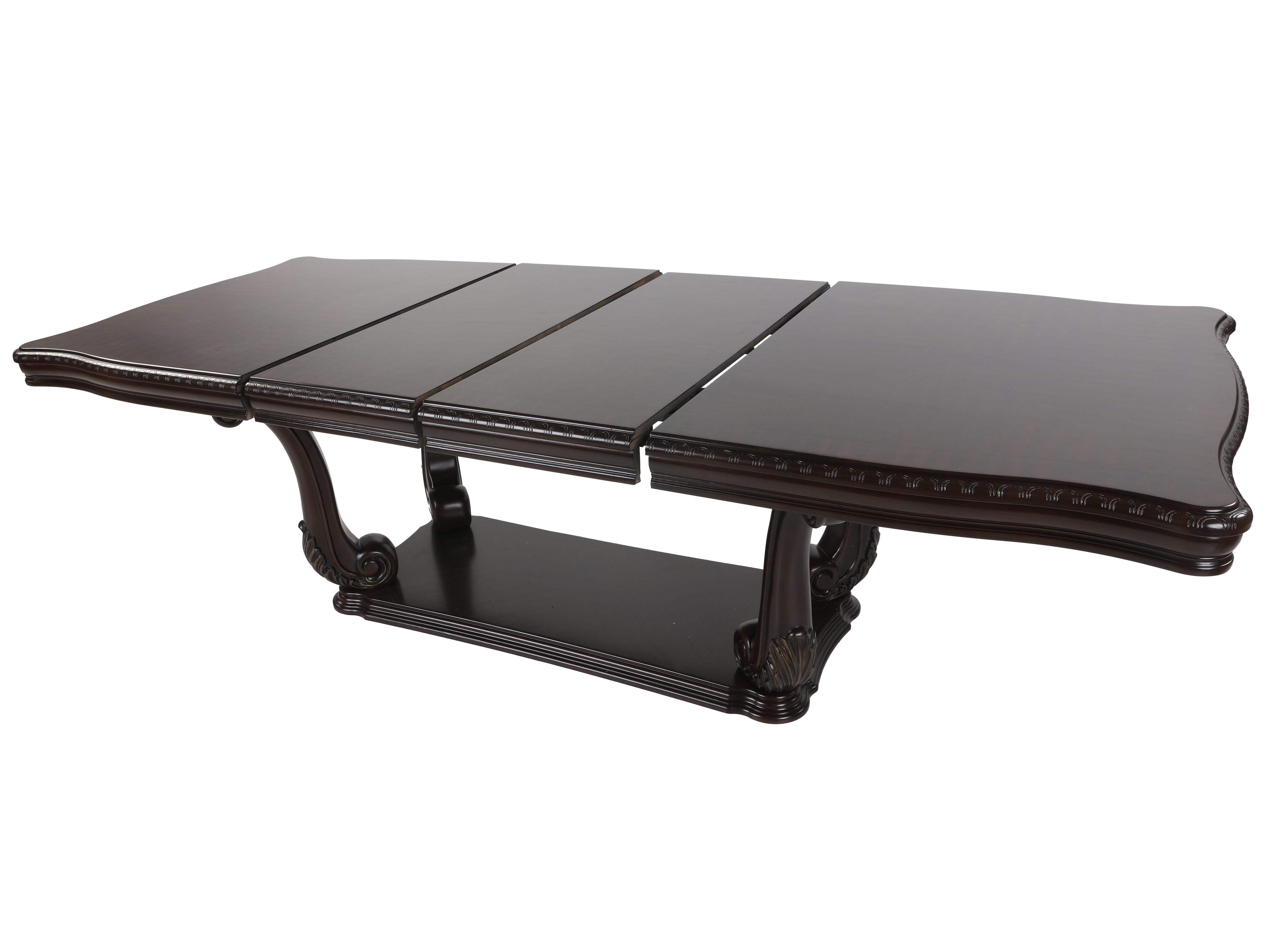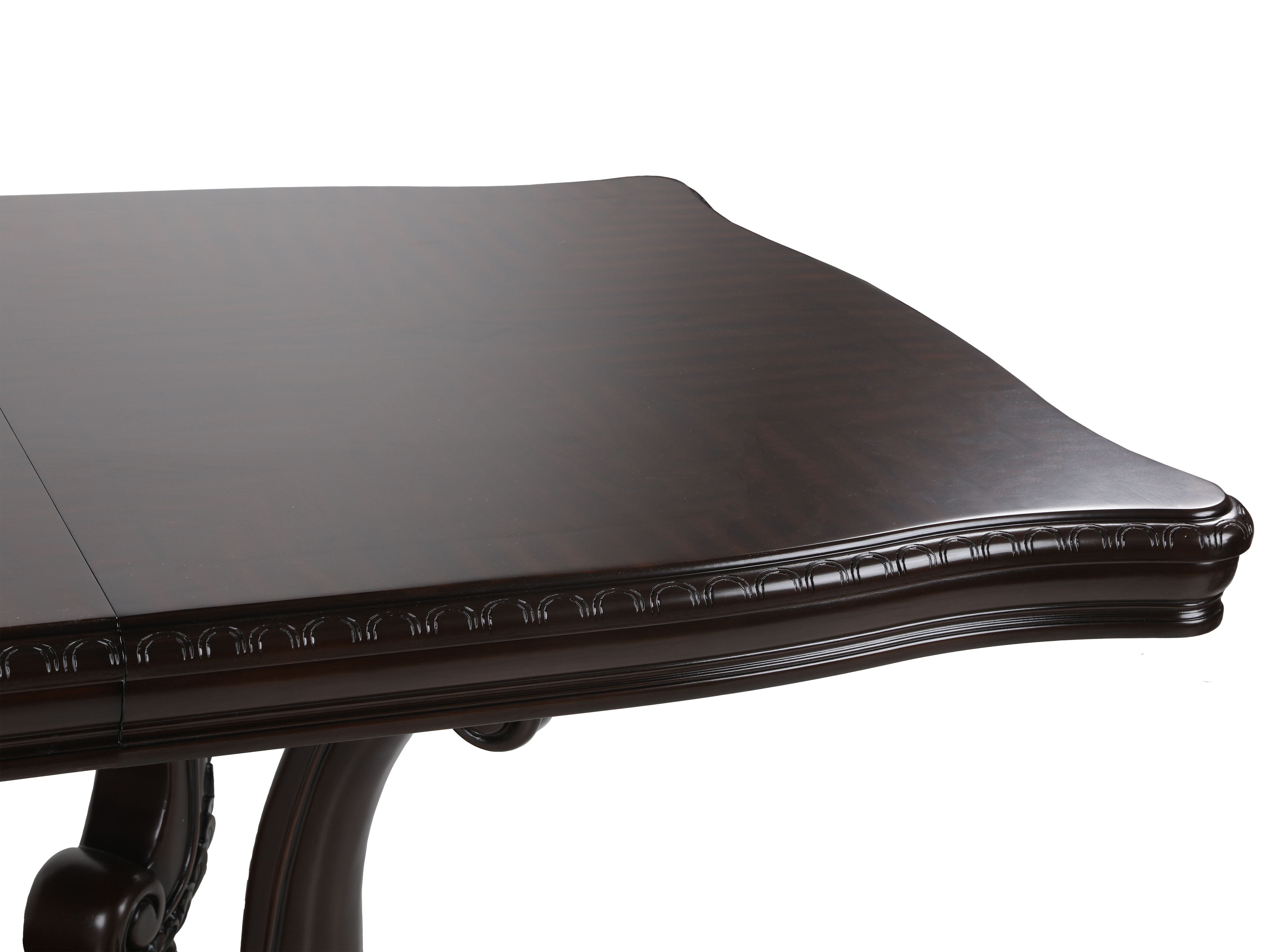 Create a dining room that feels rich, warm, and inviting with this dark cherry formal dining set. The rectangular pedestal table features a beautifully patterned top, shaped edges, and a sculpted trestle base with scroll and shell carvings. Two 18" extension leaves let you expand the table from an everyday 72" length to a grand 108" surface, perfect for holidays and special occasions.